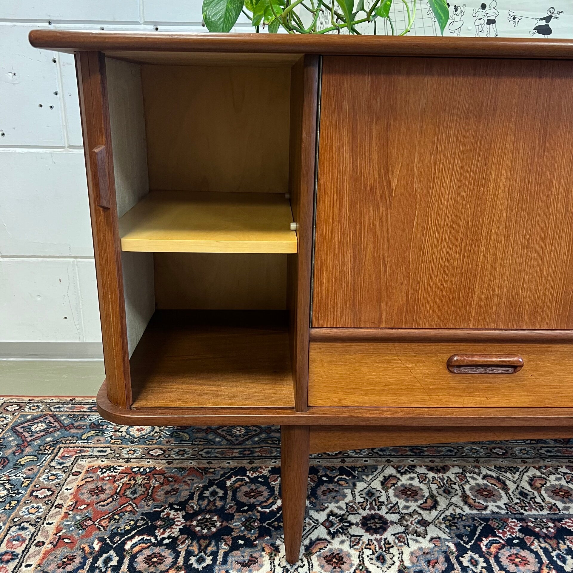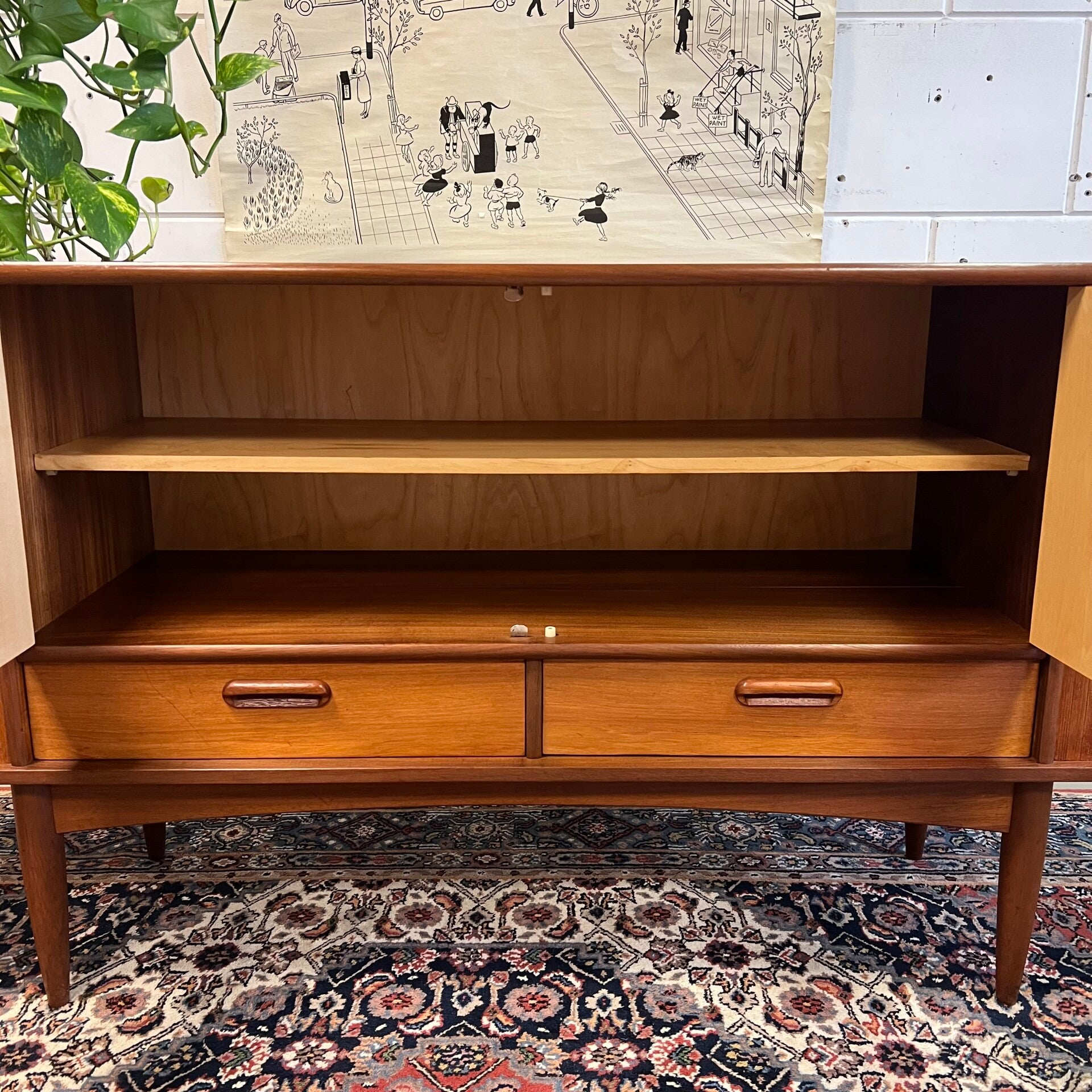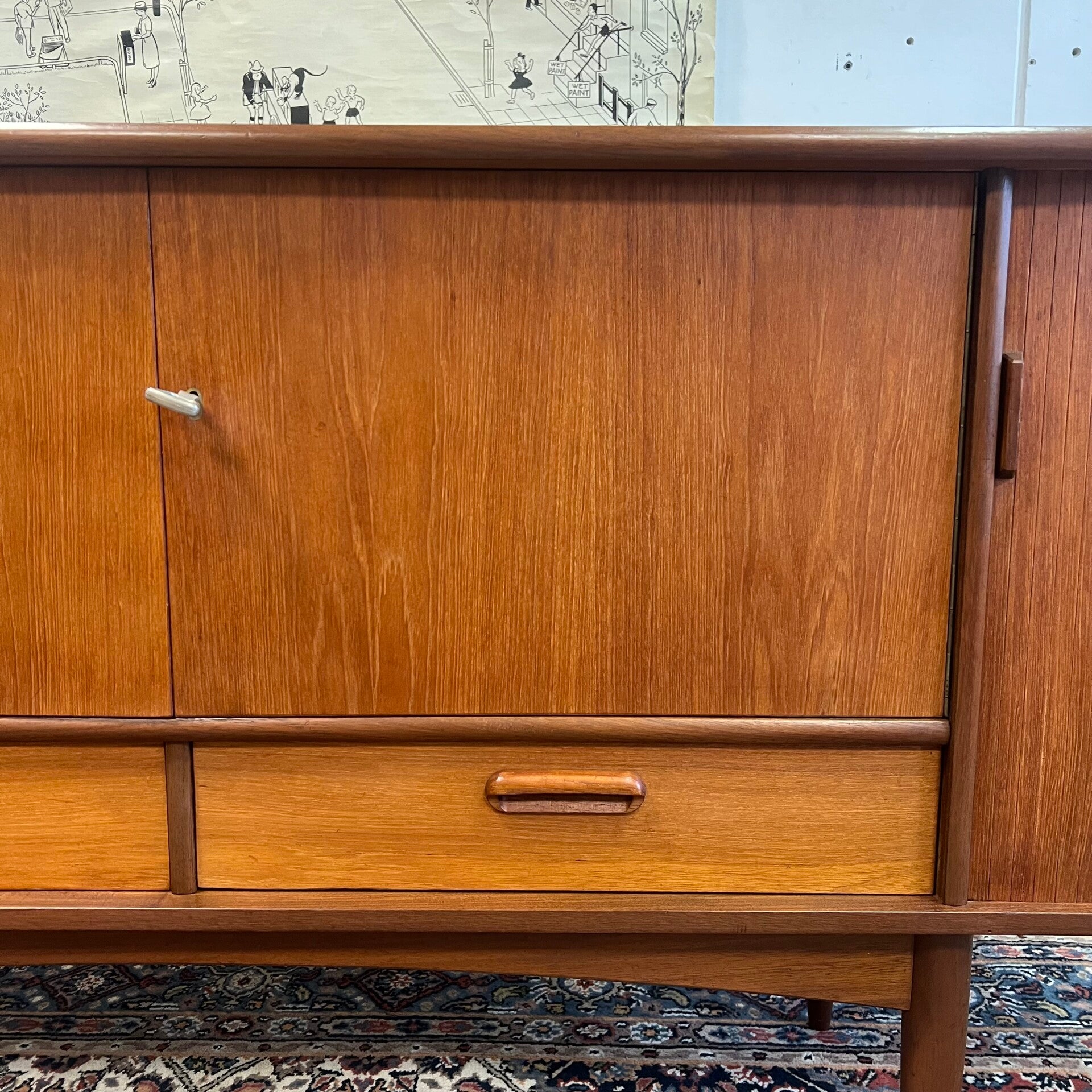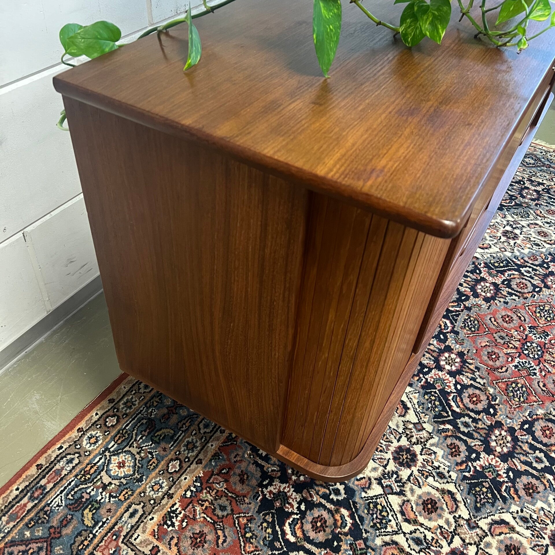 Uitgevoerd in teak (fineer) met slanke conische poten, mooi gevormde handgrepen en tambour roldeuren.