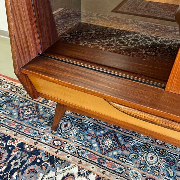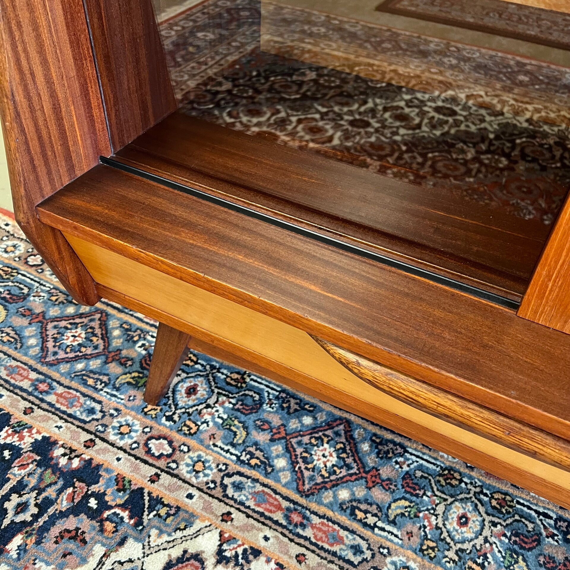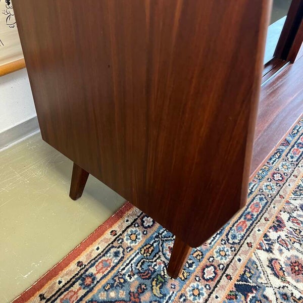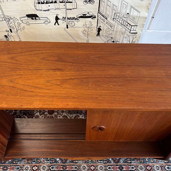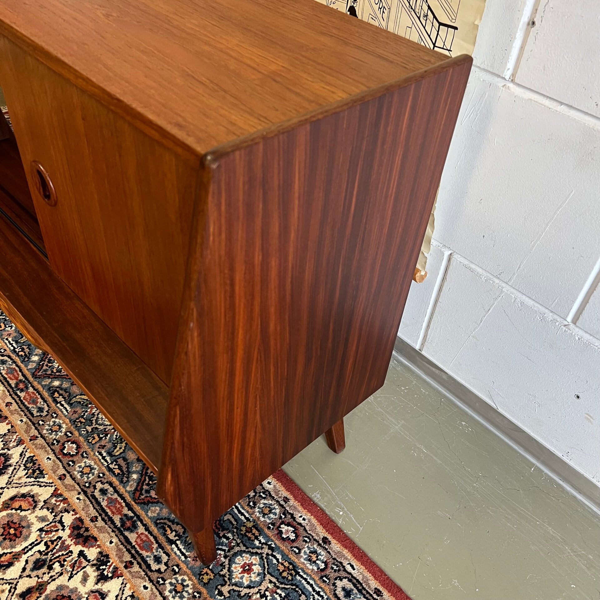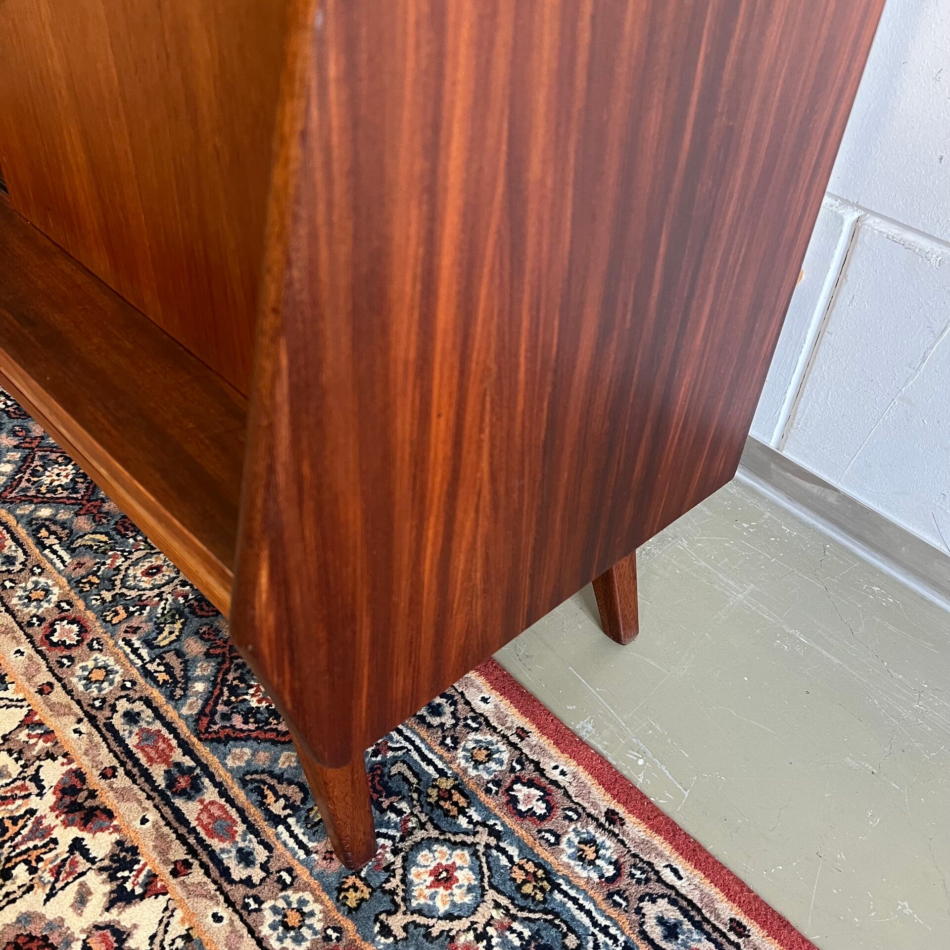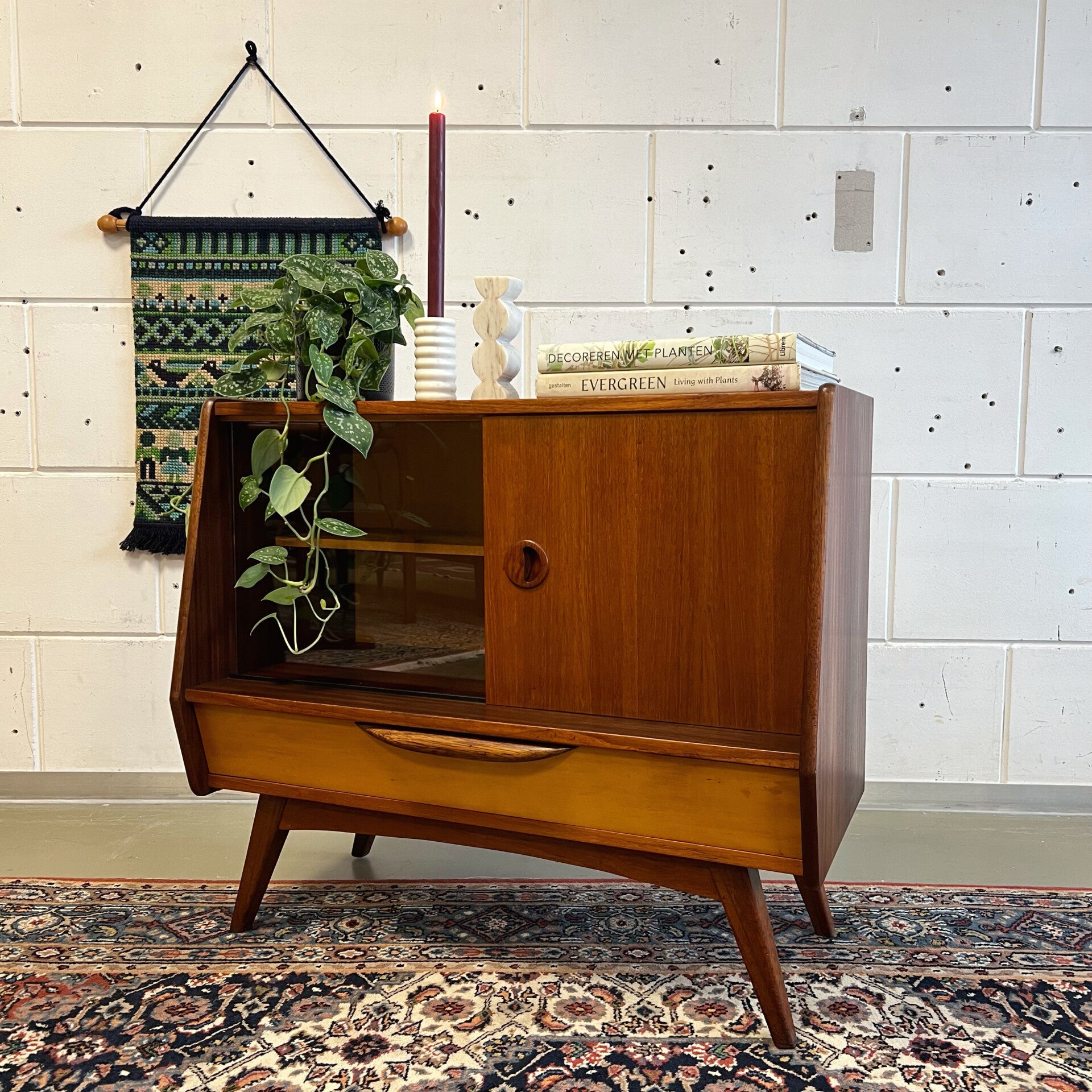 Mooi vintage (TV/audio) kastje, uitgevoerd in teak (fineer) met lichte lade en slanke schuine pootjes.