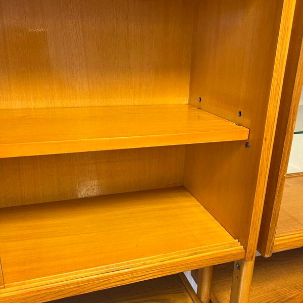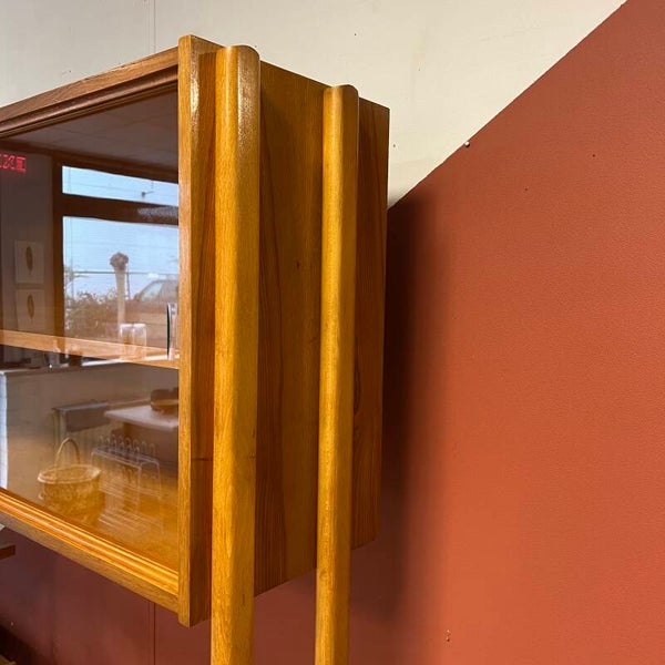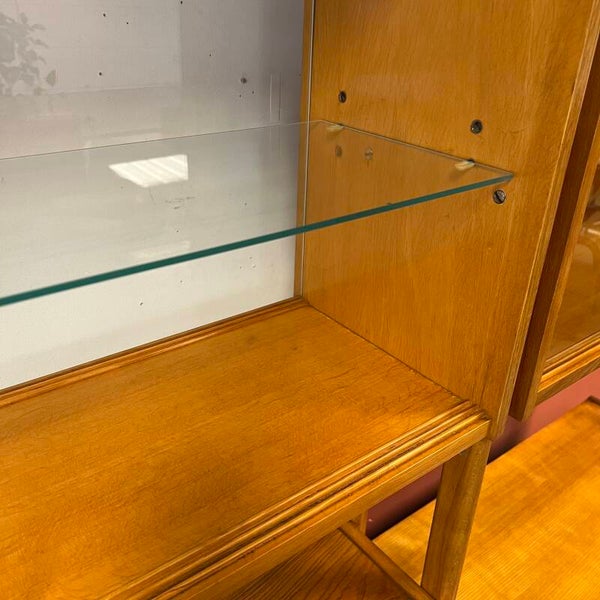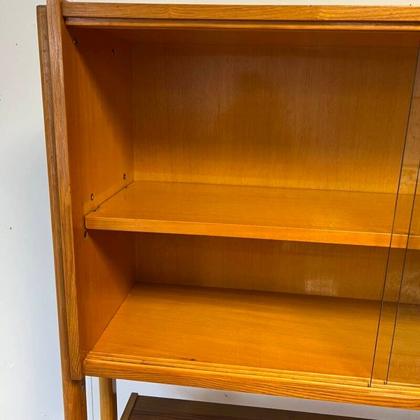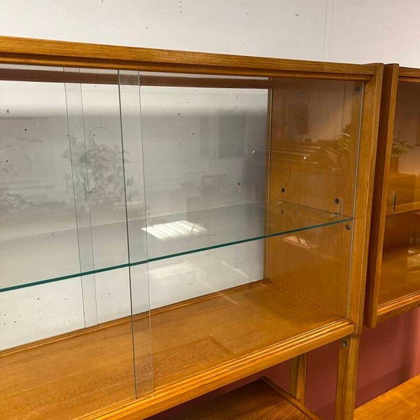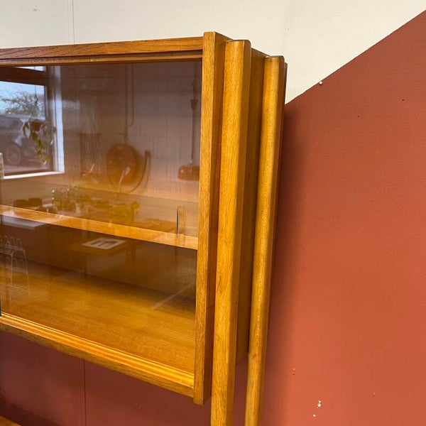 Vitrinekast met glazen schuifruitjes en uitneembare houten plank.