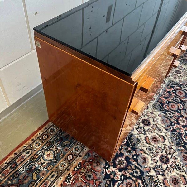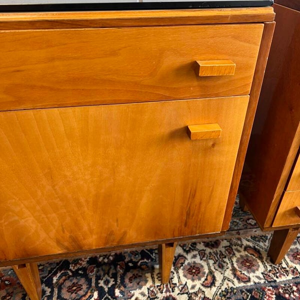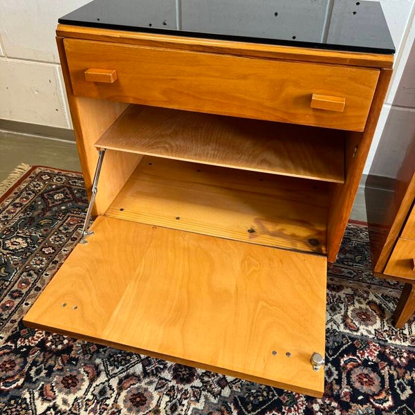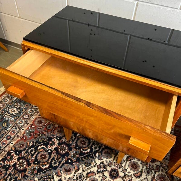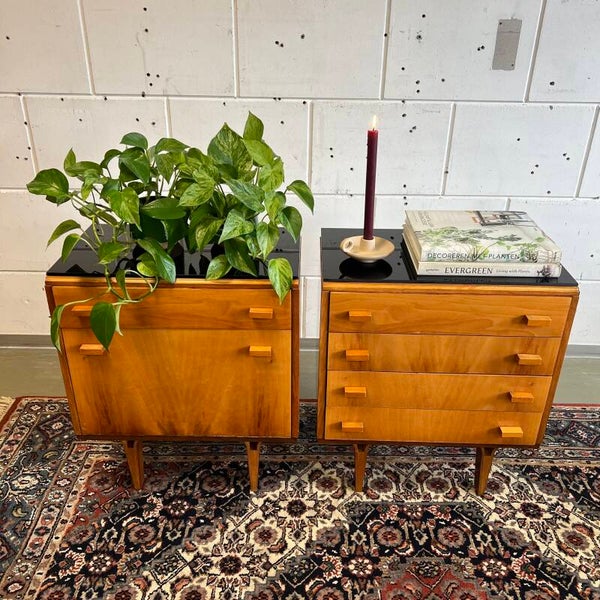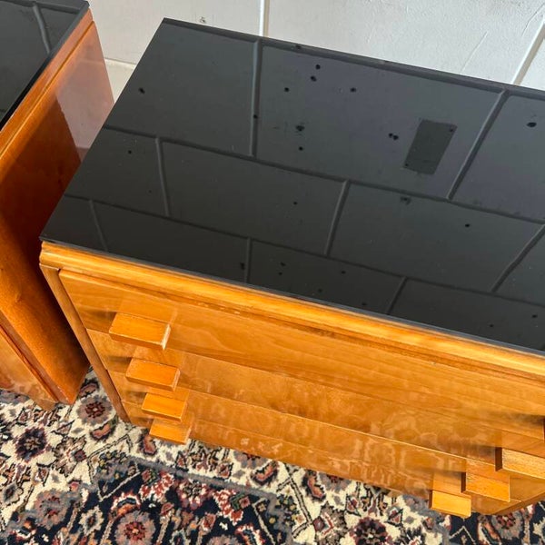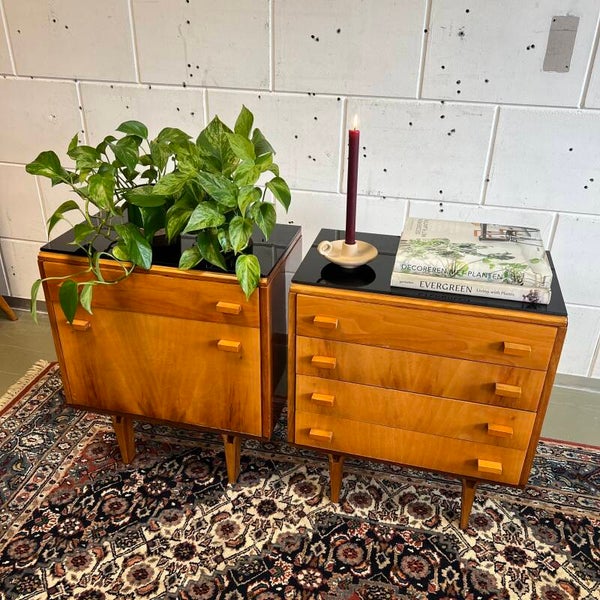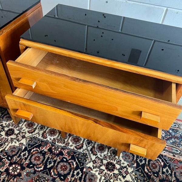 Set van 2 leuke vintage (nacht)kastjes, uitgevoerd in mahoniehout (fineer, deels hoogglans) met zwart glazen plaat.