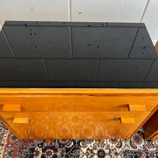 Beide kastjes hebben mooi gevormde pootjes en een losse zwart glazen plaat op het blad.