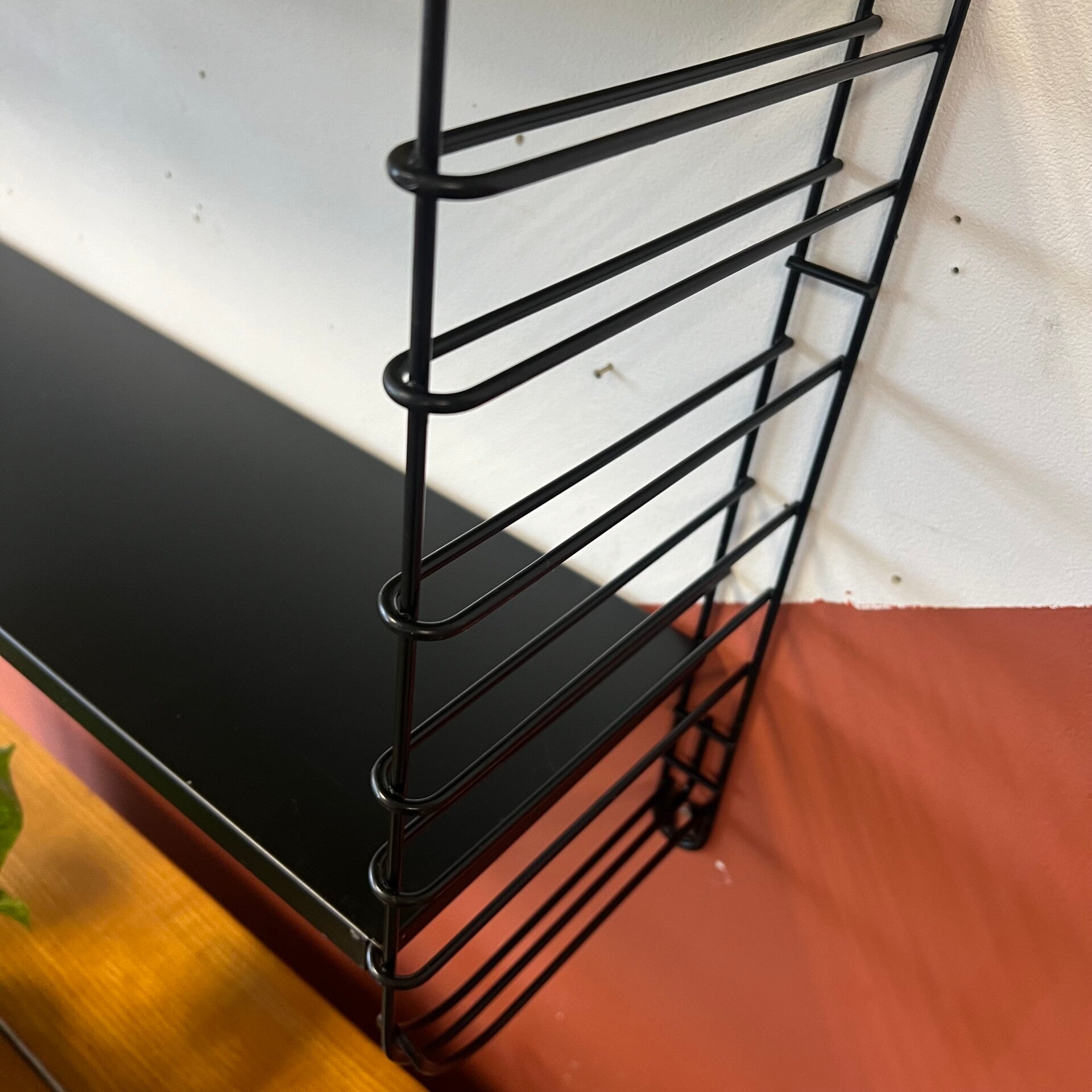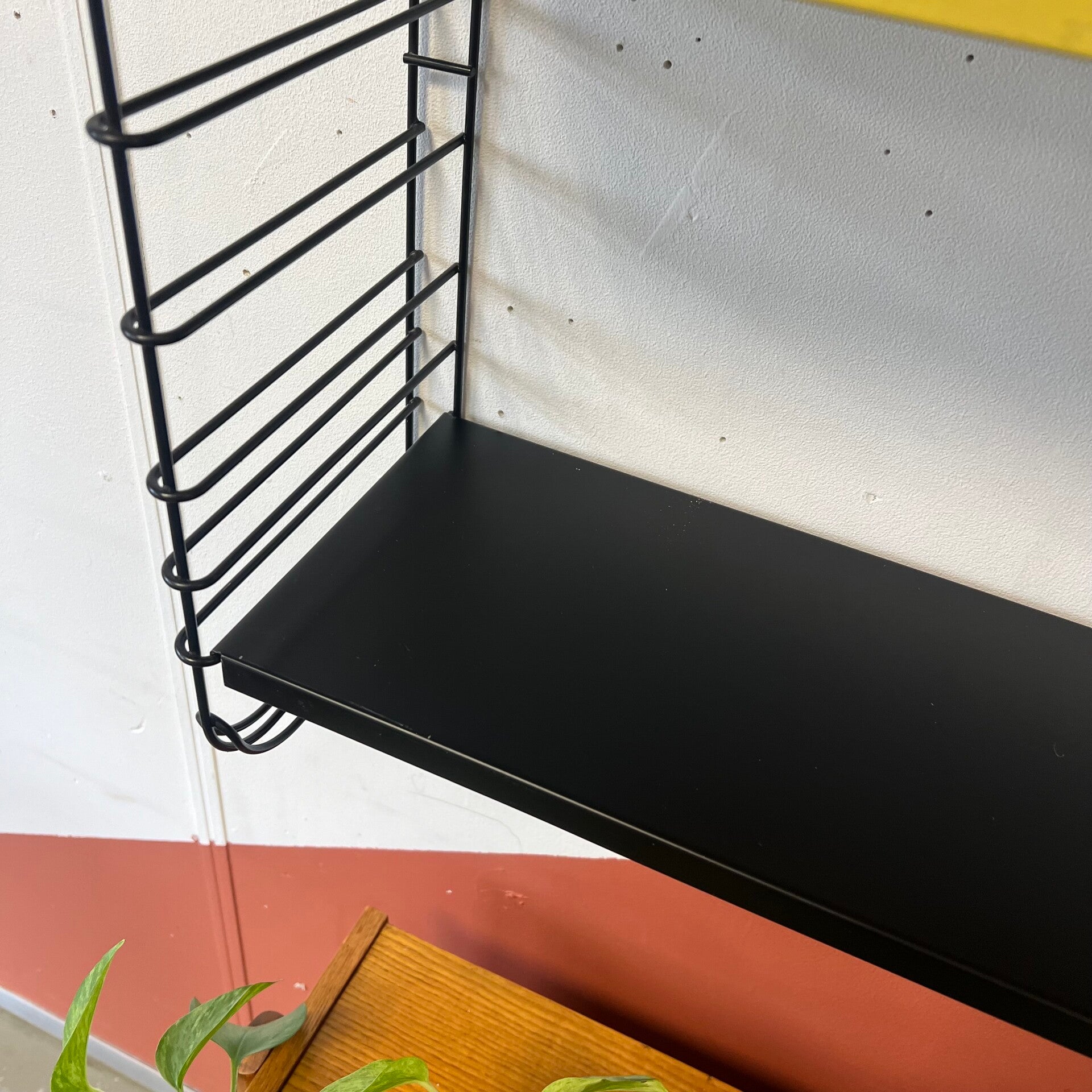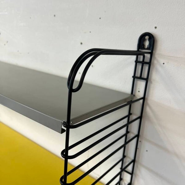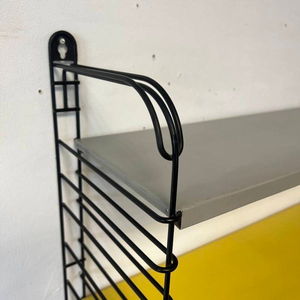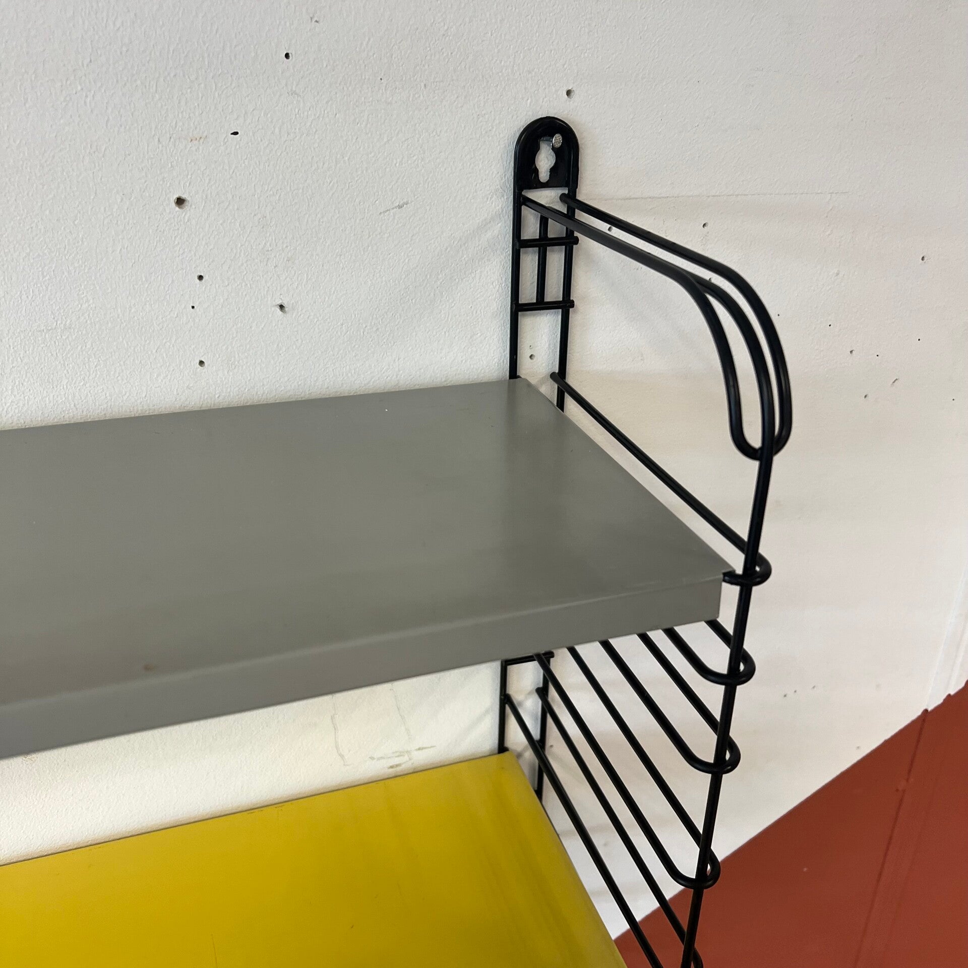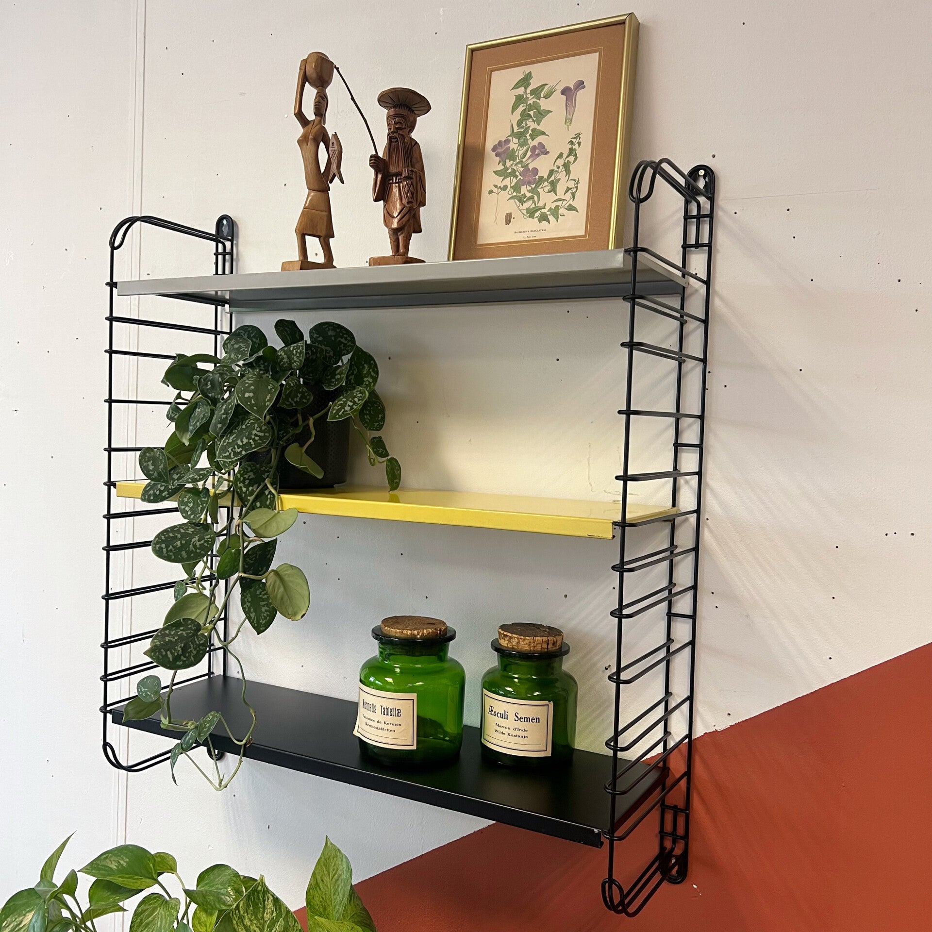 Leuk vintage wandrekje met 2 zwarte rekken in geplastificeerd draadmetaal en 3 metalen planken in de kleuren grijs, geel en zwart.