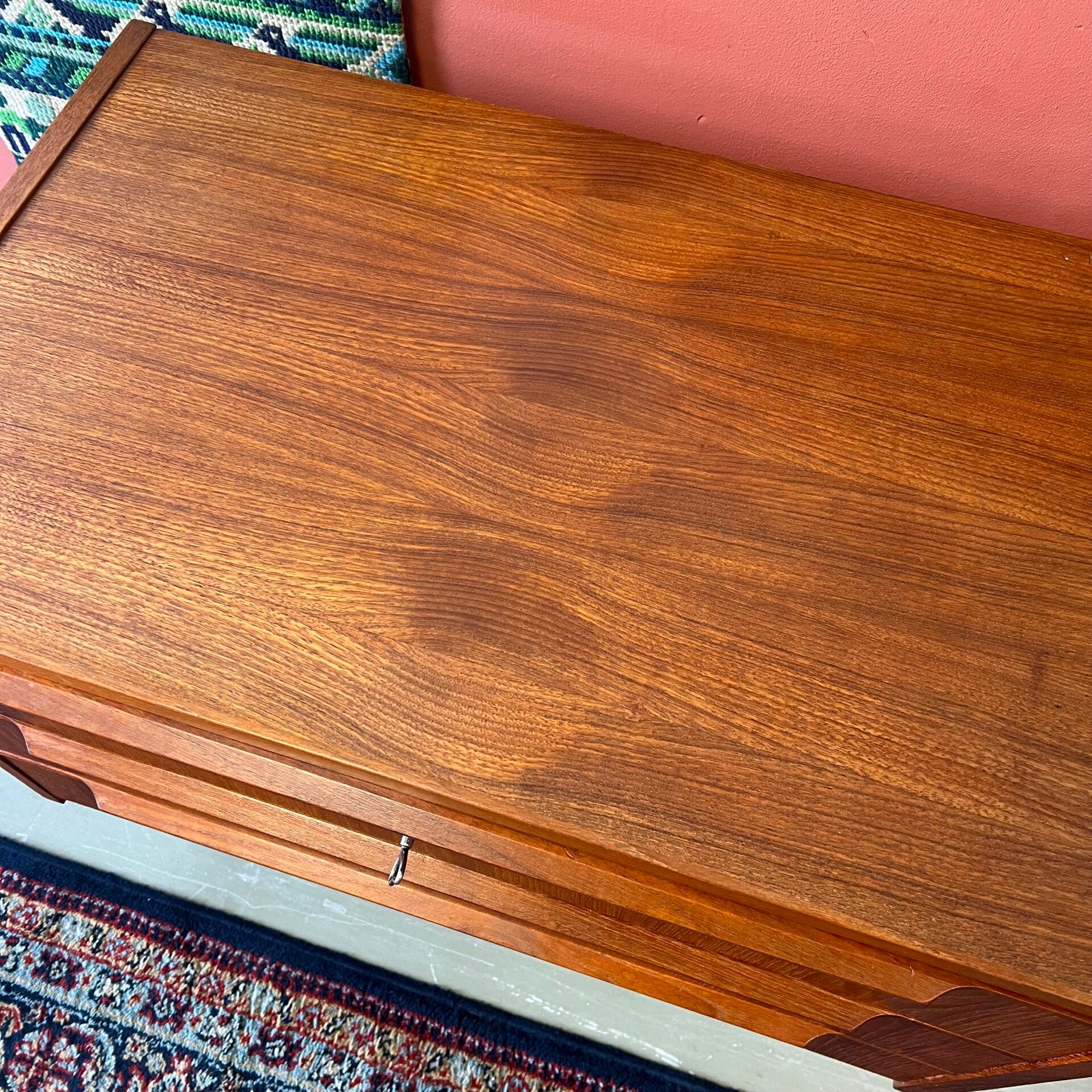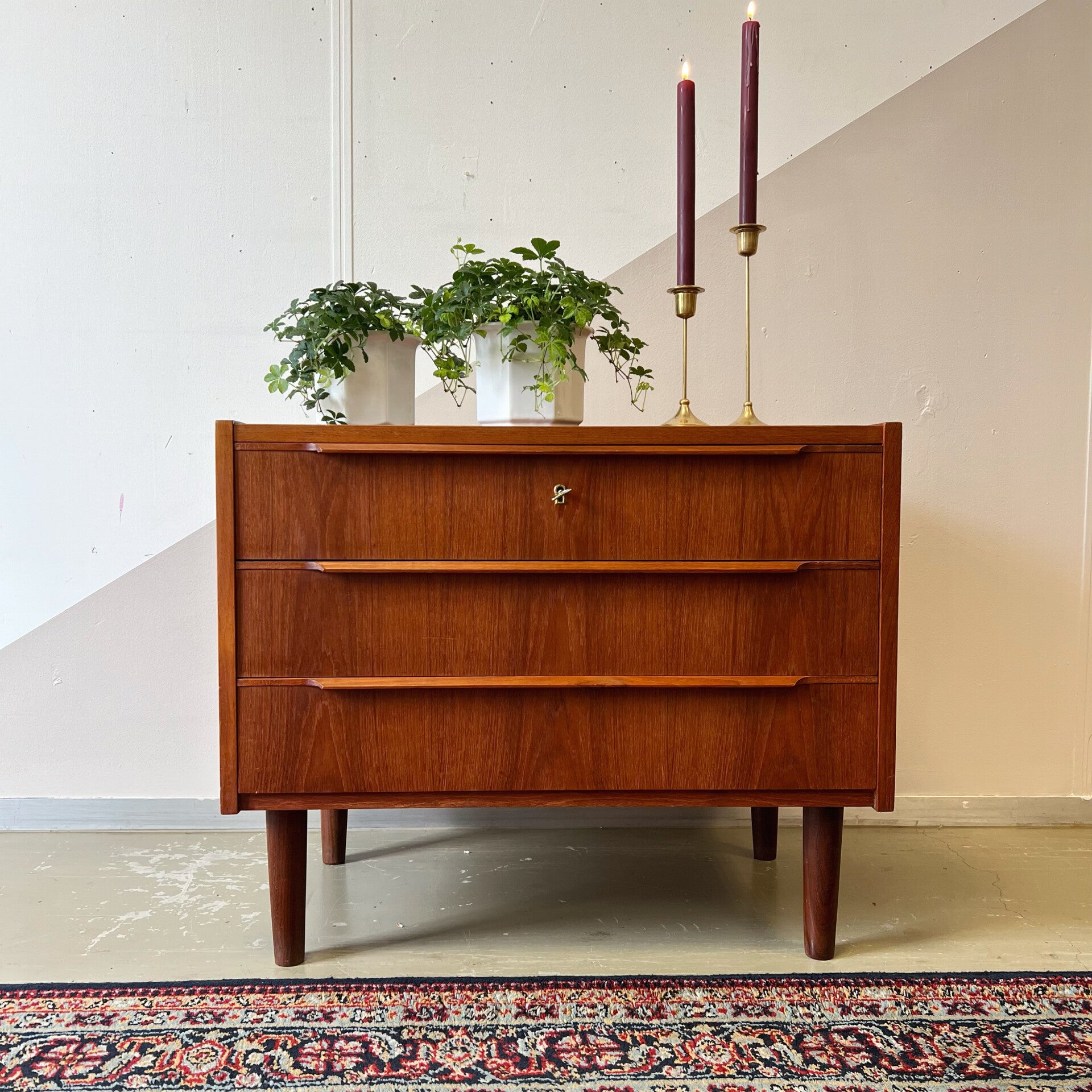 Uitgevoerd in teak (fineer) met 3 ruime lades, waarvan de bovenste met slot (sleutel aanwezig).