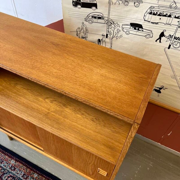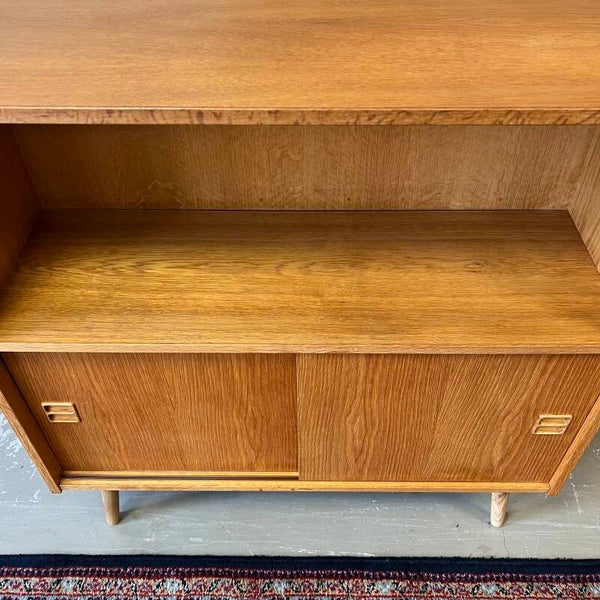 Leuk vintage Deens boekenkastje in licht eiken (fineer), met mooi gevormde handgrepen.