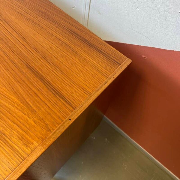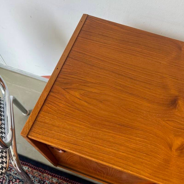 Uitgevoerd in teak (fineer) met mooie ronde handgrepen en slanke conische pootjes (later toegevoegd).