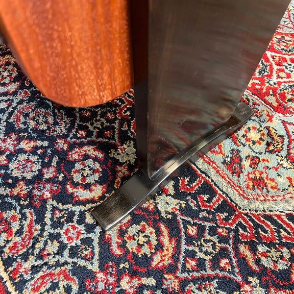 Uitgevoerd in notenhout met donkere staanders en lade (waarschijnlijk eens in de donkere beits gezet).