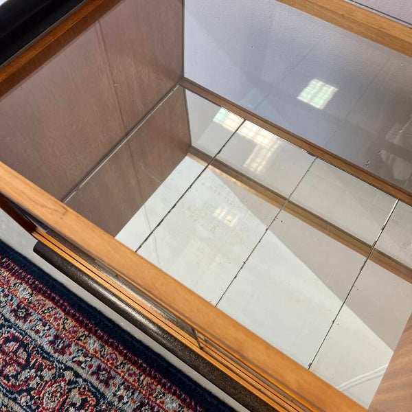 Aan de achterzijde een glazen plaat, aan de voorzijde 2 schuifruitjes. Binnenin een spiegelbodem en bovenop een afneembare glazen plaat.