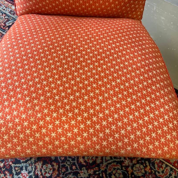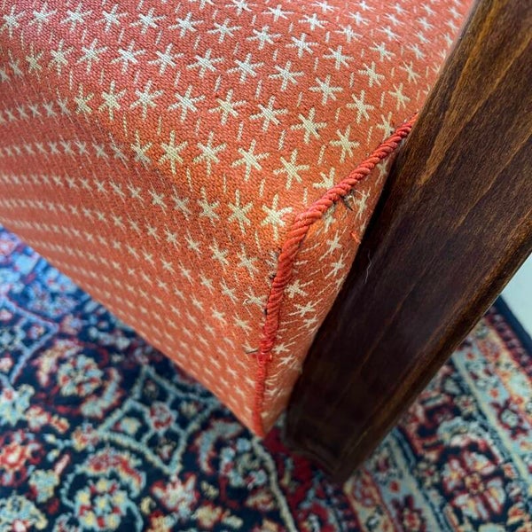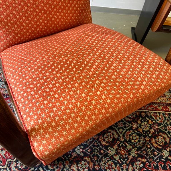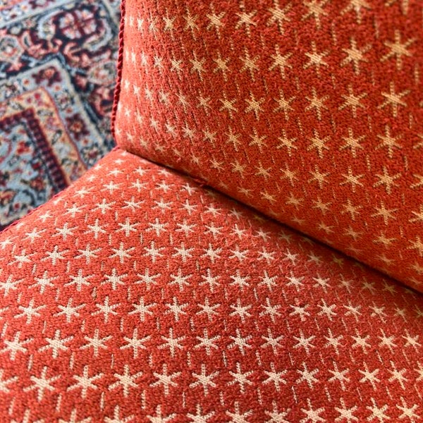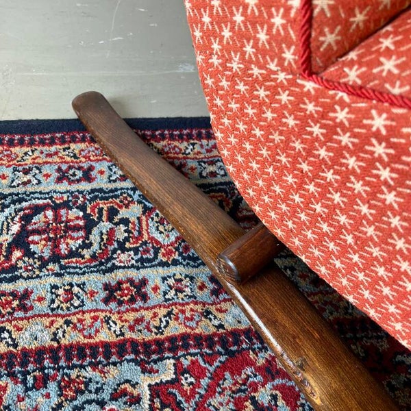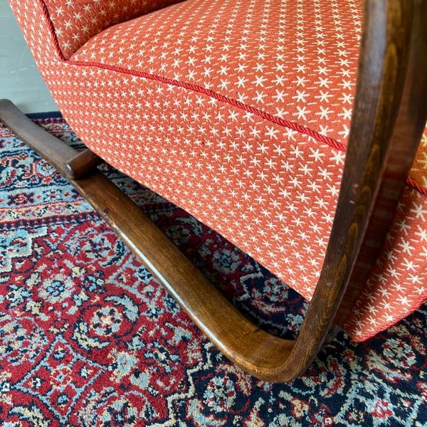Het frame is van gebogen beukenhout. De bekleding is oranje/rood met beige stermotief.