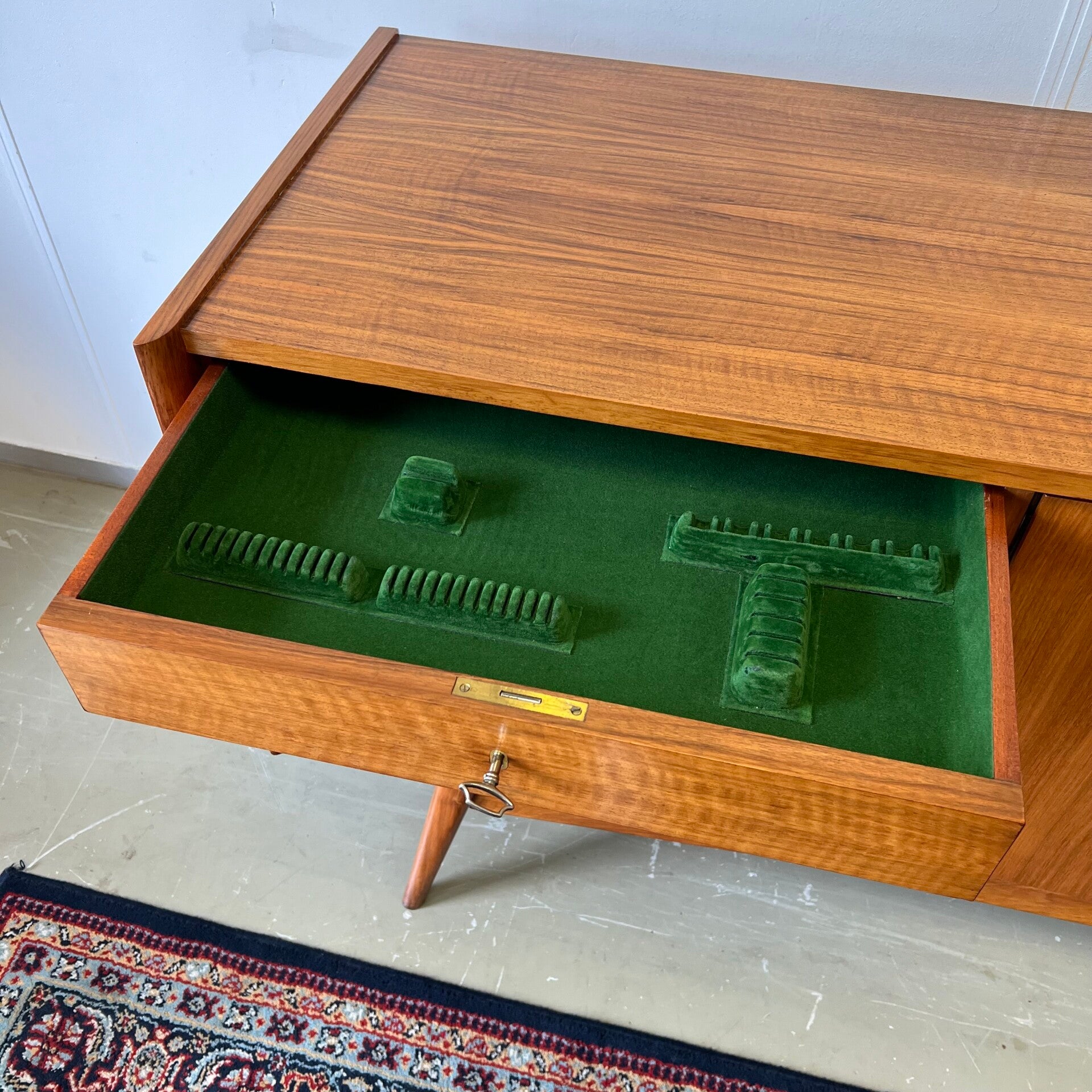 Het meubel heeft links 4 ruime lades, waarvan de bovenste met groen vilten inleg en slot (sleutel aanwezig).