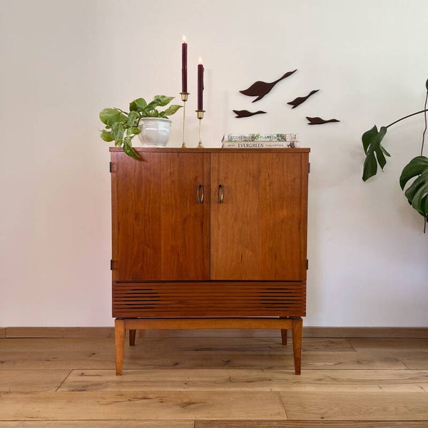 Leuk vintage TV kastje met scharnierdeurtjes en “zwevend” onderstel.
