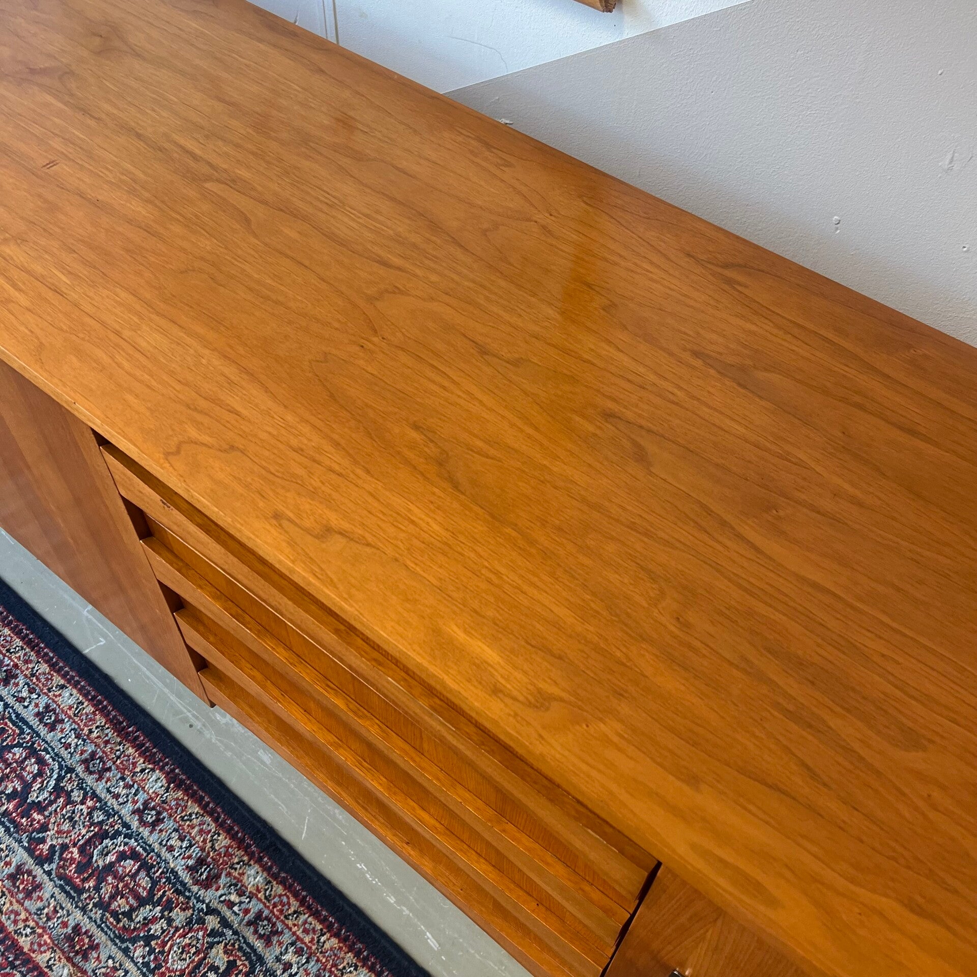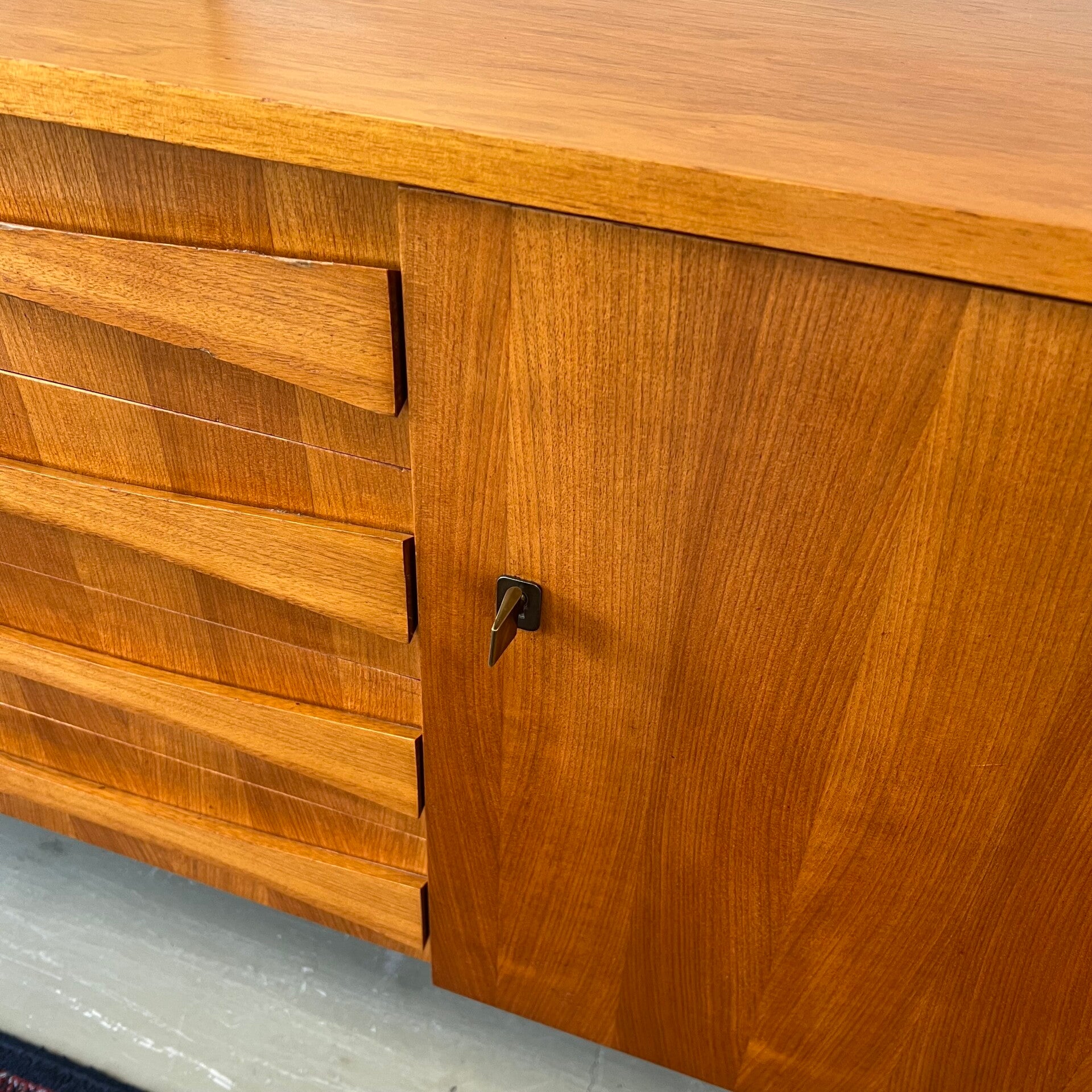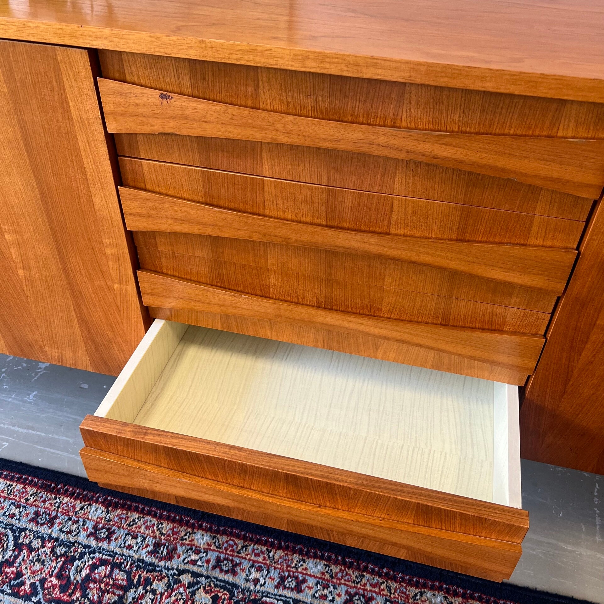 De frontjes hebben een fraai streeppatroon in 2 kleuren, de lades mooi gewelfde handgrepen.