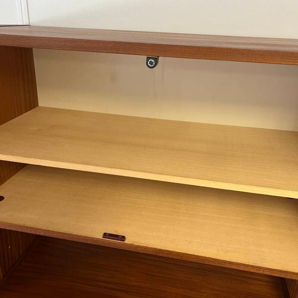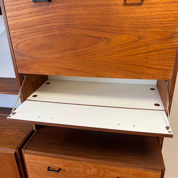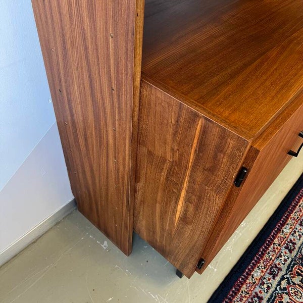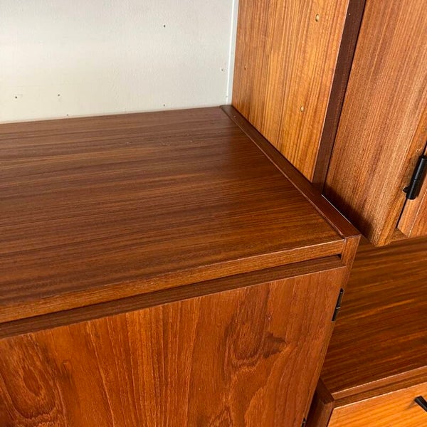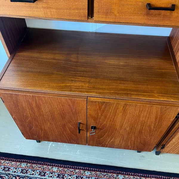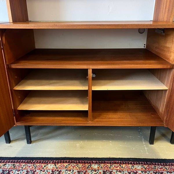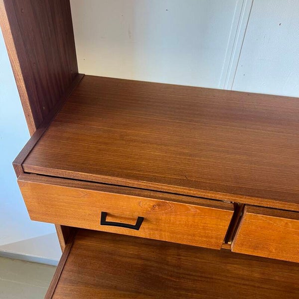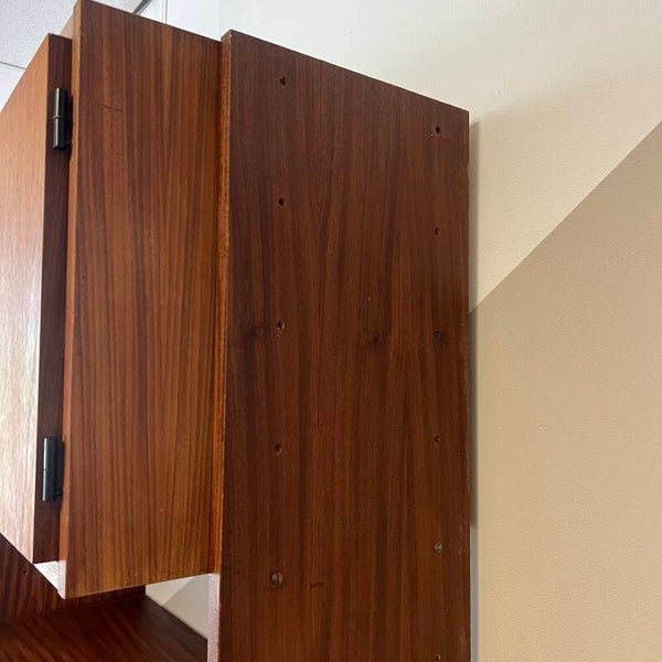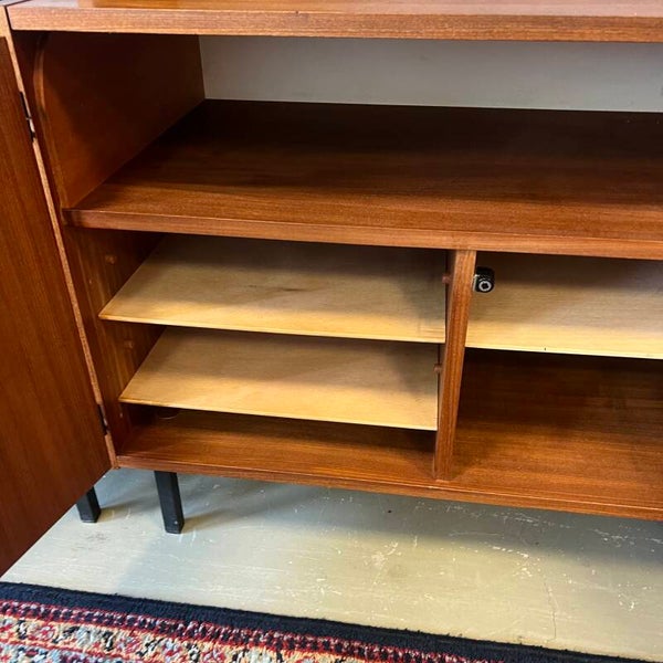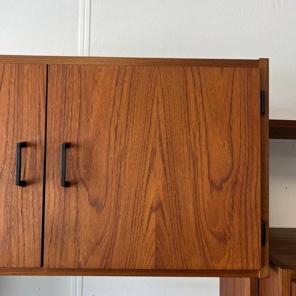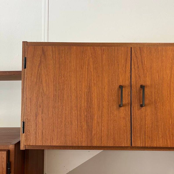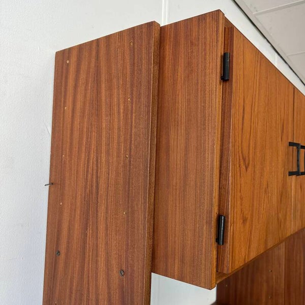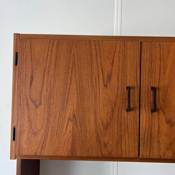 Mooi karakteristiek vintage wandmeubel in teak (fineer) met zwart beslag.