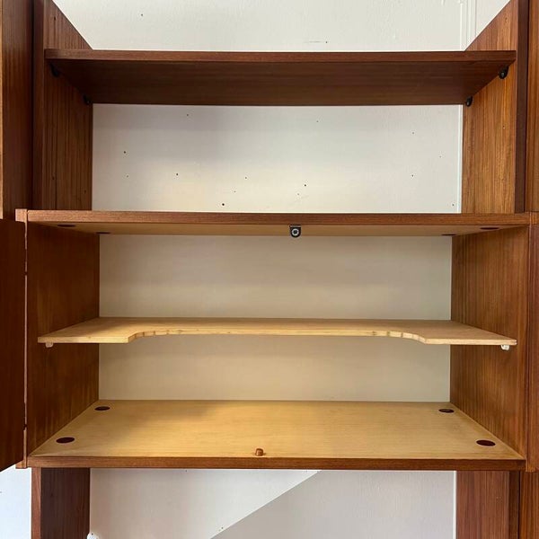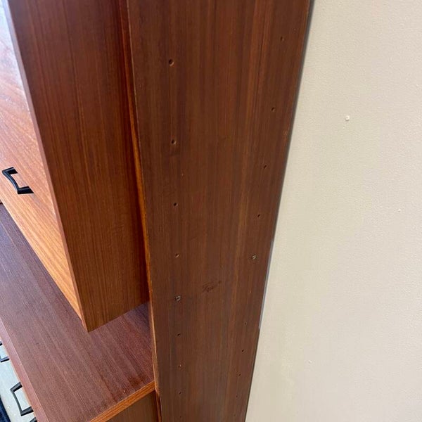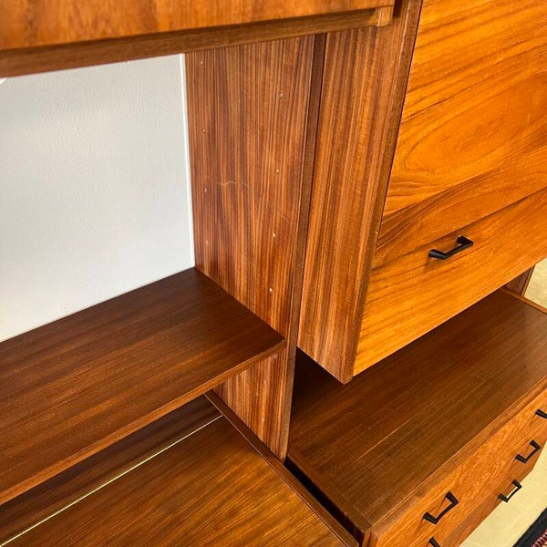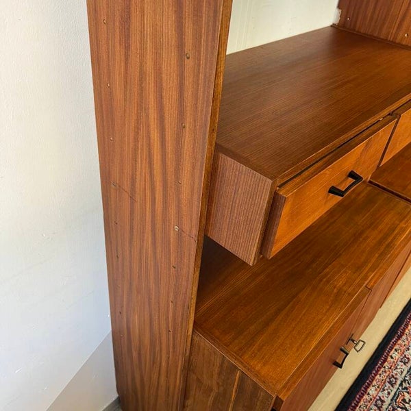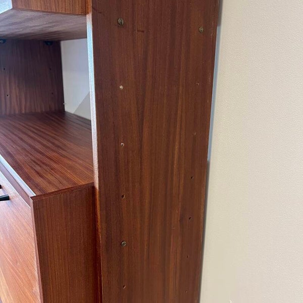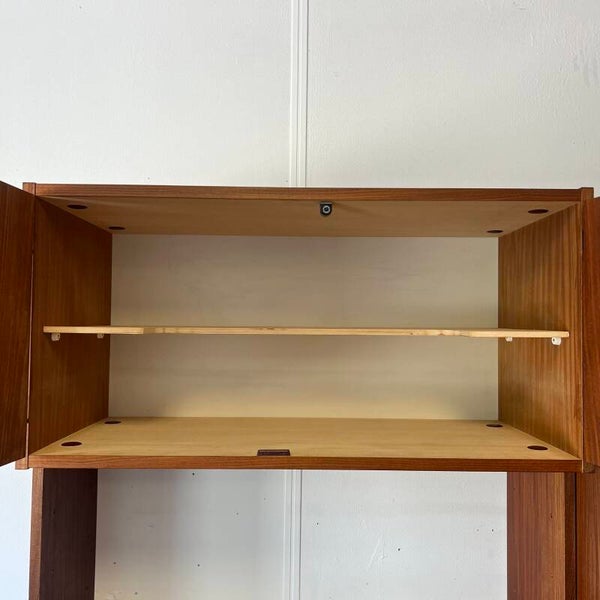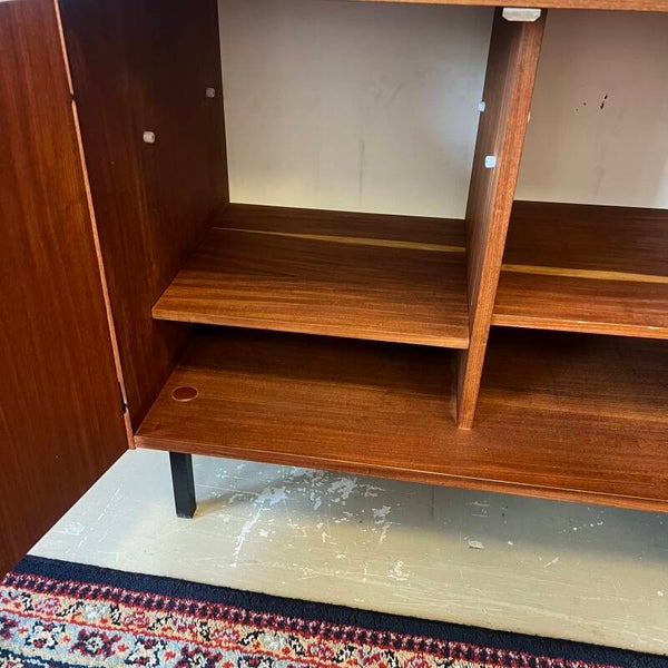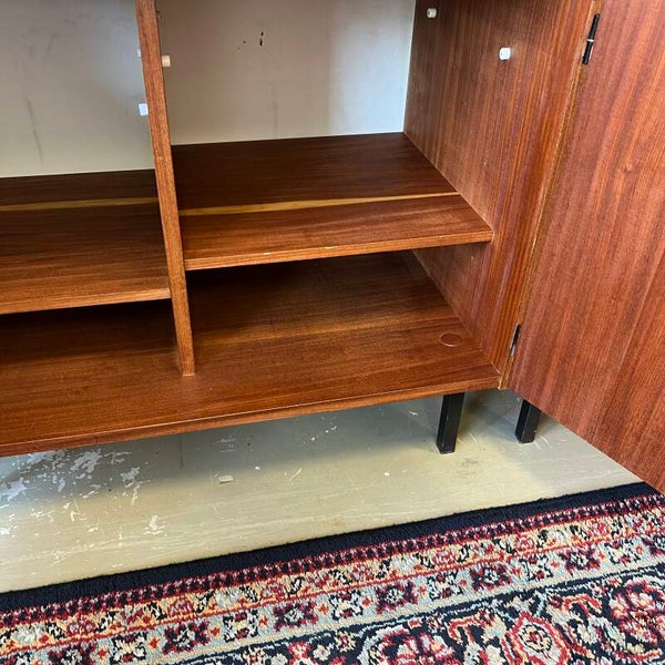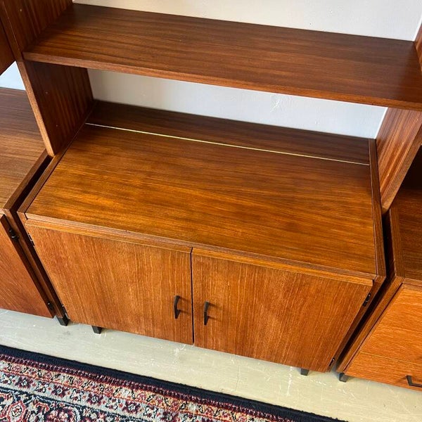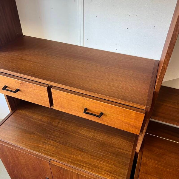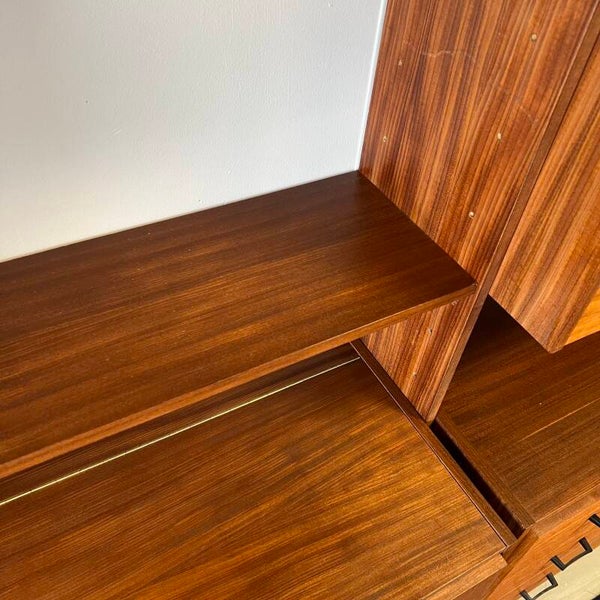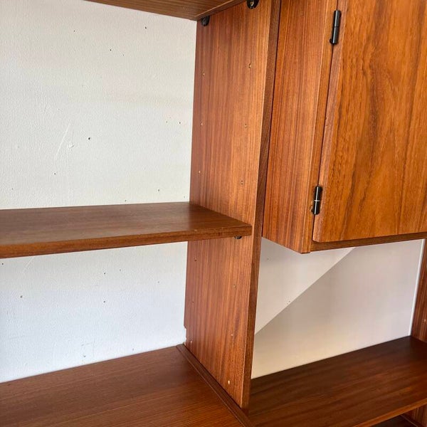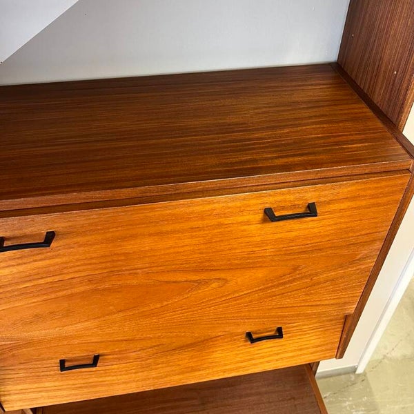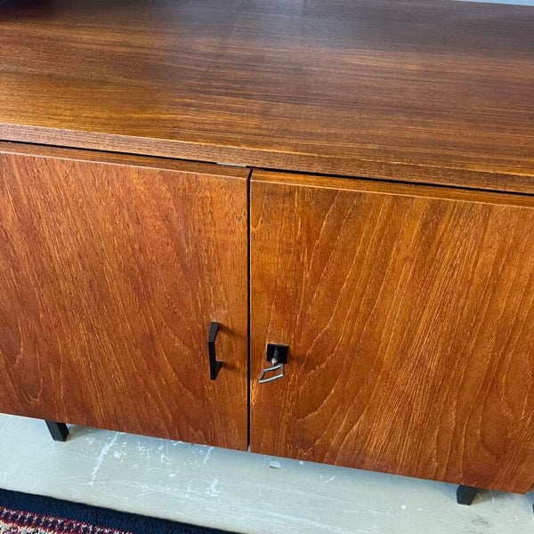 Mooi karakteristiek vintage wandmeubel in teak (fineer) met zwart beslag.