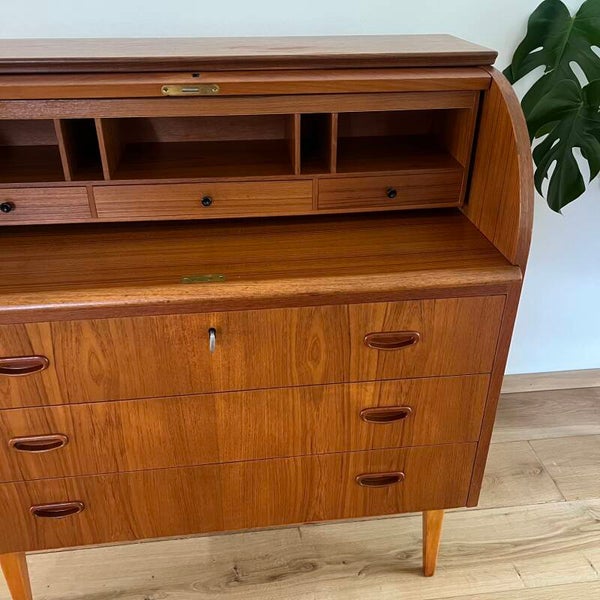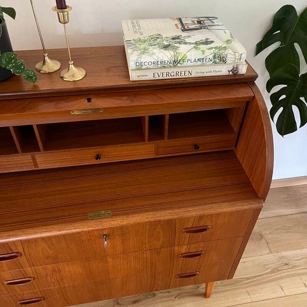 Het meubel heeft een roll top (afsluitbaar) met uitschuifbaar blad en diverse vakken / lades.