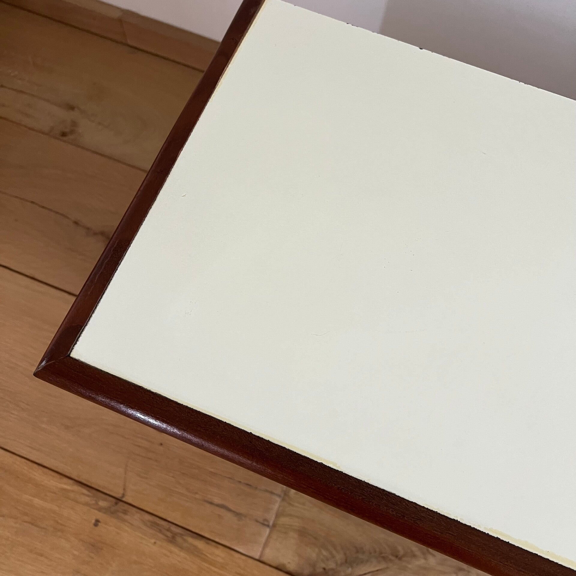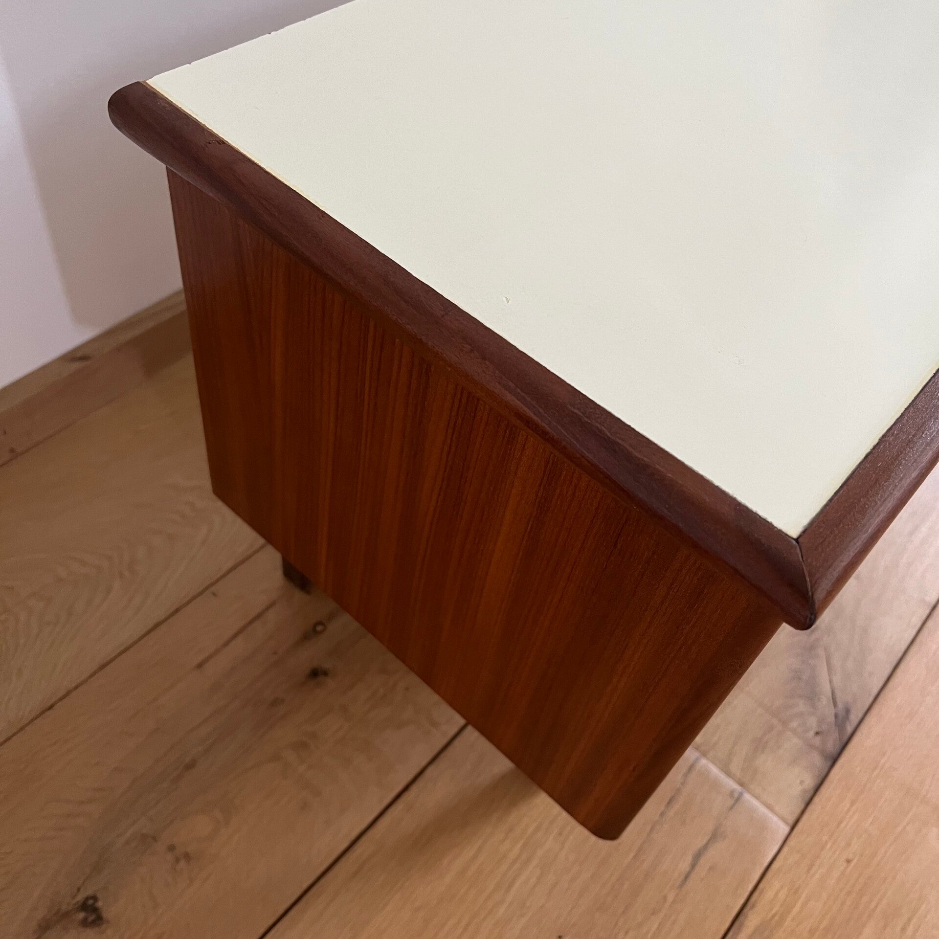 Uitgevoerd in teak (fineer) met wit blad, messing kleurige details en mooie contrasterende lichte frontjes.