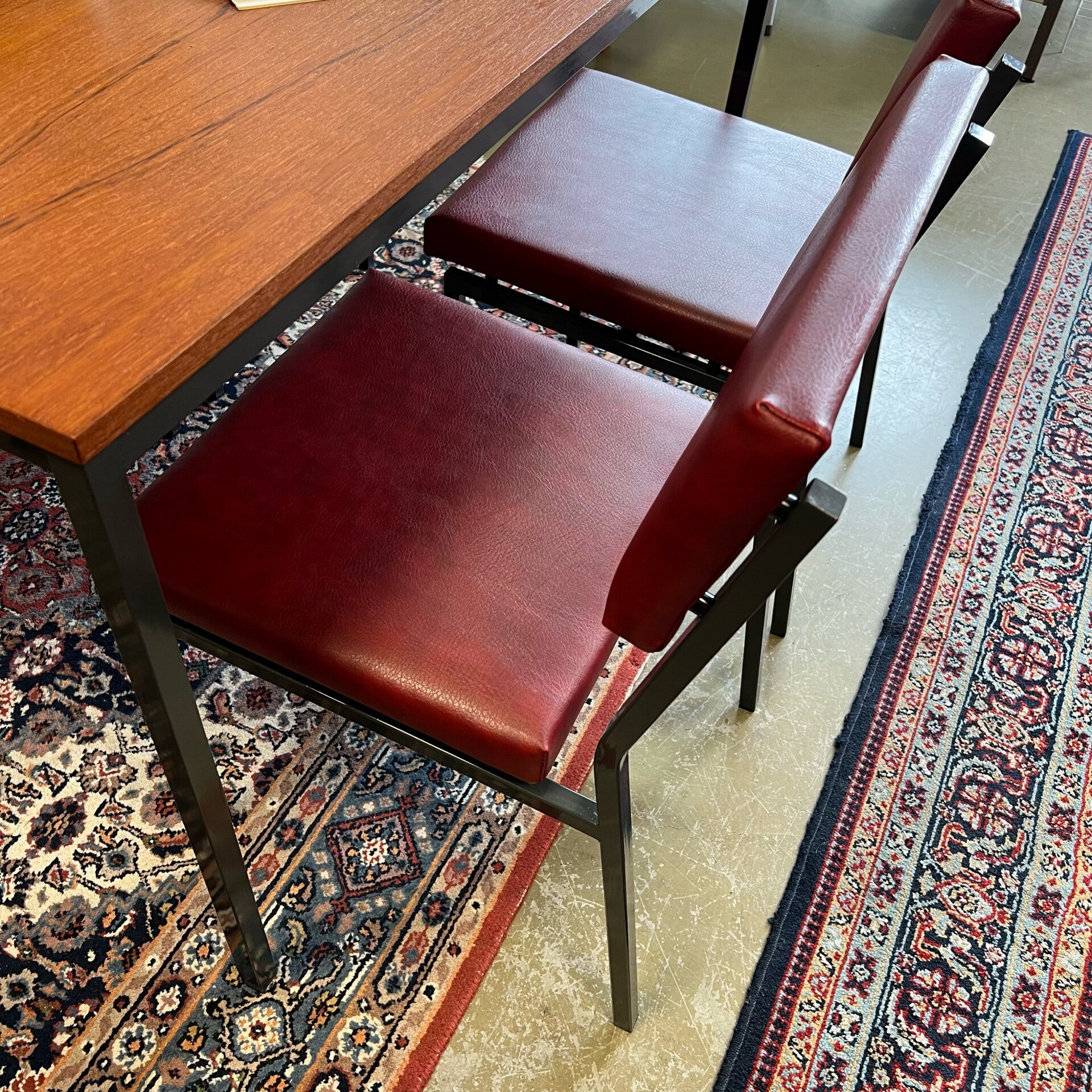 Het tafelblad is uitgevoerd in teak (fineer) en de stoelen hebben een bordeaux rode skai leren bekleding (nog erg net).