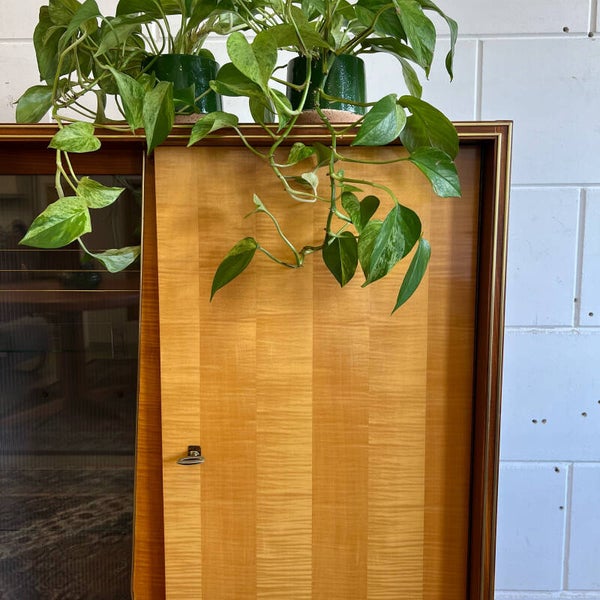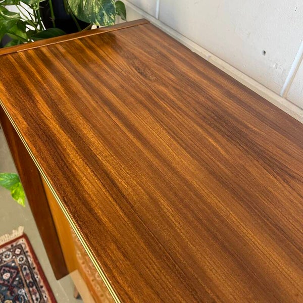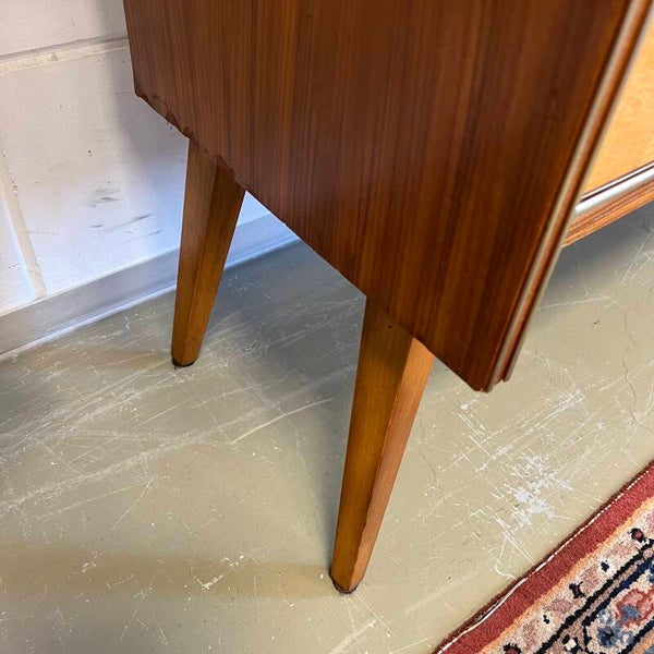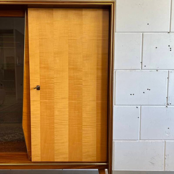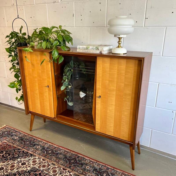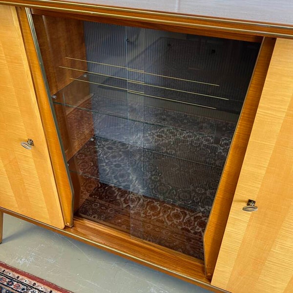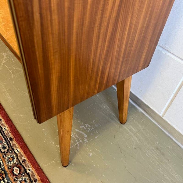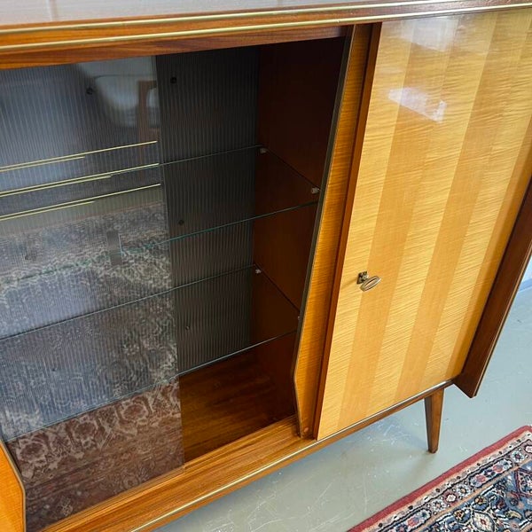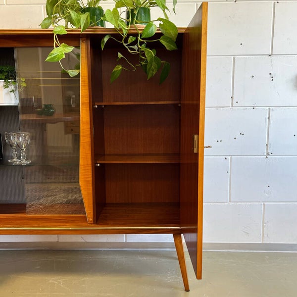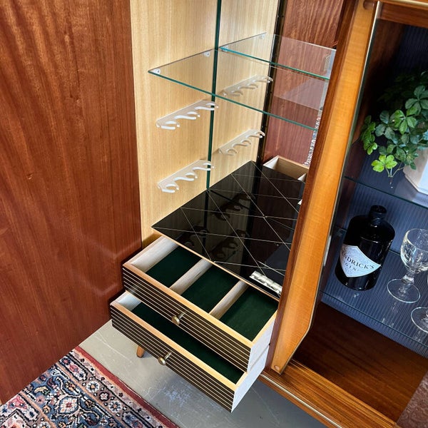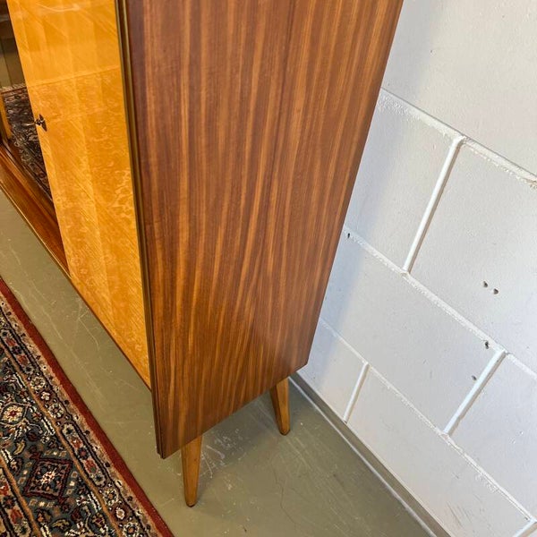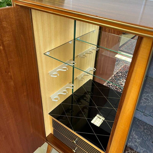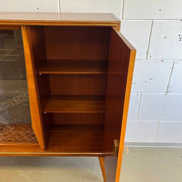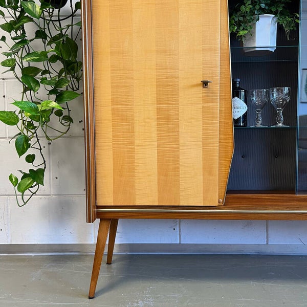 Mooie vintage vitrinekast, barkast op schuine poten.