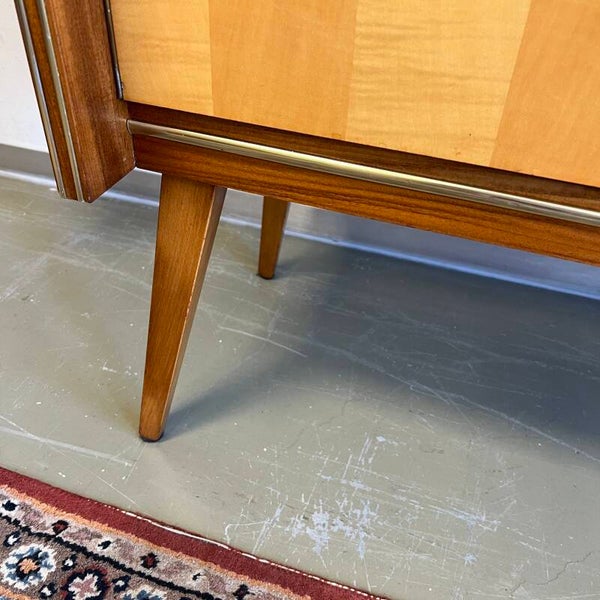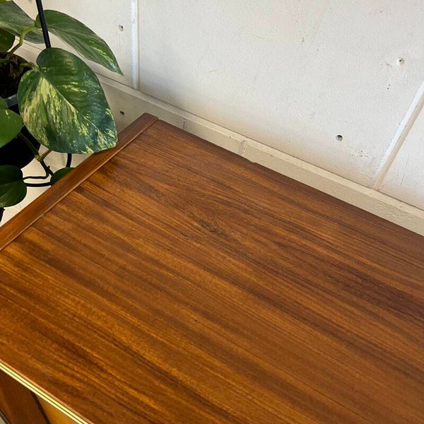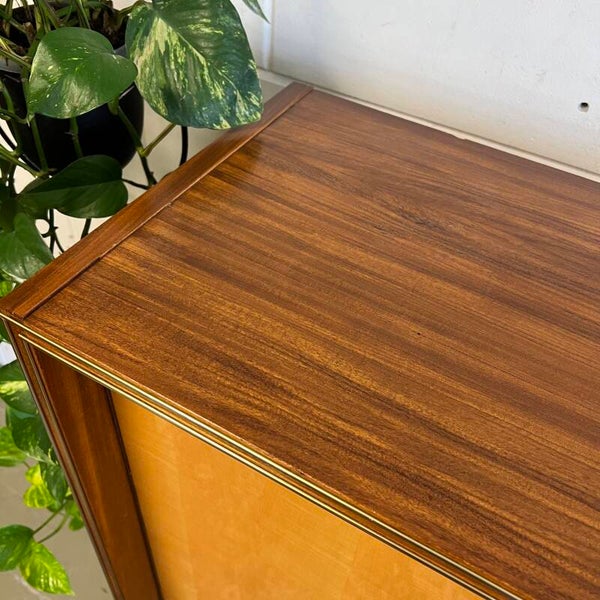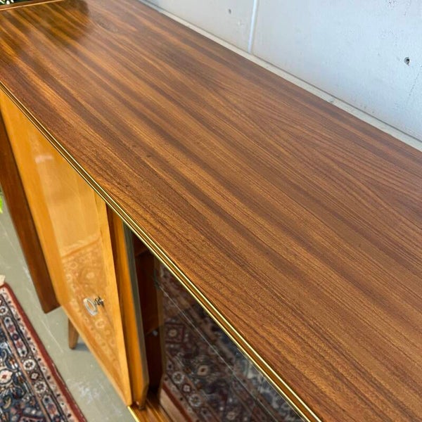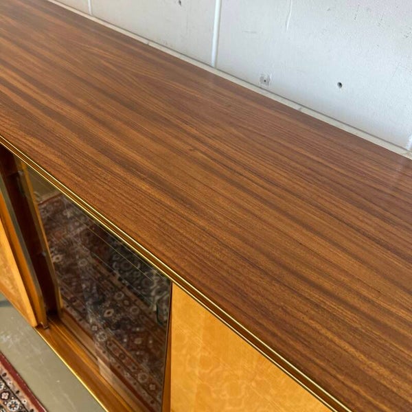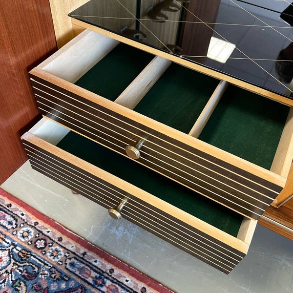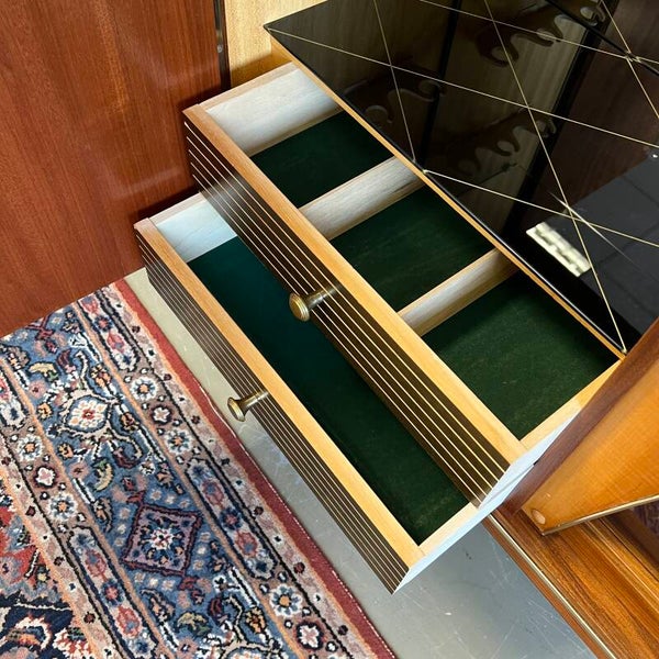 Speels uitgevoerd in contrasterende fineertinten, messing details en deels hoogglans elementen.