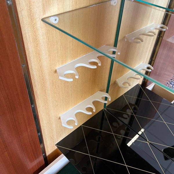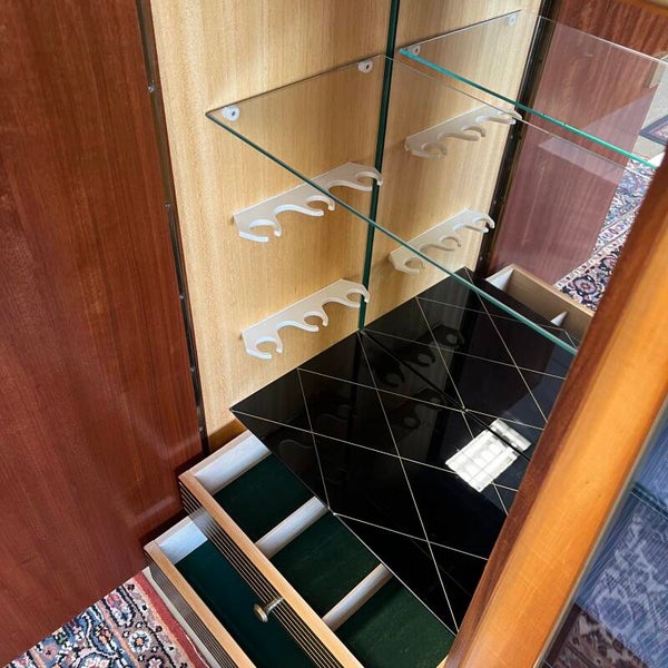 Het meubel heeft links een openslaande deur met slot (sleutel aanwezig). Erachter een bar met spiegelwand, uitneembare glazen plaat, zwart glazen bodemplaat, glashouders en 2 lades.