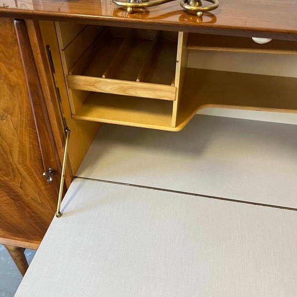In het midden een klepkast, barkast of secretaire met vakverdeling en formica blad.