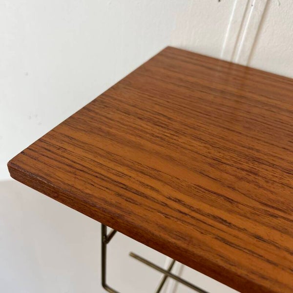 Leuk vintage telefoonrekje, met houten plank in teak (fineer) en messing tijdschriftenrek (patina).