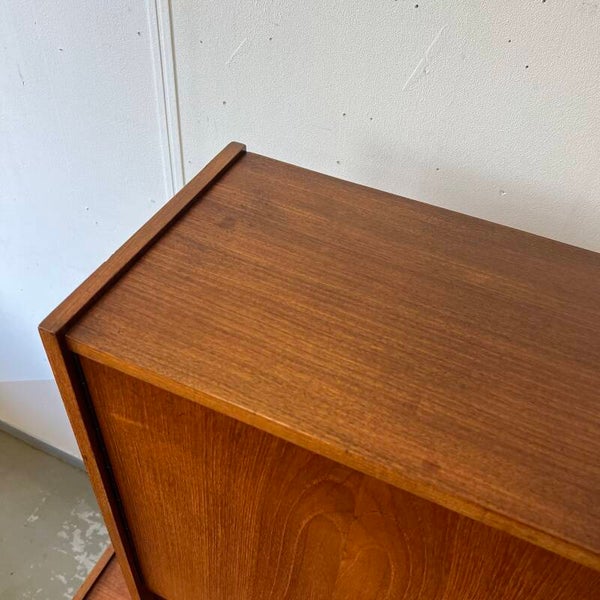 Het meubel is uitgevoerd in teak (fineer), staat op stevige poten en heeft mooi gevormde handgrepen.