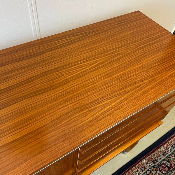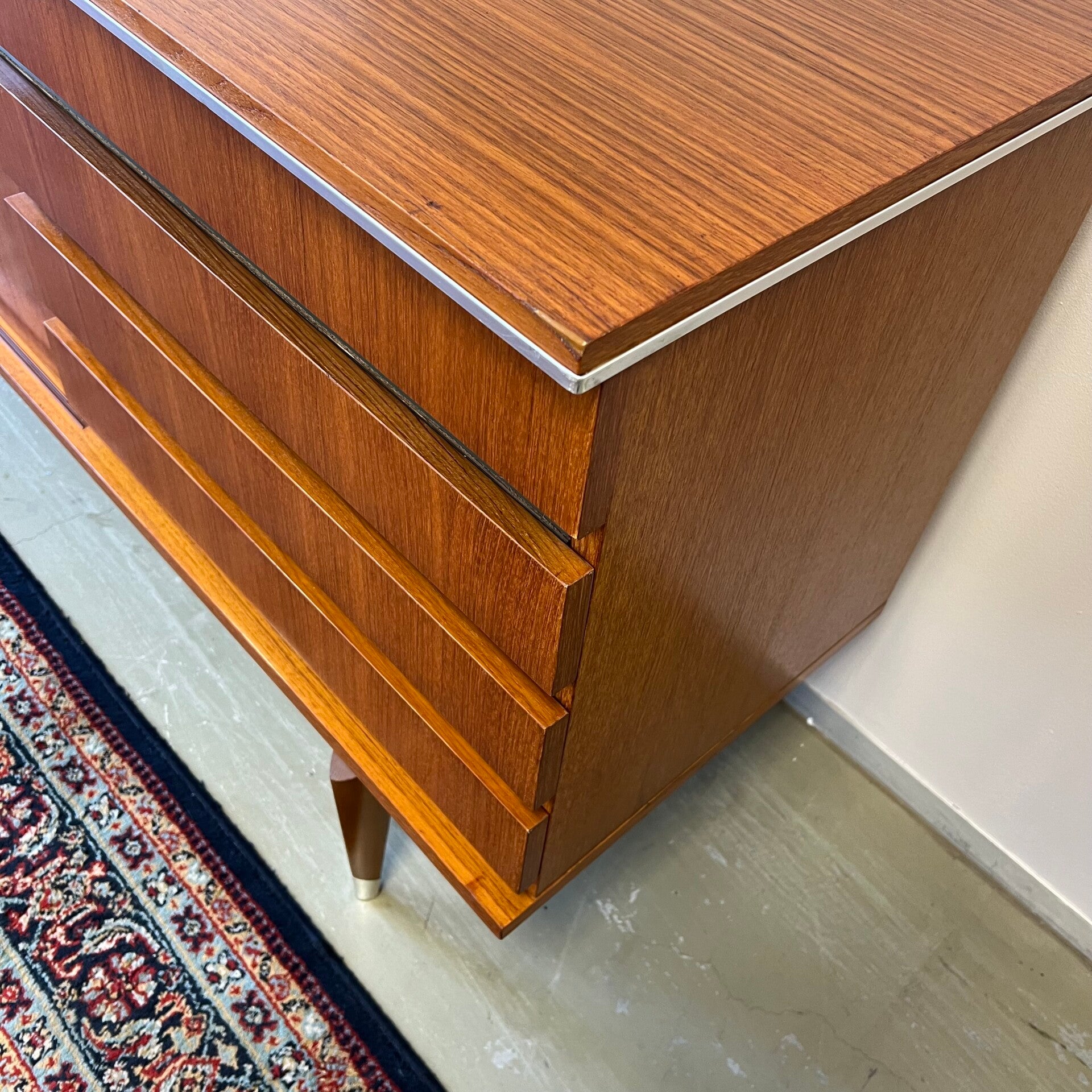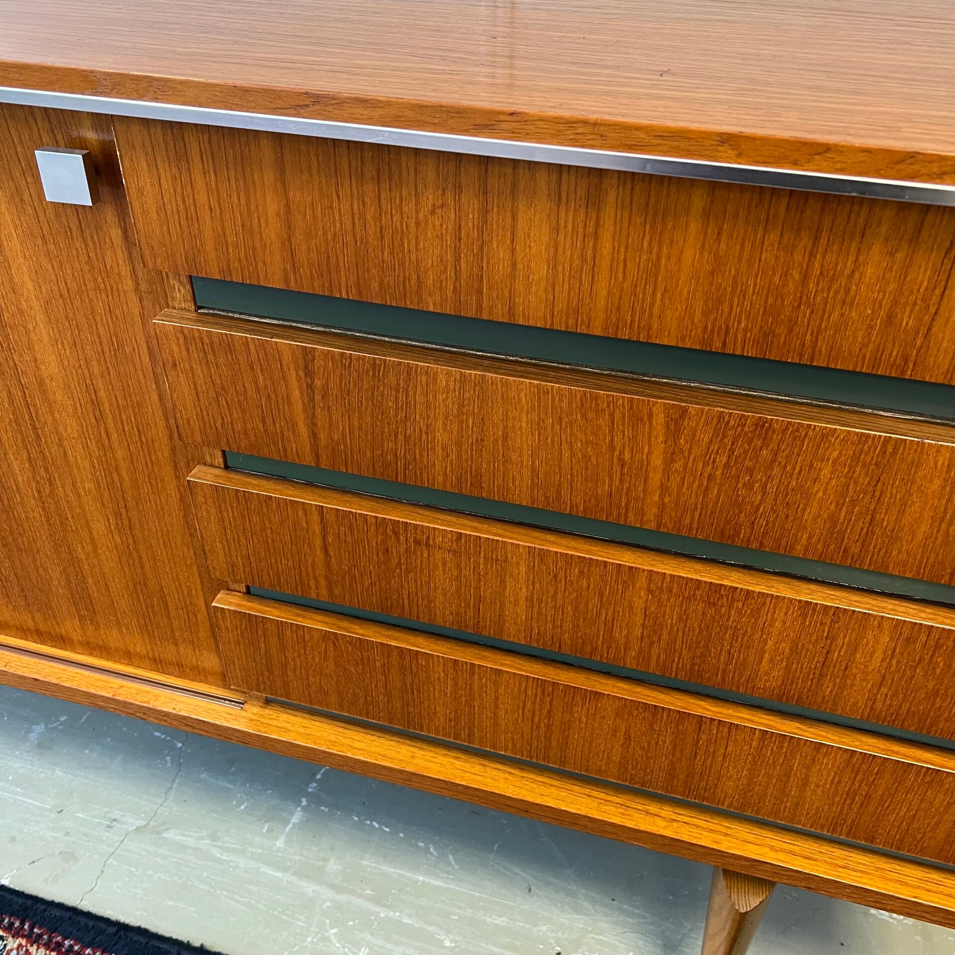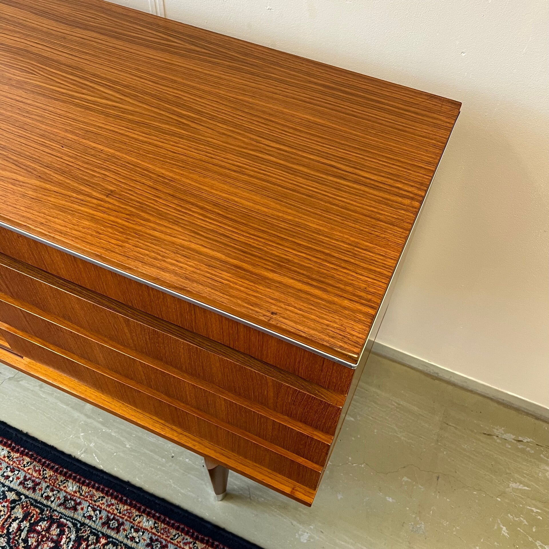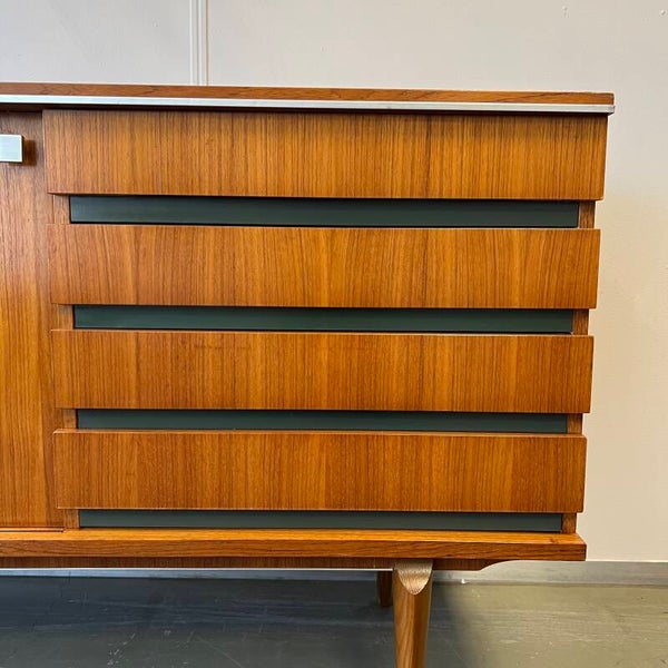 Uitgevoerd in teak (fineer) met chromen details en groenkleurige afwerking onder de lades.