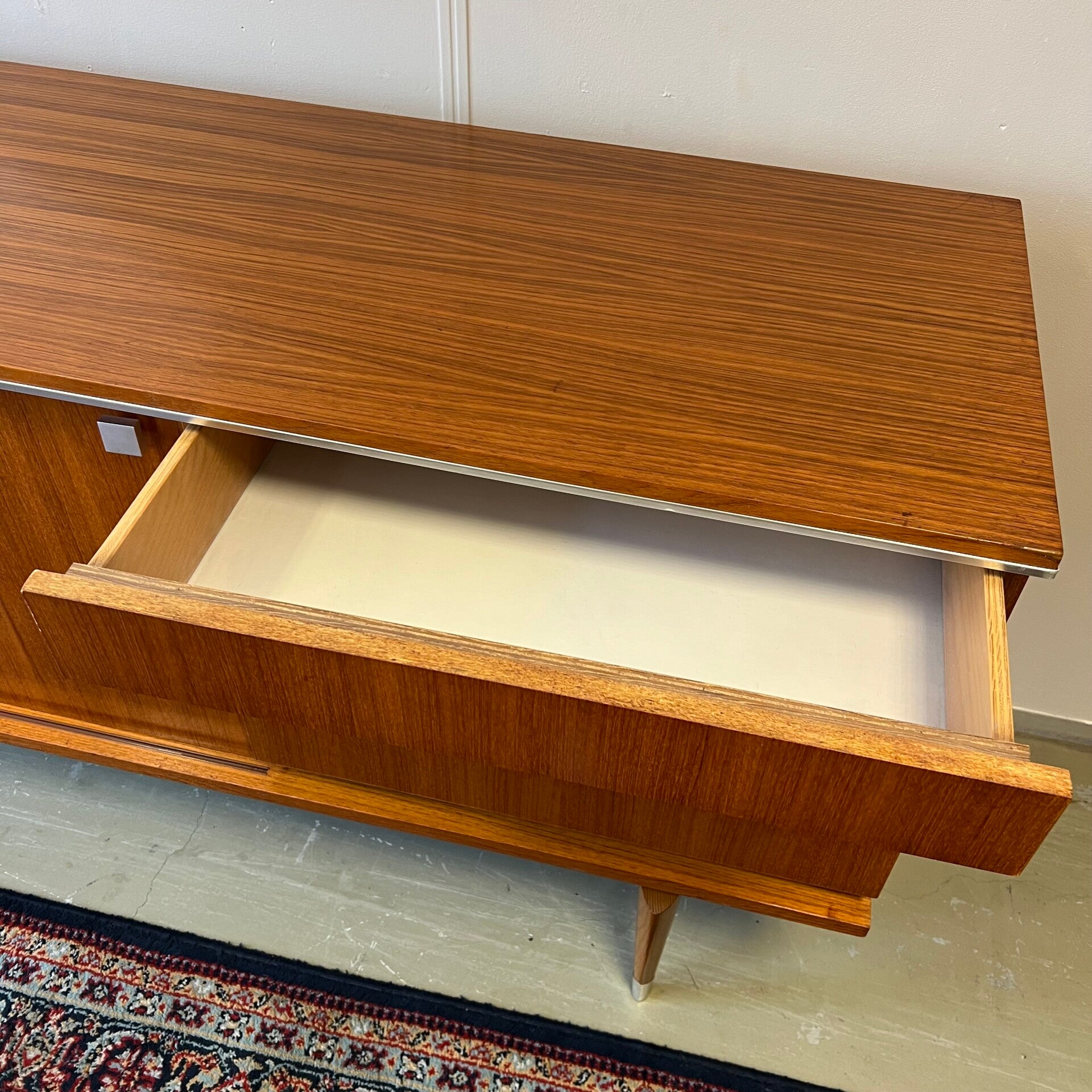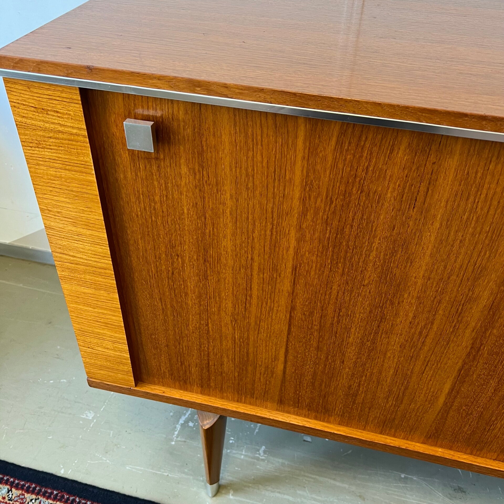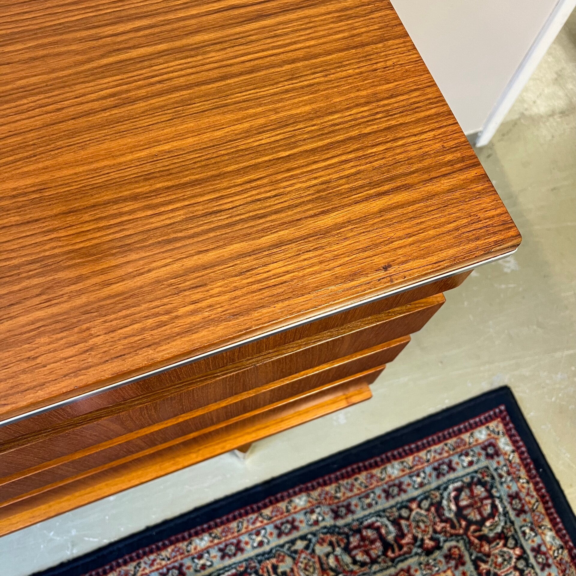 Uitgevoerd in teak (fineer) met chromen details en groenkleurige afwerking onder de lades.