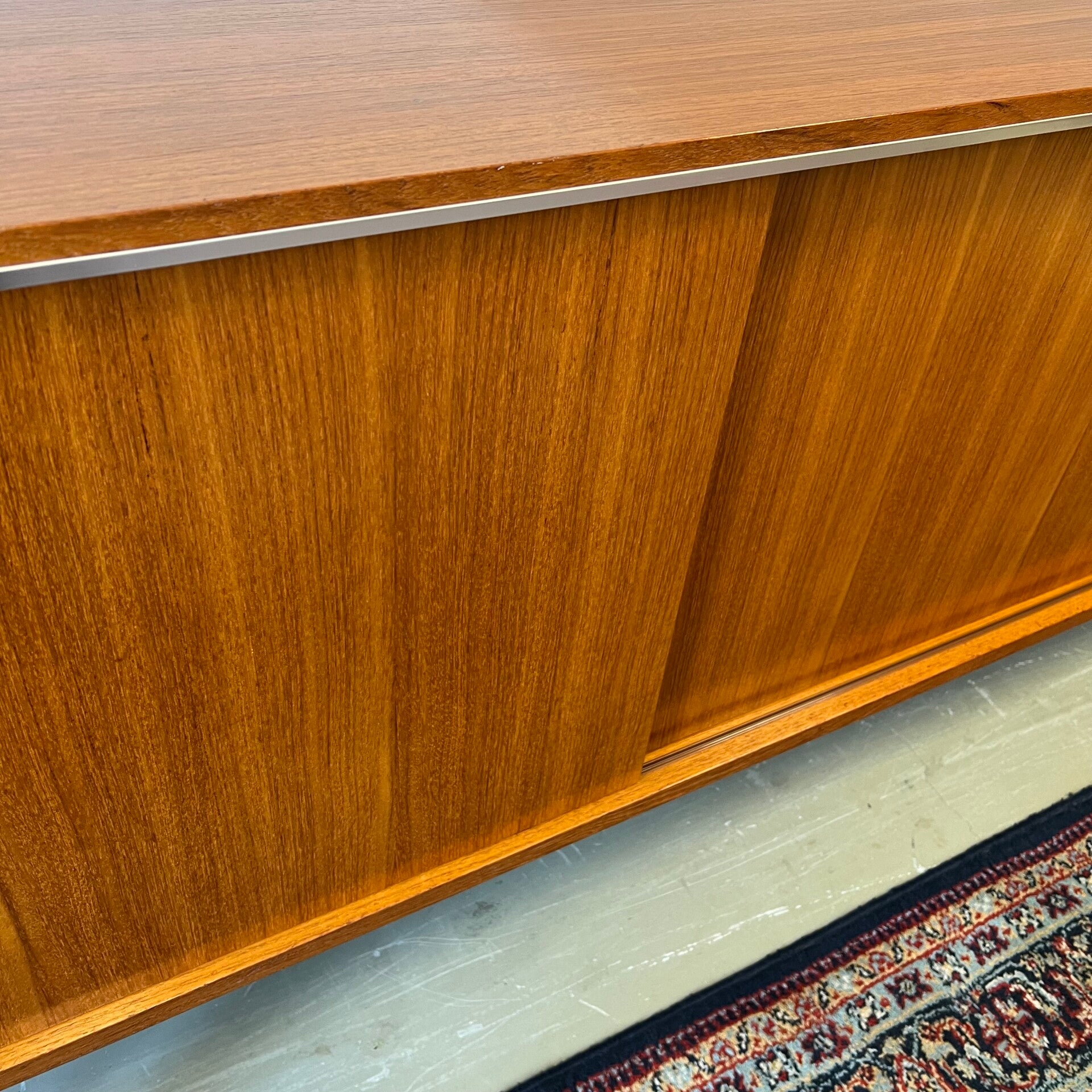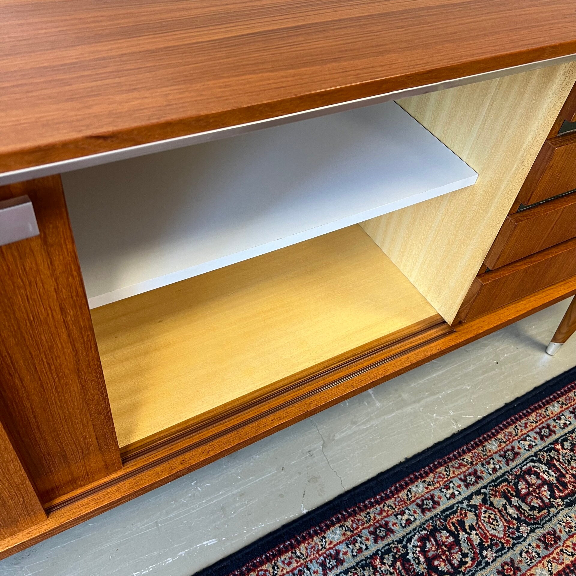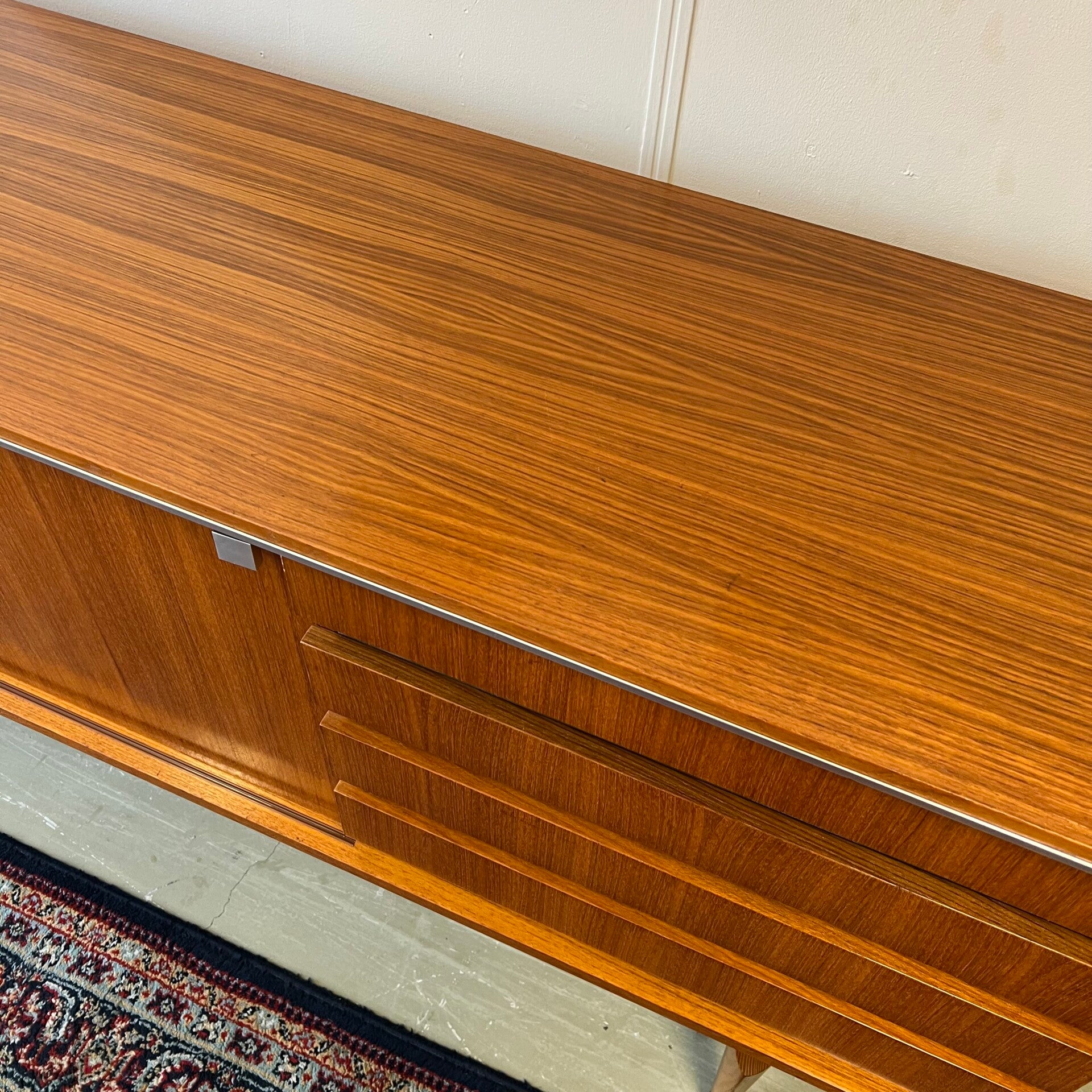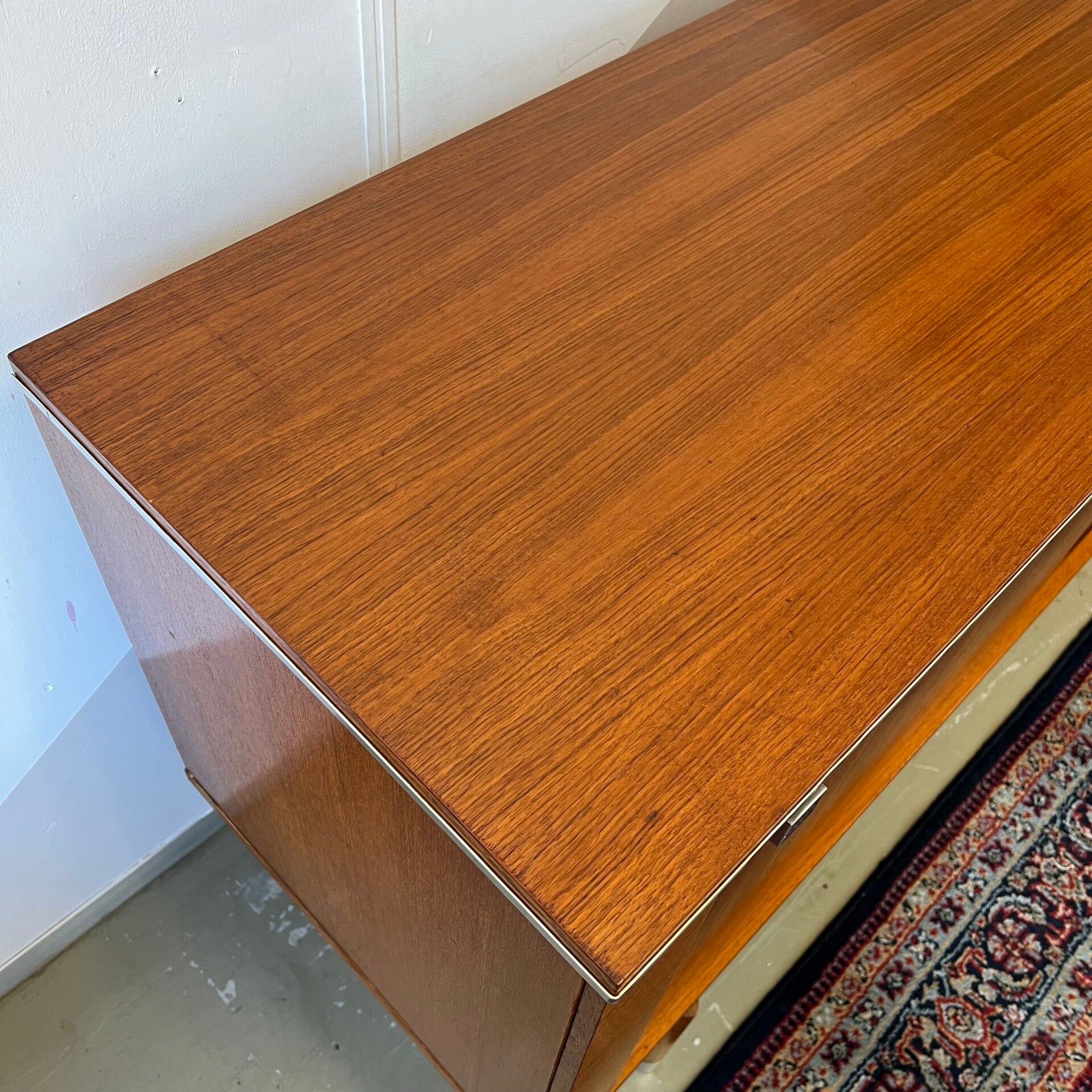 Uitgevoerd in teak (fineer) met chromen details en groenkleurige afwerking onder de lades.