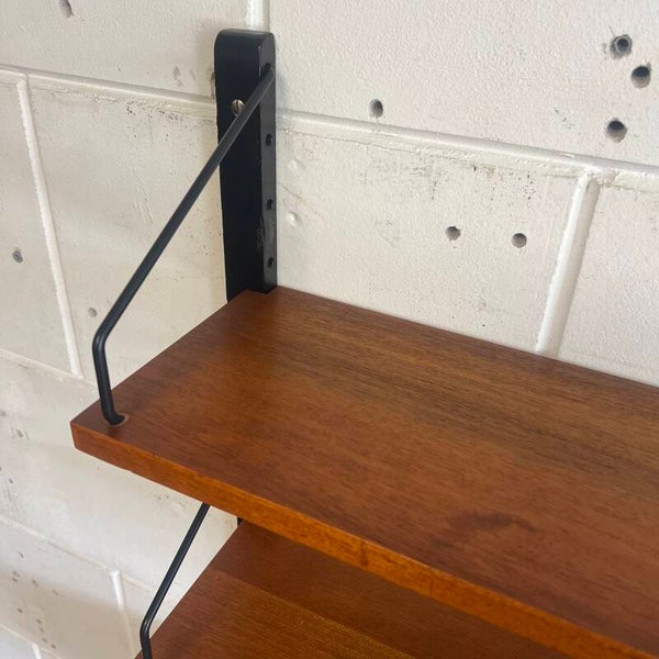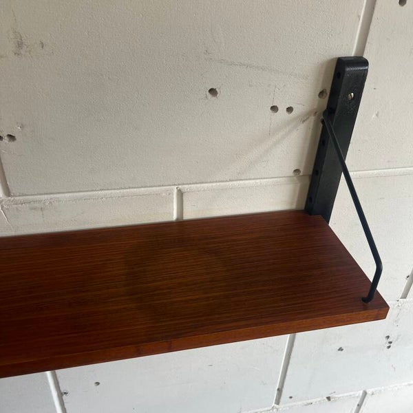 Uitgevoerd in teak/walnoot (fineer) met houten wandlatten (door ons zwart gespoten) en zwart metalen beugels.