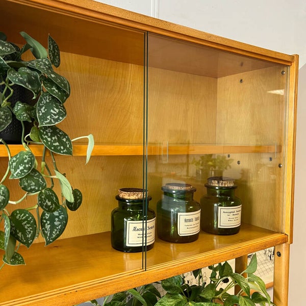 Bovenin een vitrinekast met glazen schuifruitjes en uitneembare houten plank.