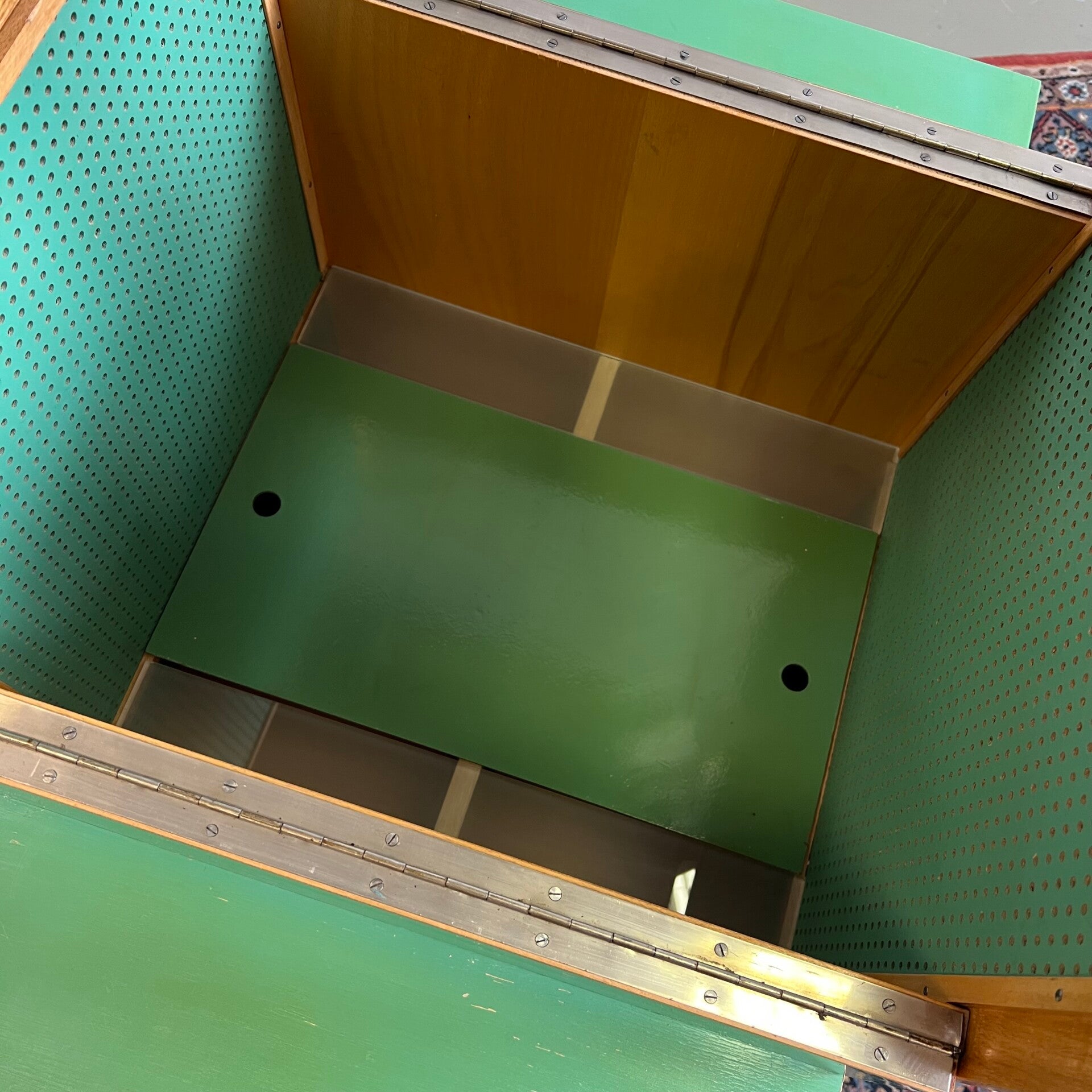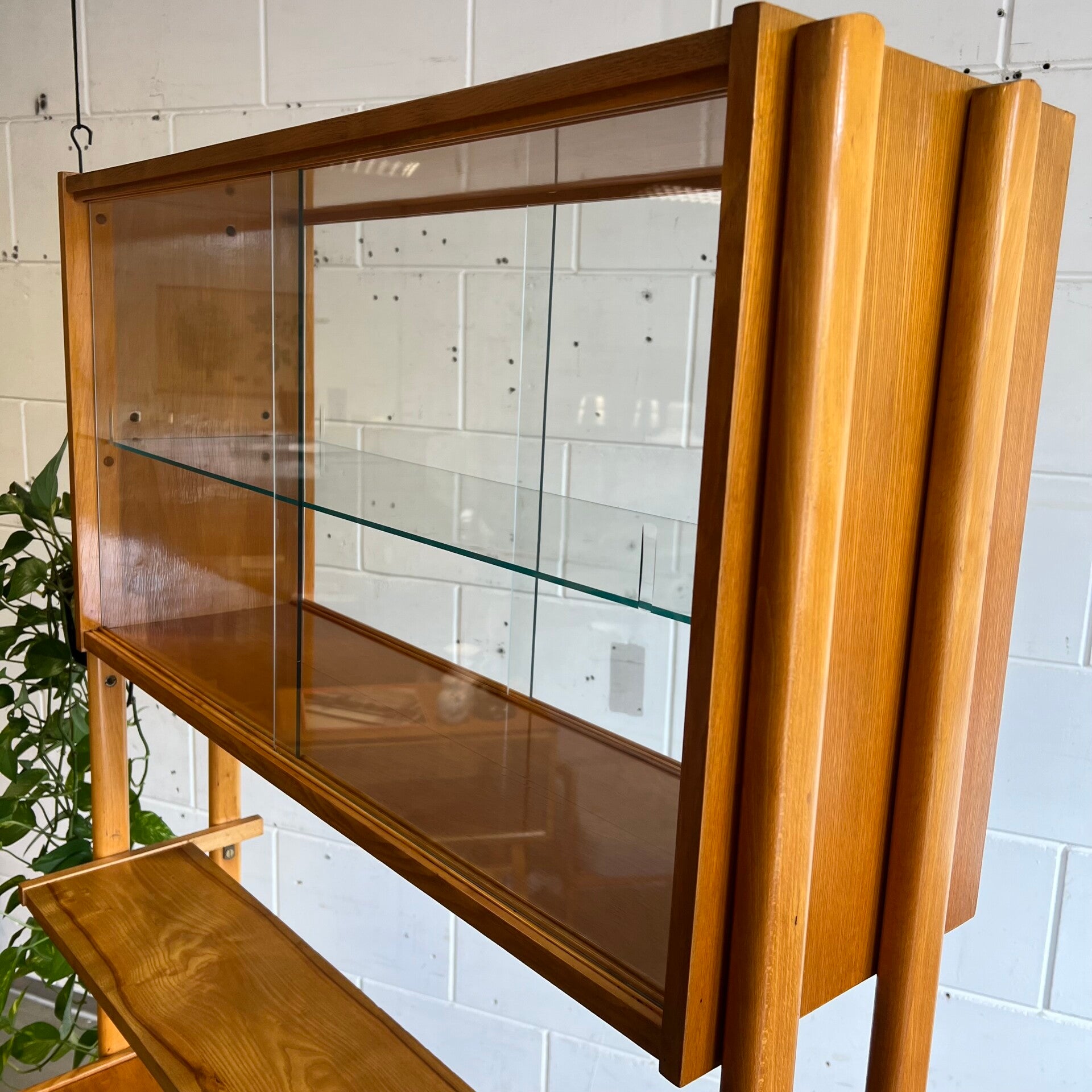 Het meubel heeft bovenin een vitrinekast met aan weerszijden 2 glazen schuifruitjes en een uitneembare glazen plaat (enkele, nauwelijks opvallende, chipjes op de ruitjes).