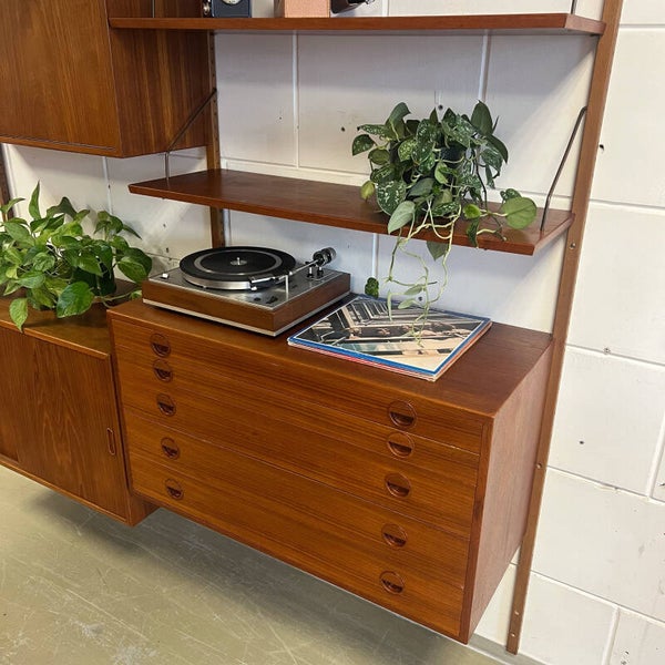 Vintage teakhouten wandmeubel, ontworpen door het Deense design duo Rud Thygesen & Johnny Sørensen voor Hansen & Guldborg (HG Furniture) Denemarken, jaren 60.