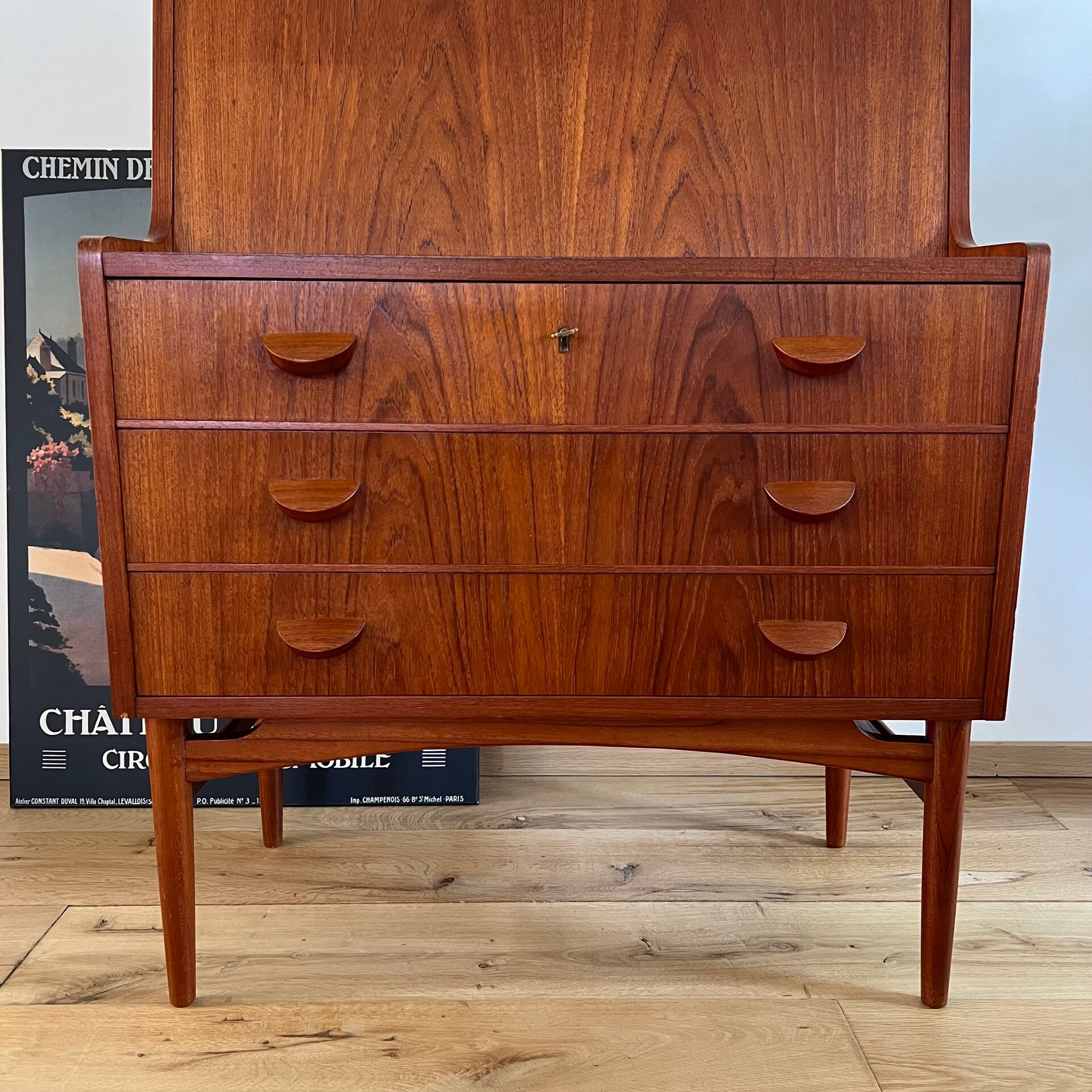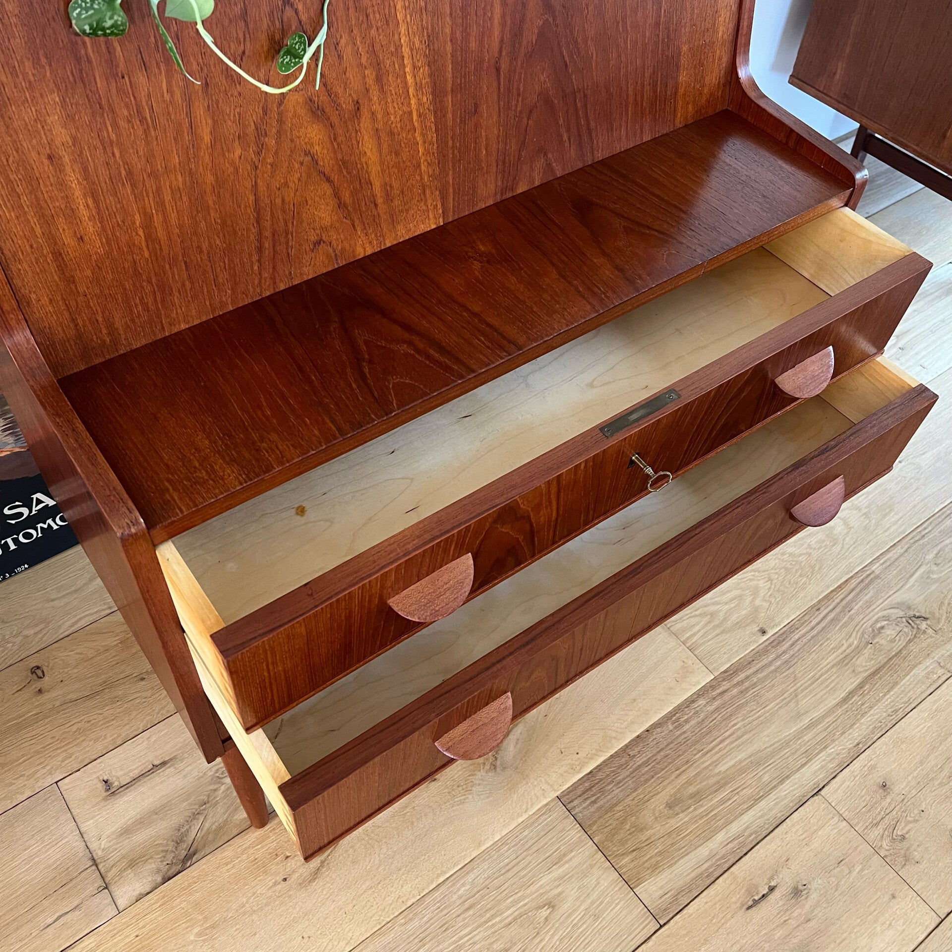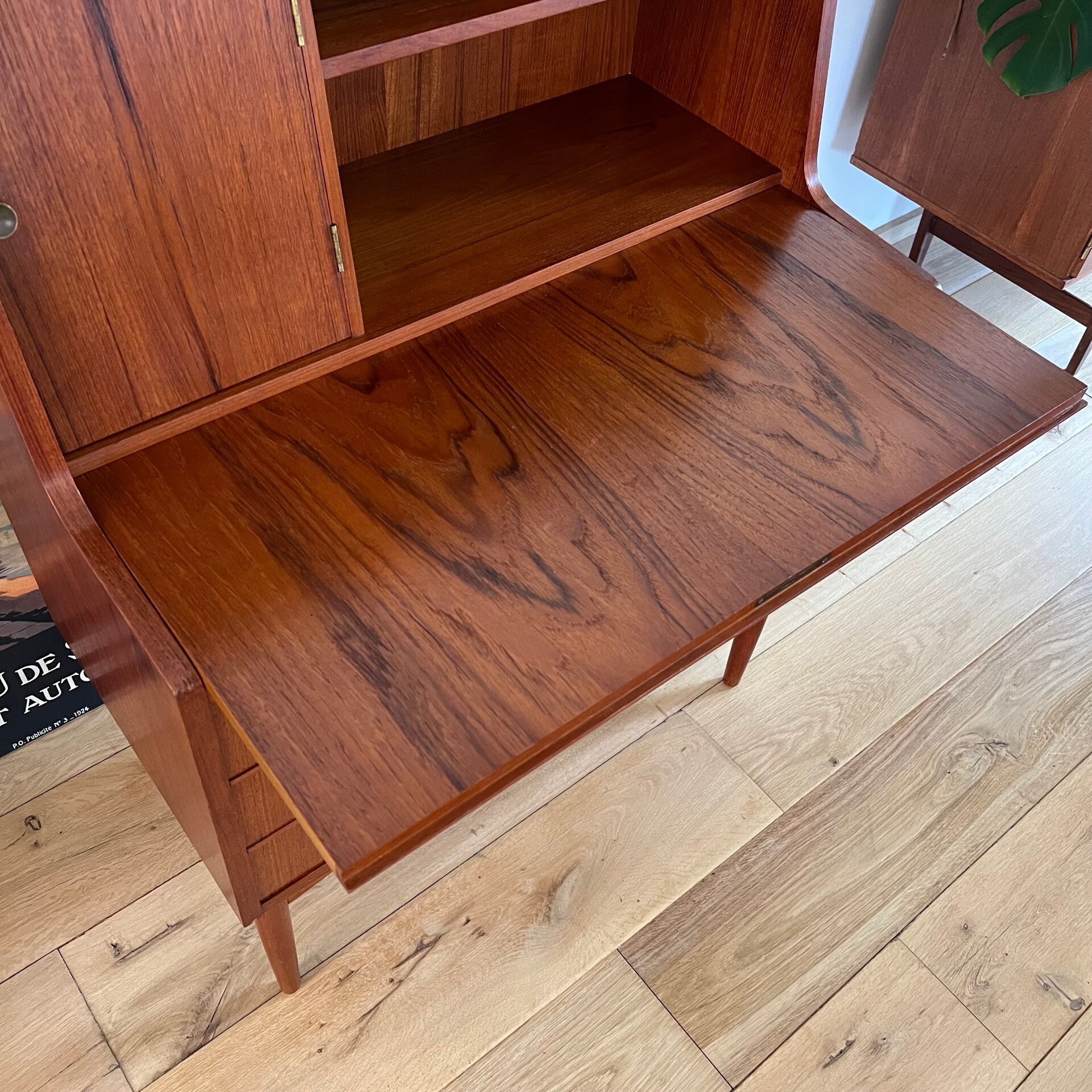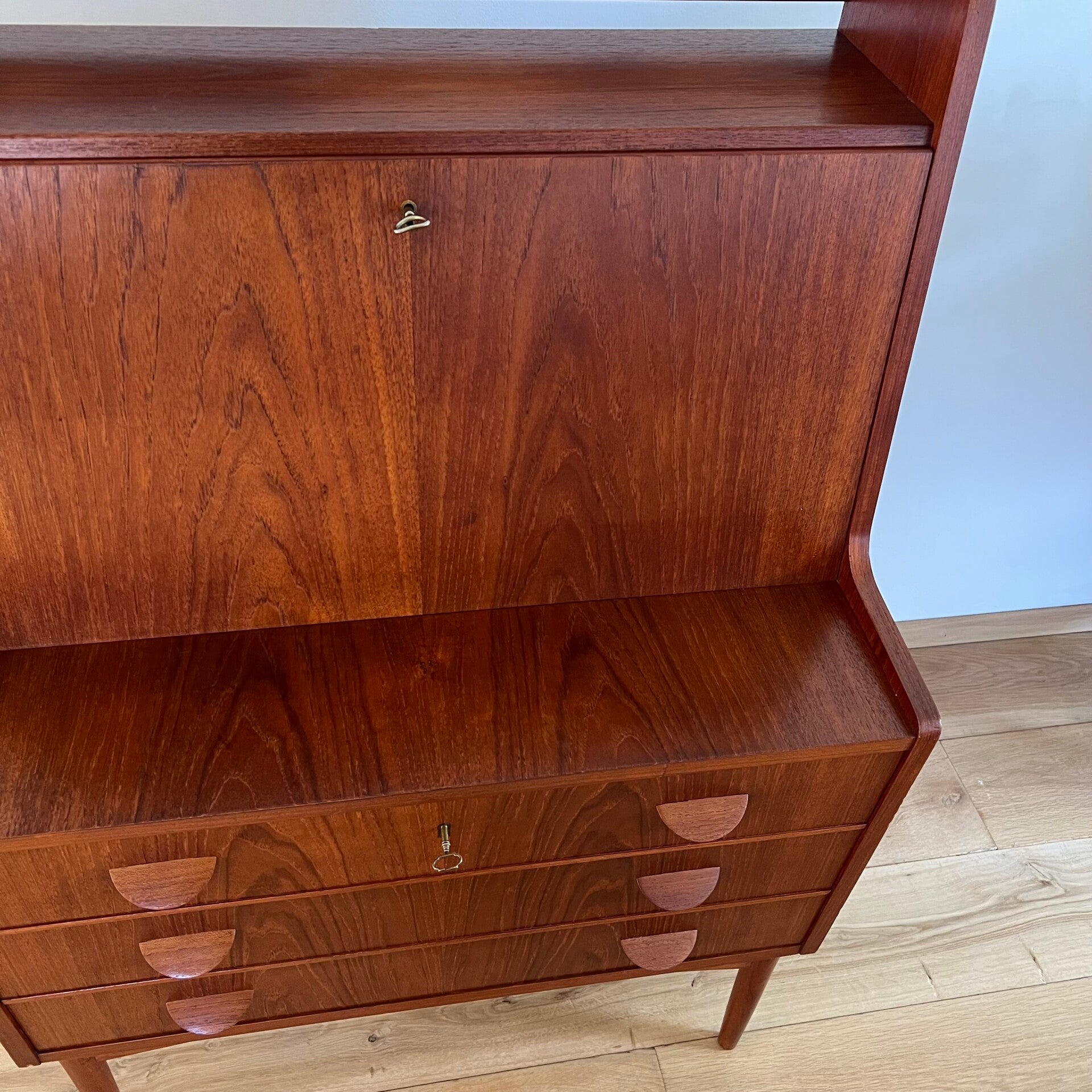 Geweldige vintage secretaire of klepkast, uitgevoerd in teak (fineer).