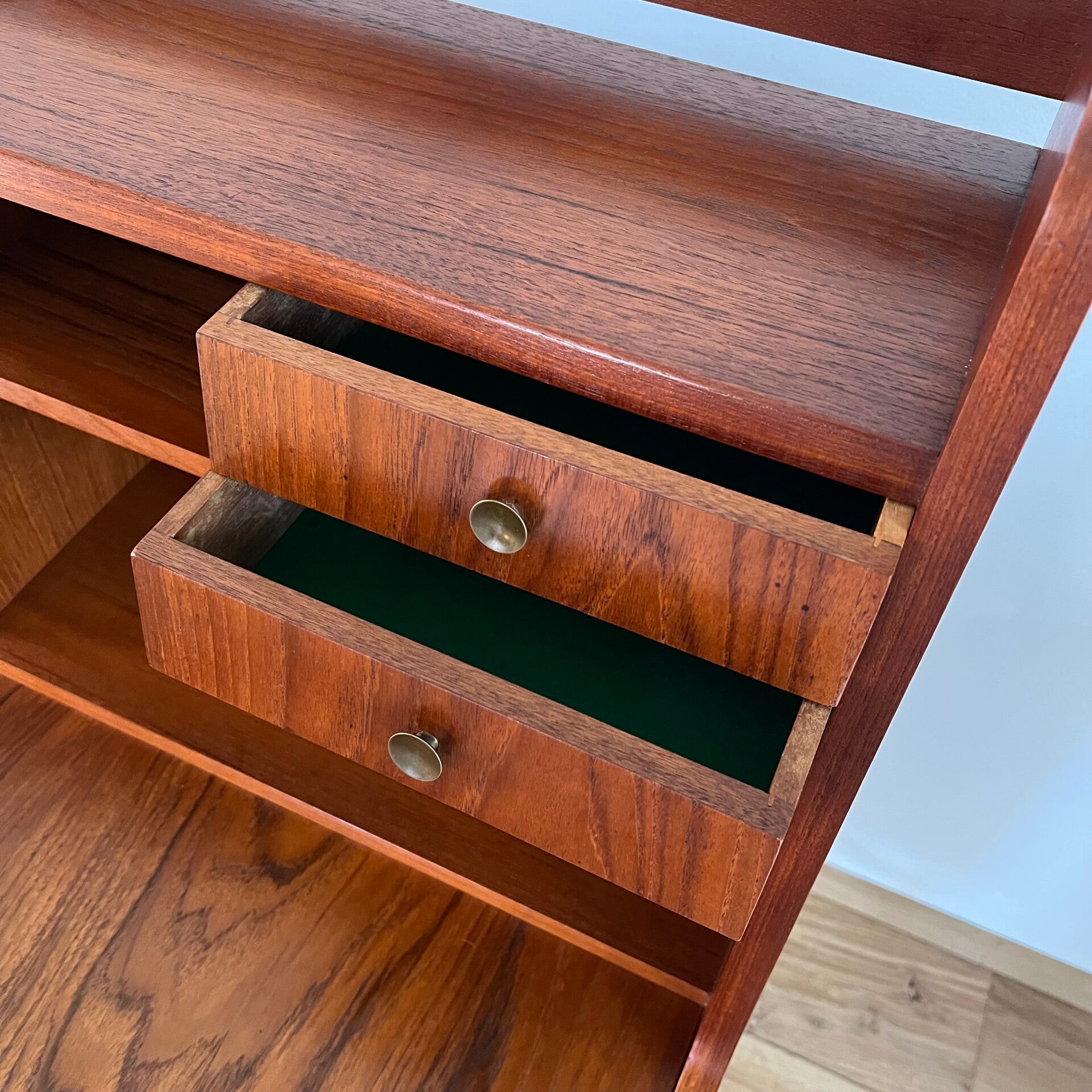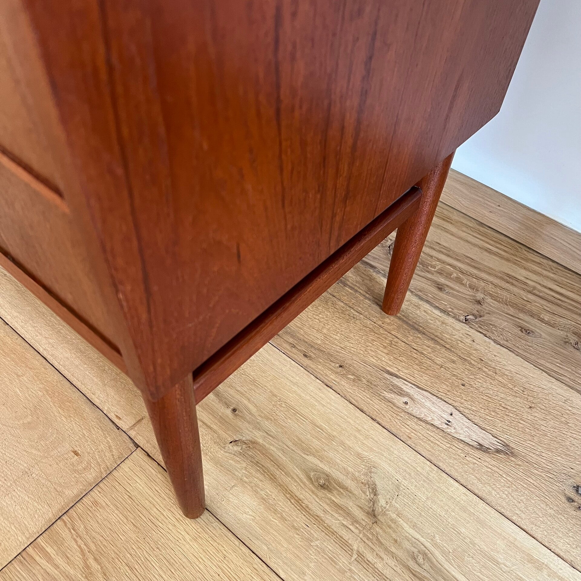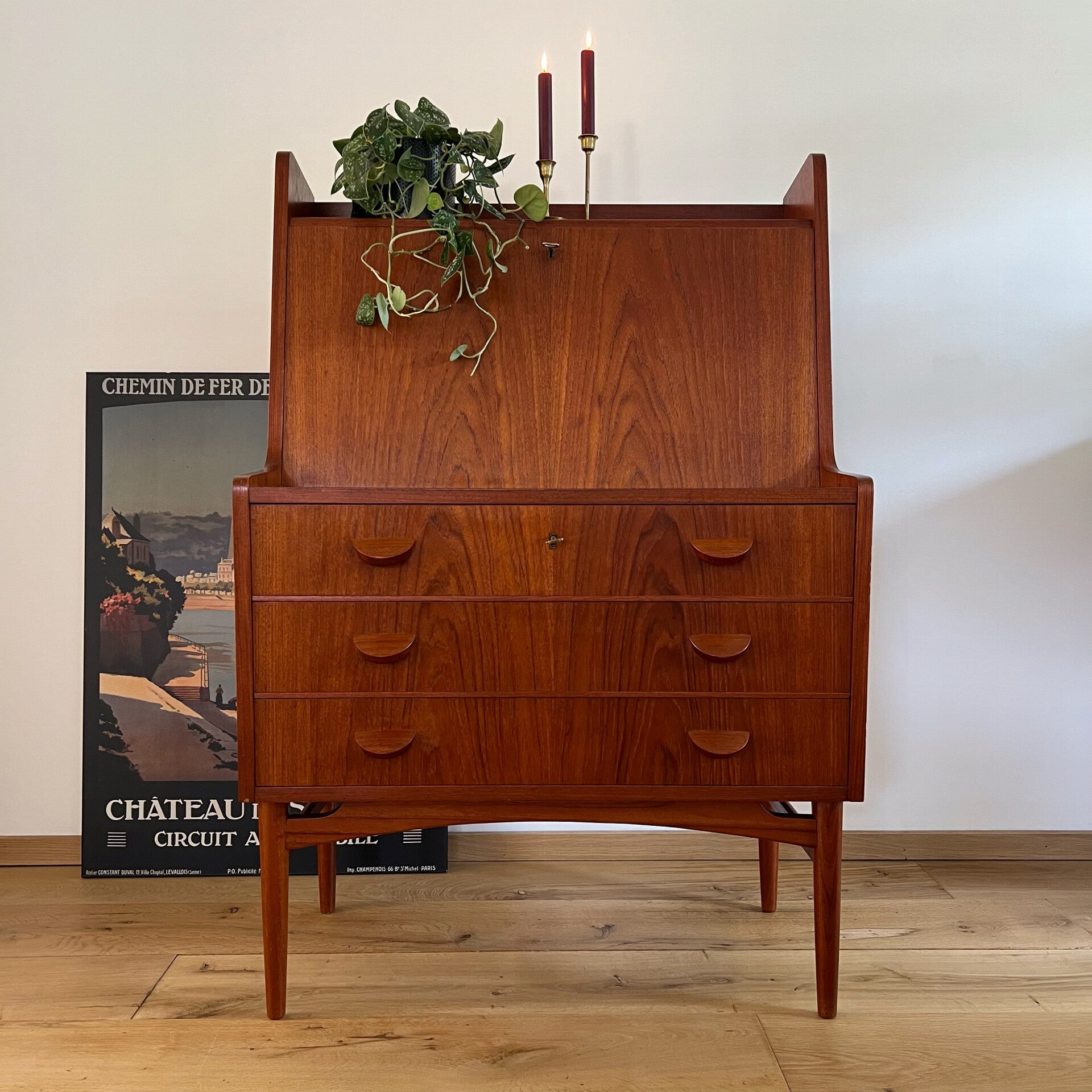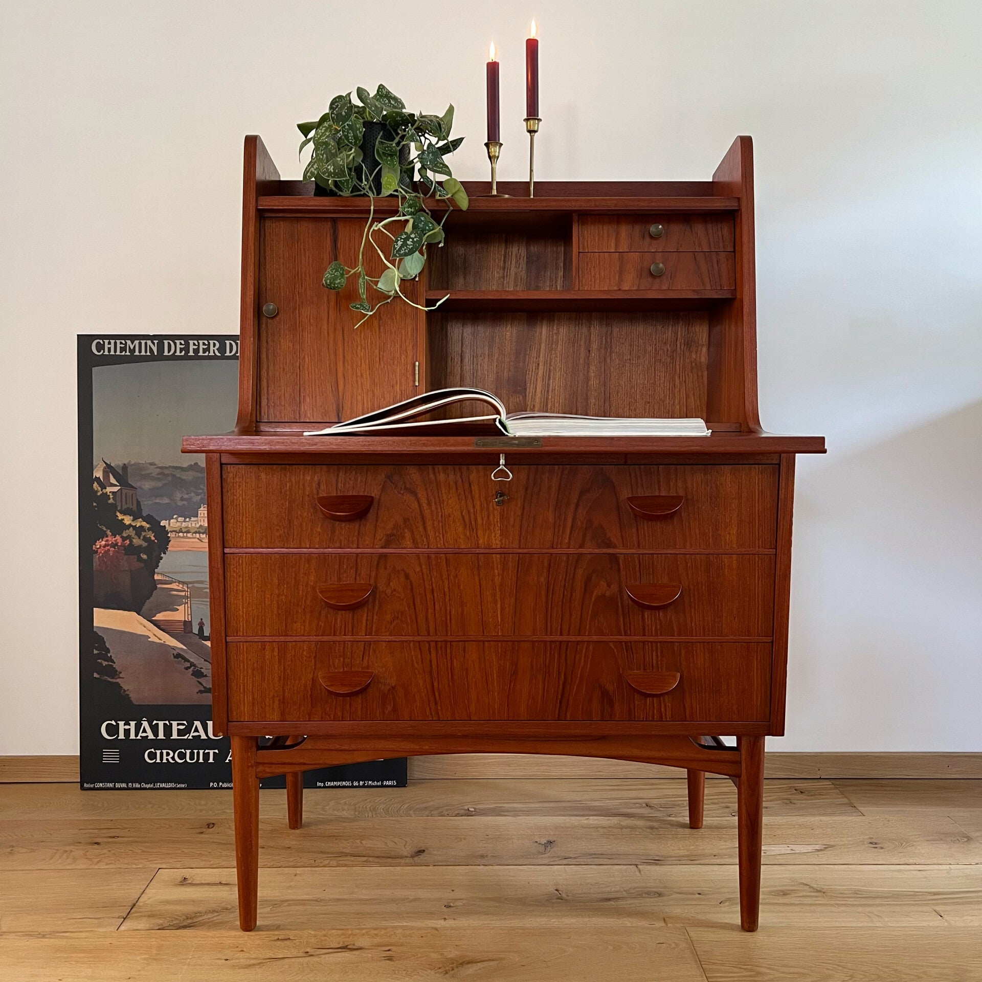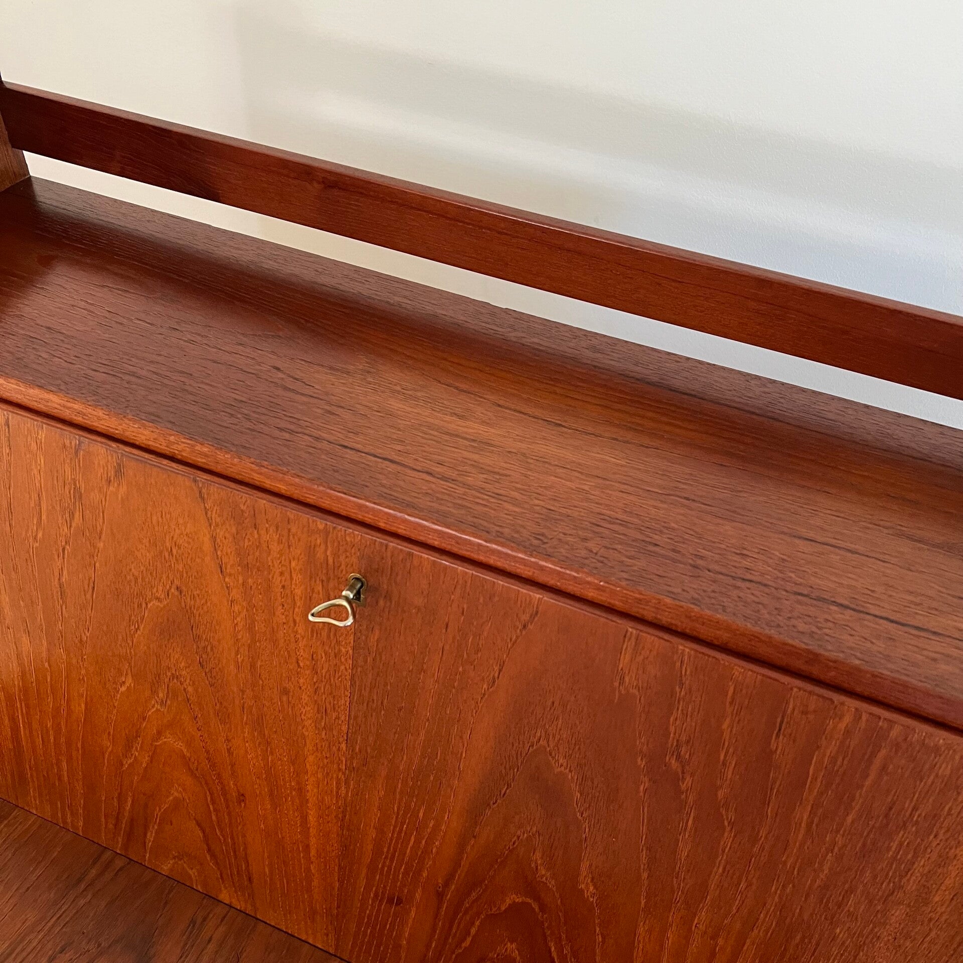 Geweldige vintage secretaire of klepkast, uitgevoerd in teak (fineer).
