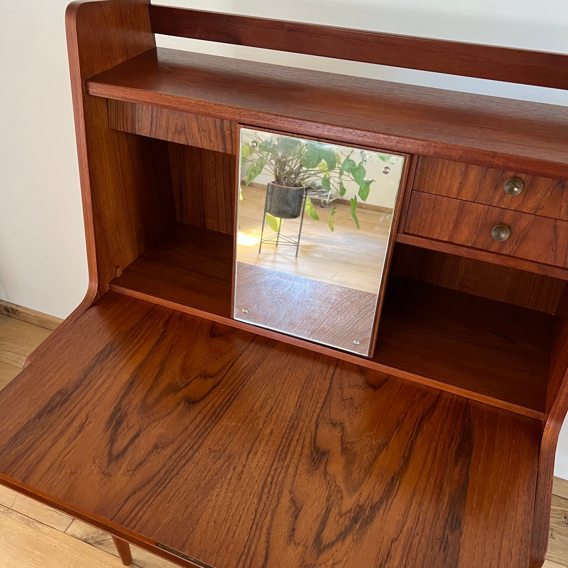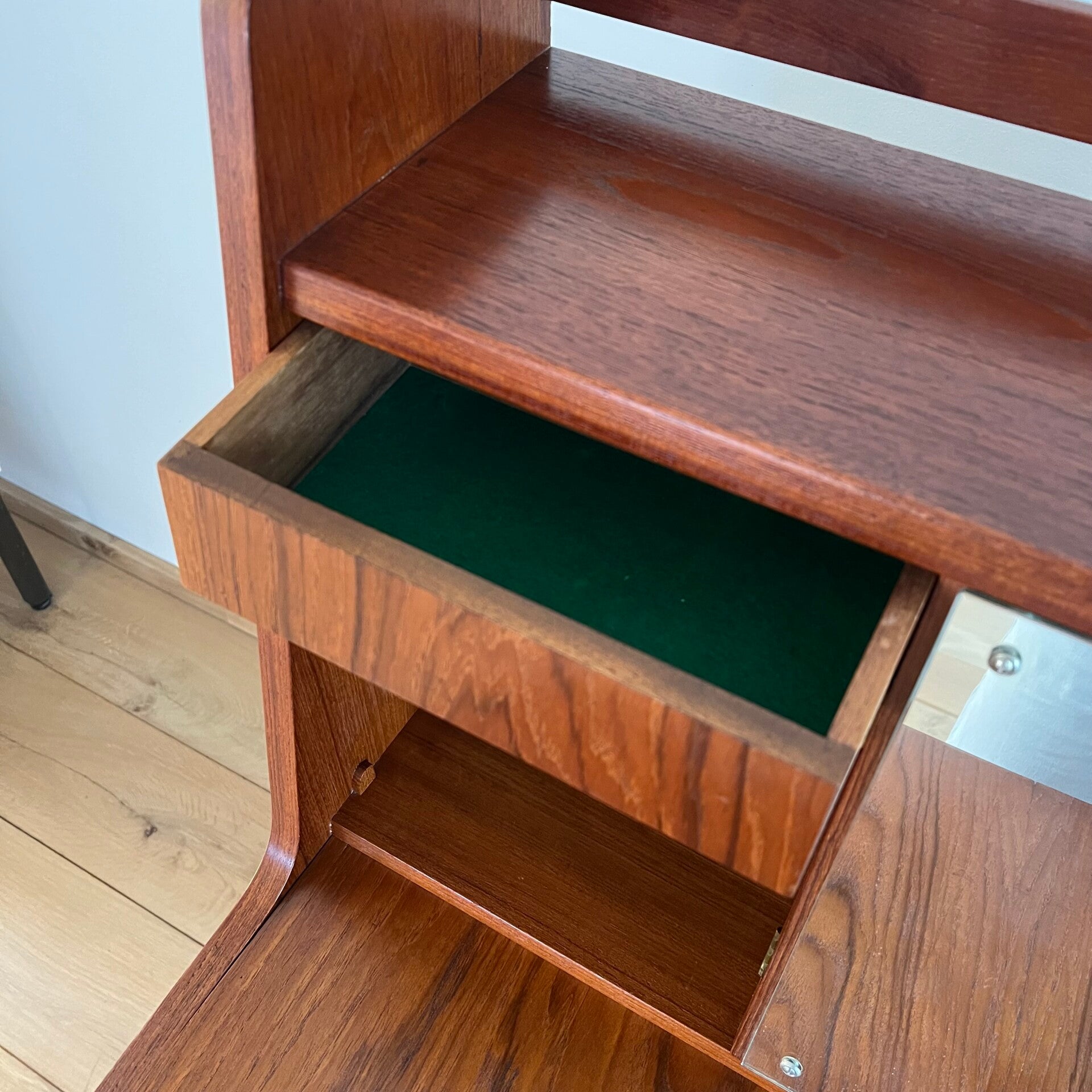 Boven een klep met slot (sleutel aanwezig) welke uitklapt als bureau, met lades en spiegel.