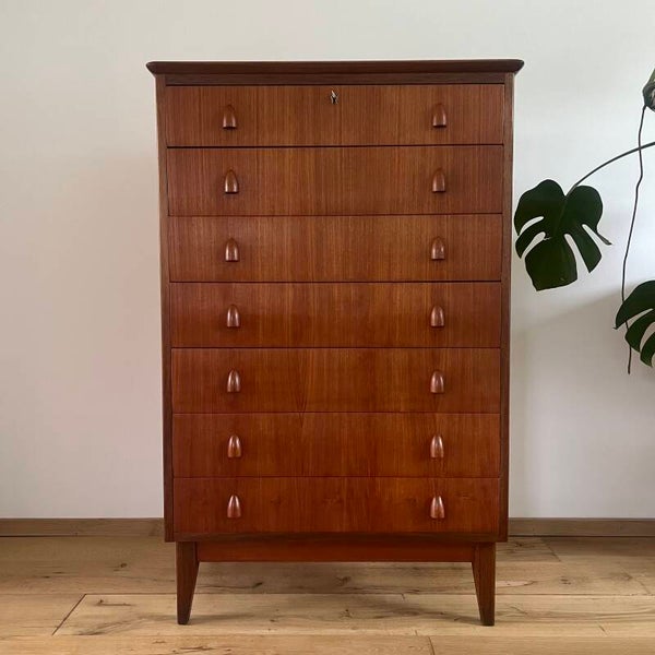 Prachtige vintage hoge ladekast, uitgevoerd in teak (fineer) met mooi gevormde handgrepen en slanke pootjes.