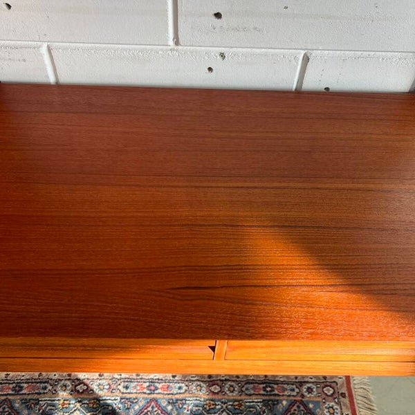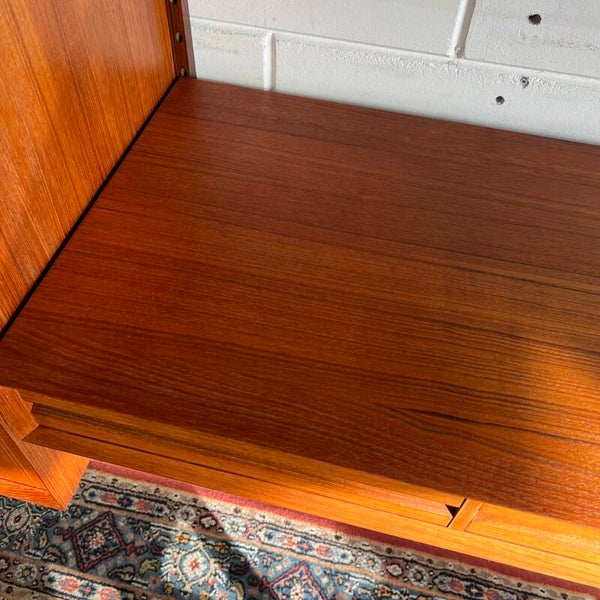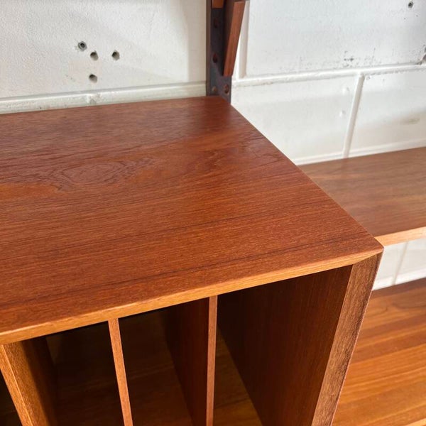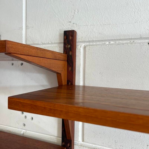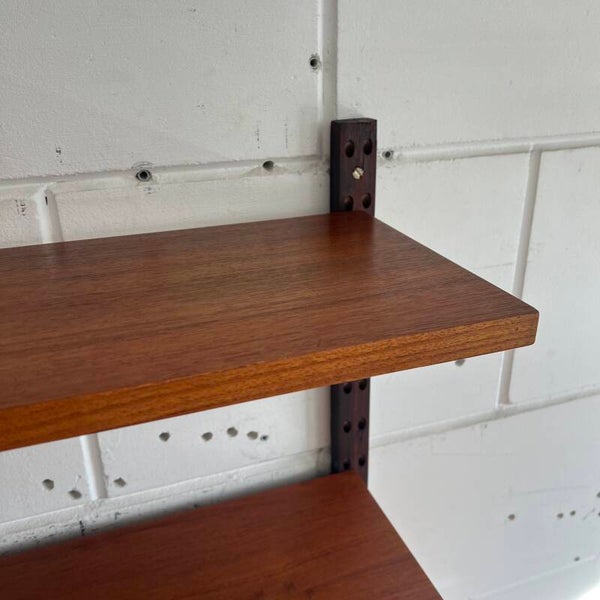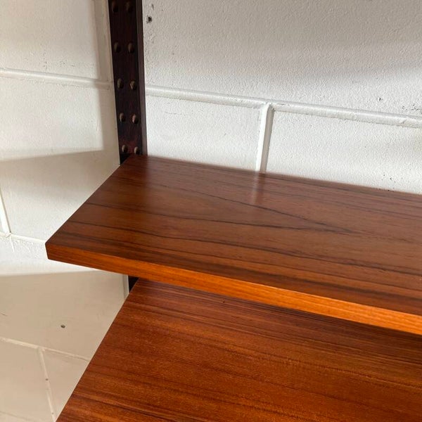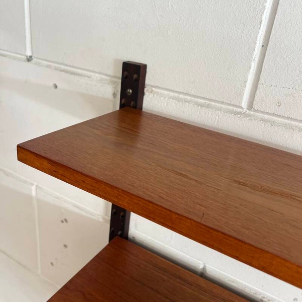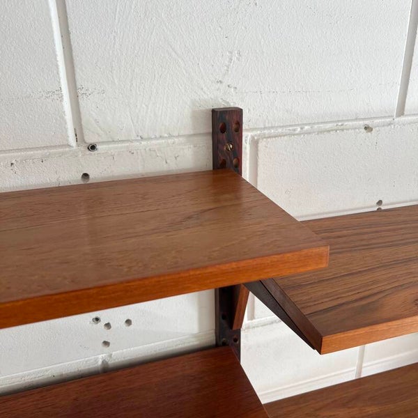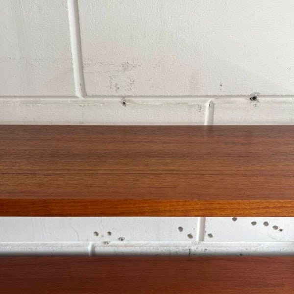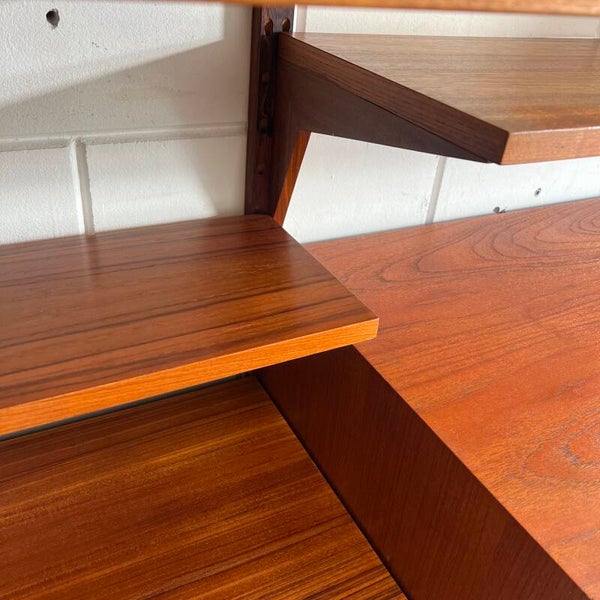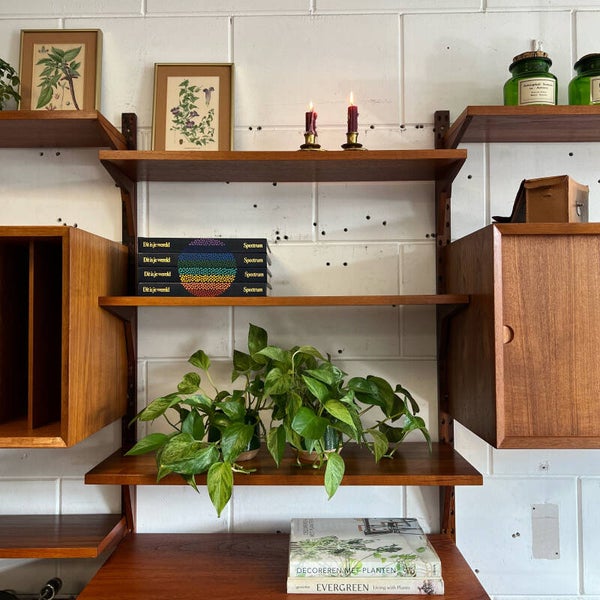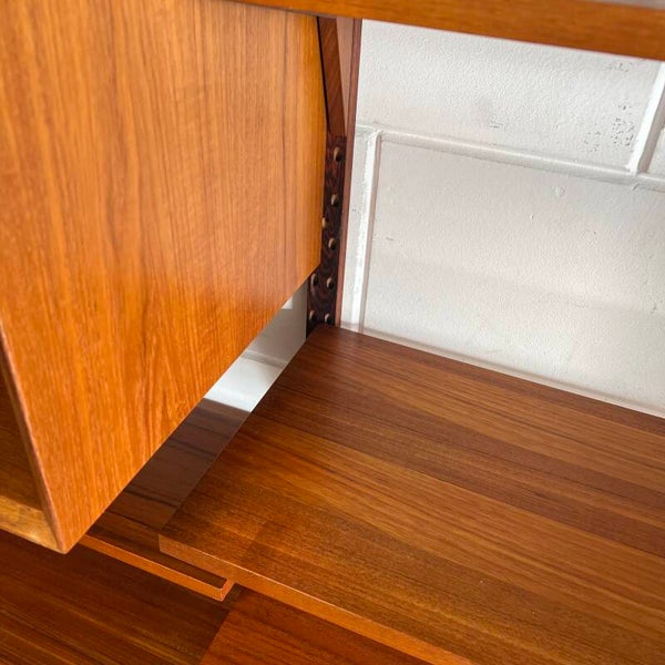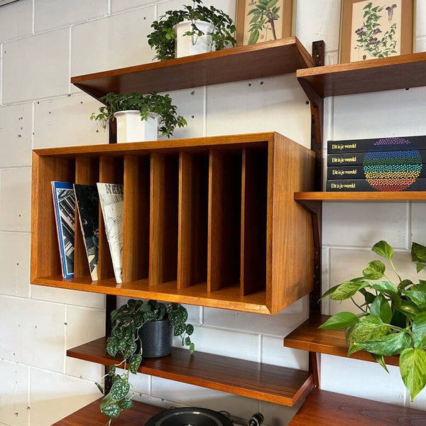 Geweldig vintage wandmeubel, wall unit uitgevoerd in teakhout met houten dragers.