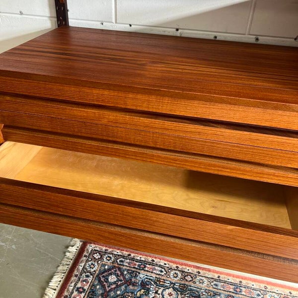 Wandlatten zijn bij het systeem gezocht (erg moeilijk te verkrijgen) en zijn in palissander en teak uitgevoerd. Niet overal even netjes (fineerschade rondom openingen) maar hangend in het systeem is dit niet zichtbaar.