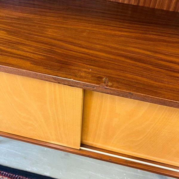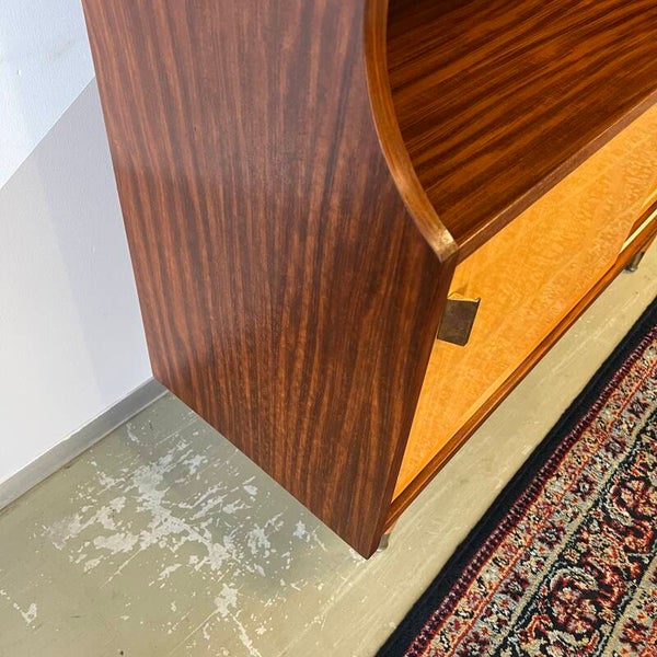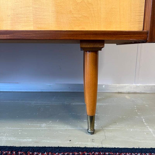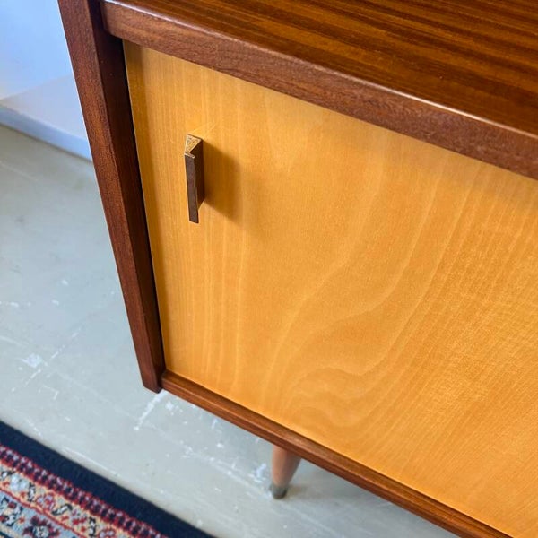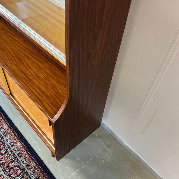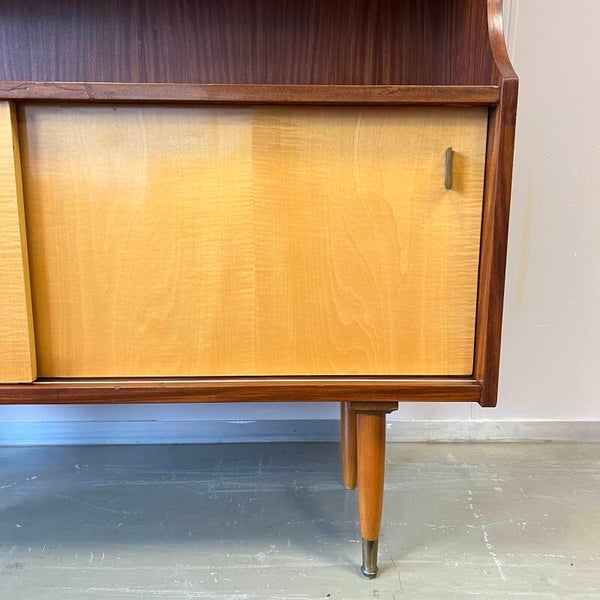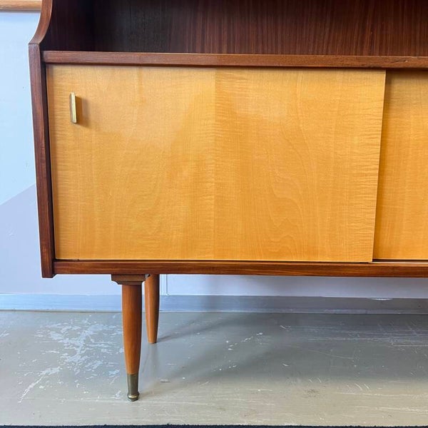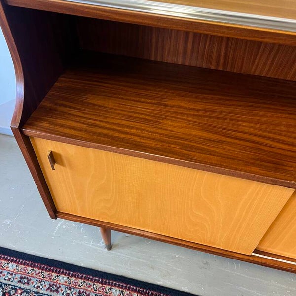Mooie vintage buffetkast, vitrinekast in donker gefineerd hout met lichte contrasterende elementen.