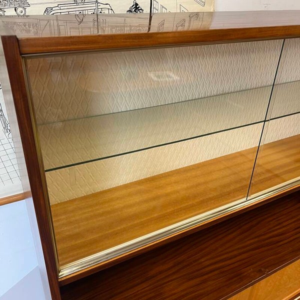 Het meubel heeft bovenin een vitrinedeel met glazen schuifruitjes, glazen uitneembare plaat en kussenwand.