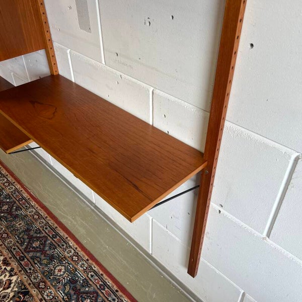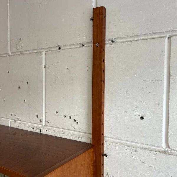 Prachtig vintage teakhouten wandsysteem, PS system, met zwart metalen beugels.