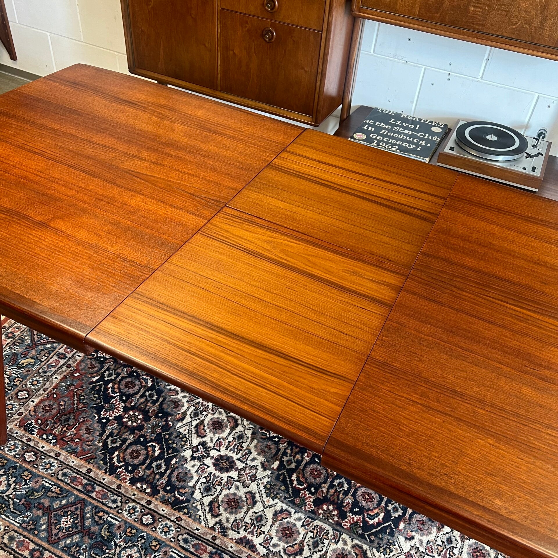 Mooie vintage eethoek, bestaande uit een verlengbare eettafel en 6 stoelen in teak (massief / fineer).