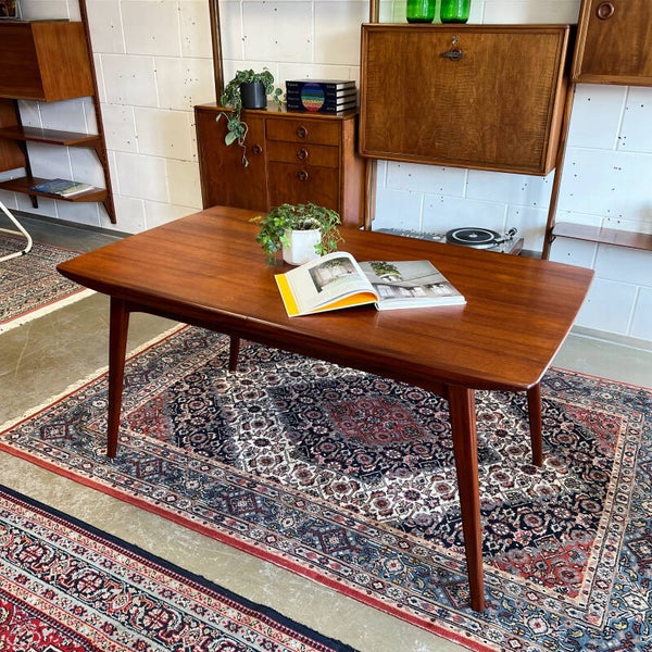 De tafel heeft mooie schuine poten en een elegant model. Klapblad waarmee de tafel met 40 cm verlengd kan worden. Enkele lichte gebruikerssporen op het blad.