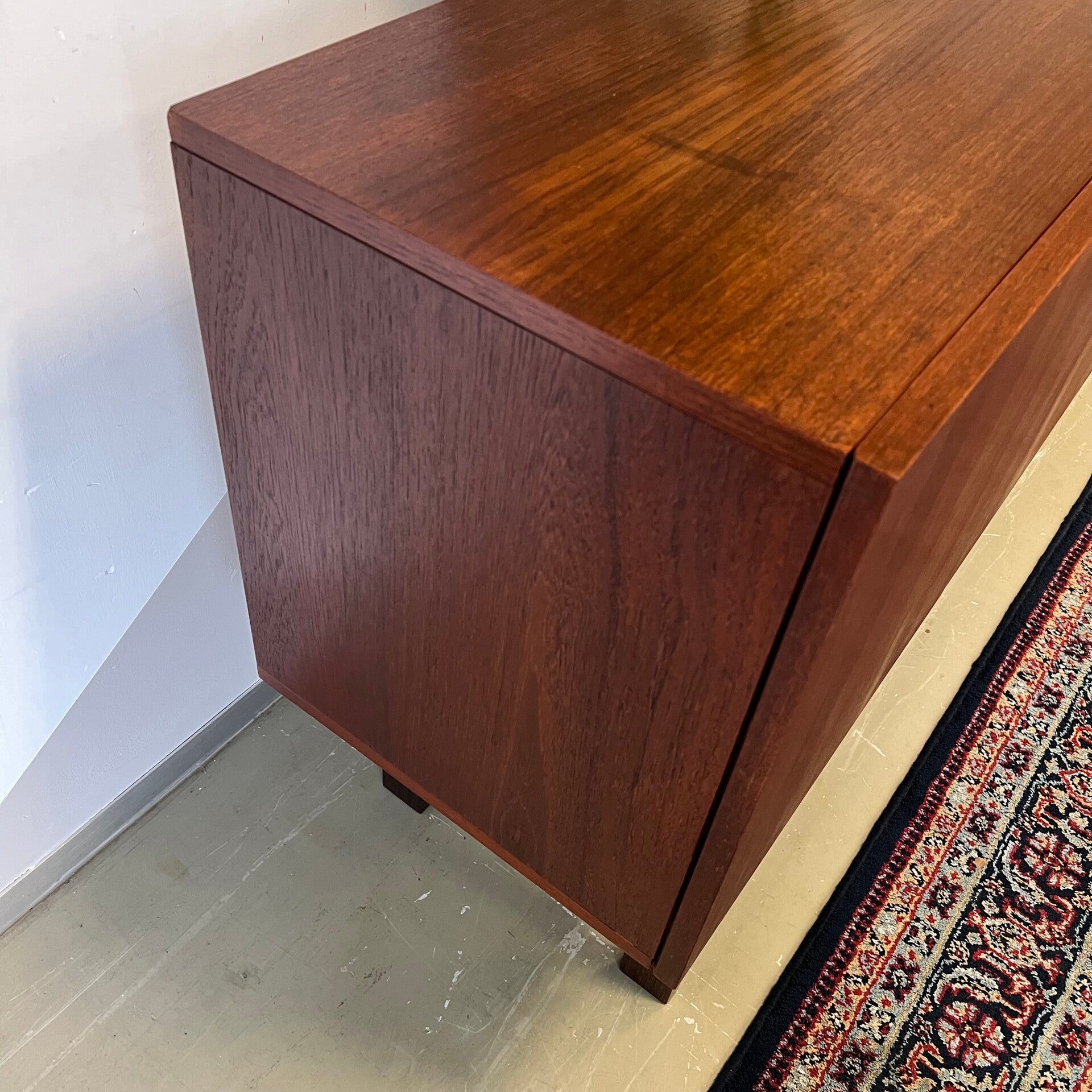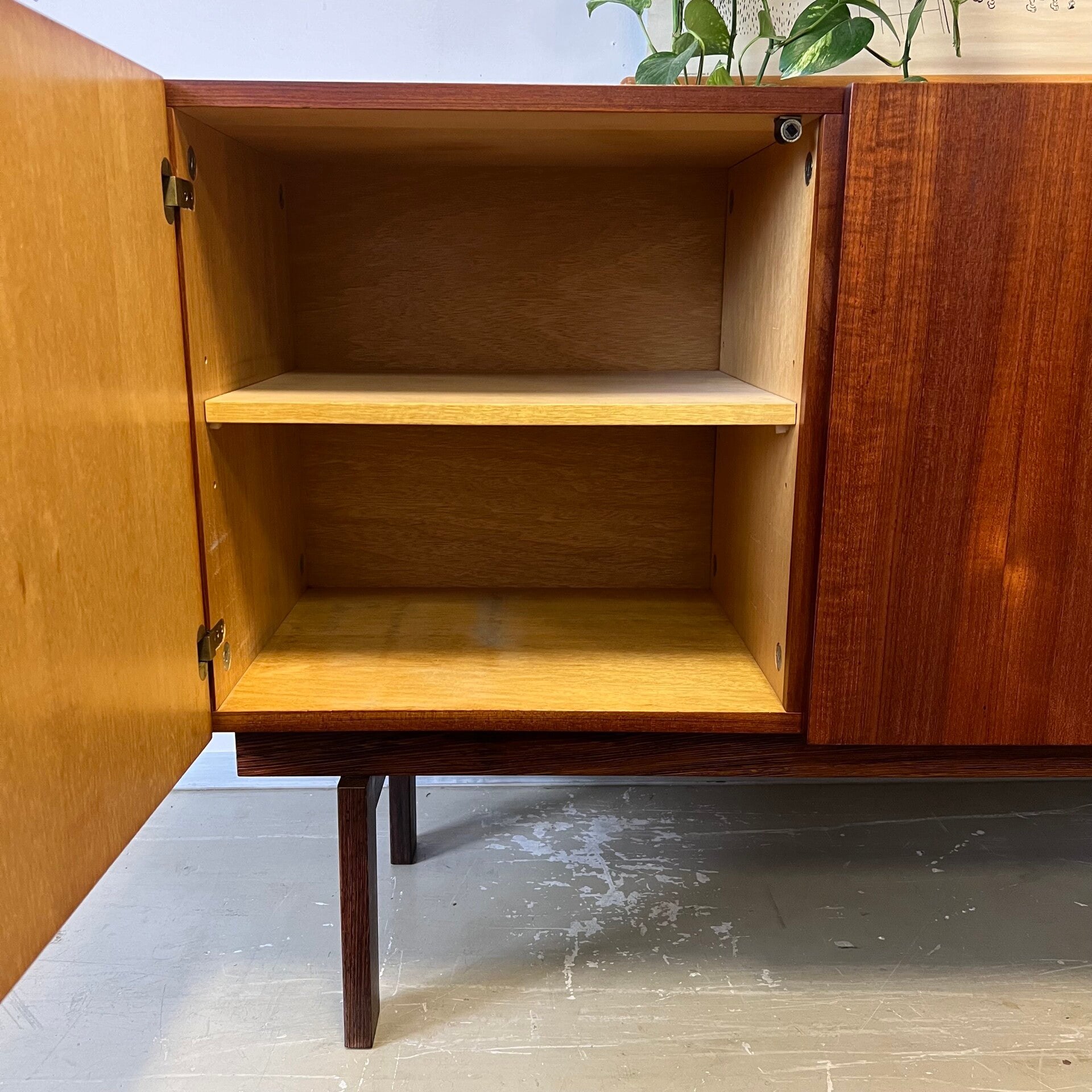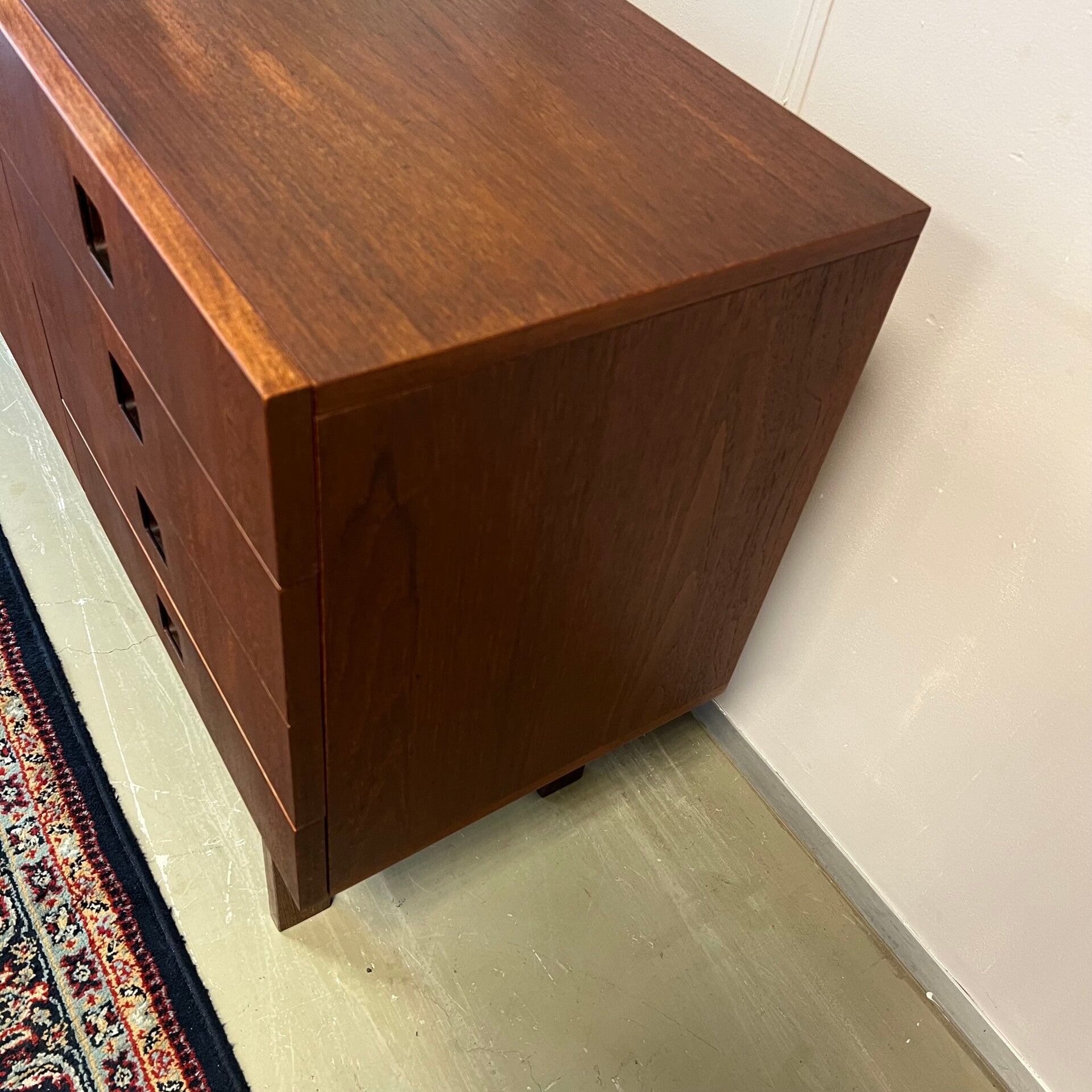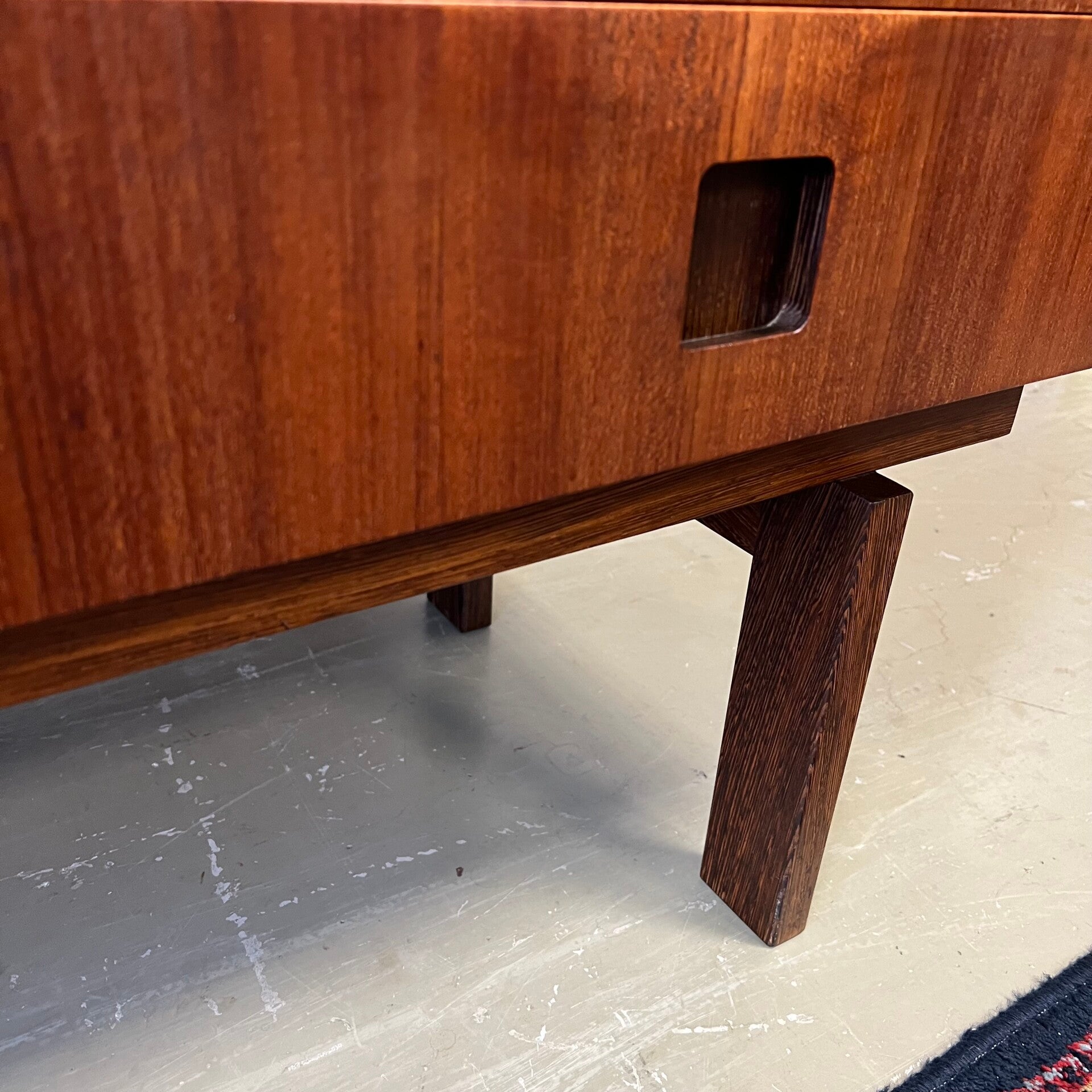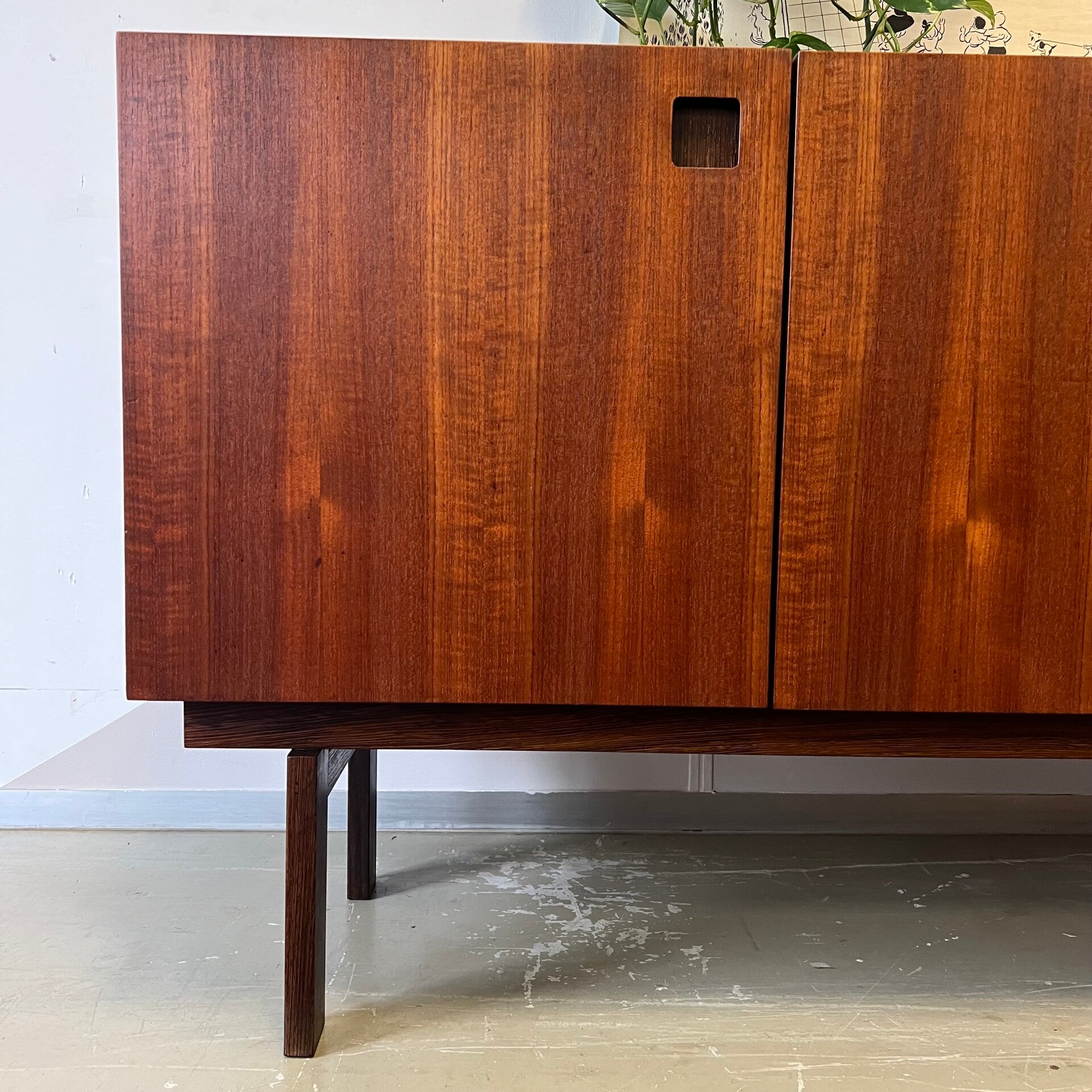 Uitgevoerd in teak (fineer) met wengé onderstel en handgrepen. Interieur uit berkenhout.