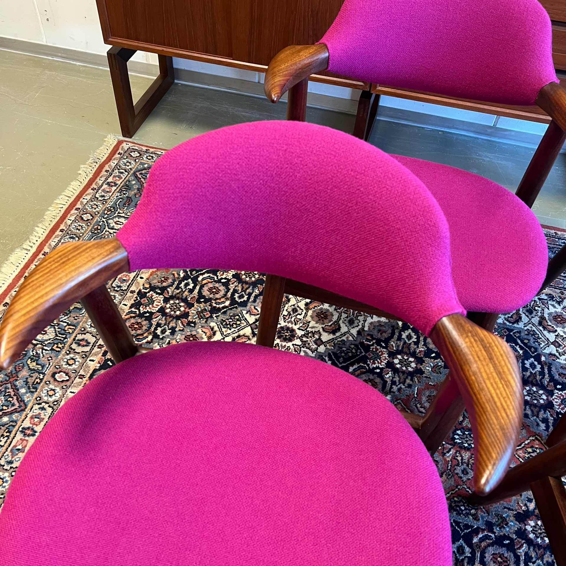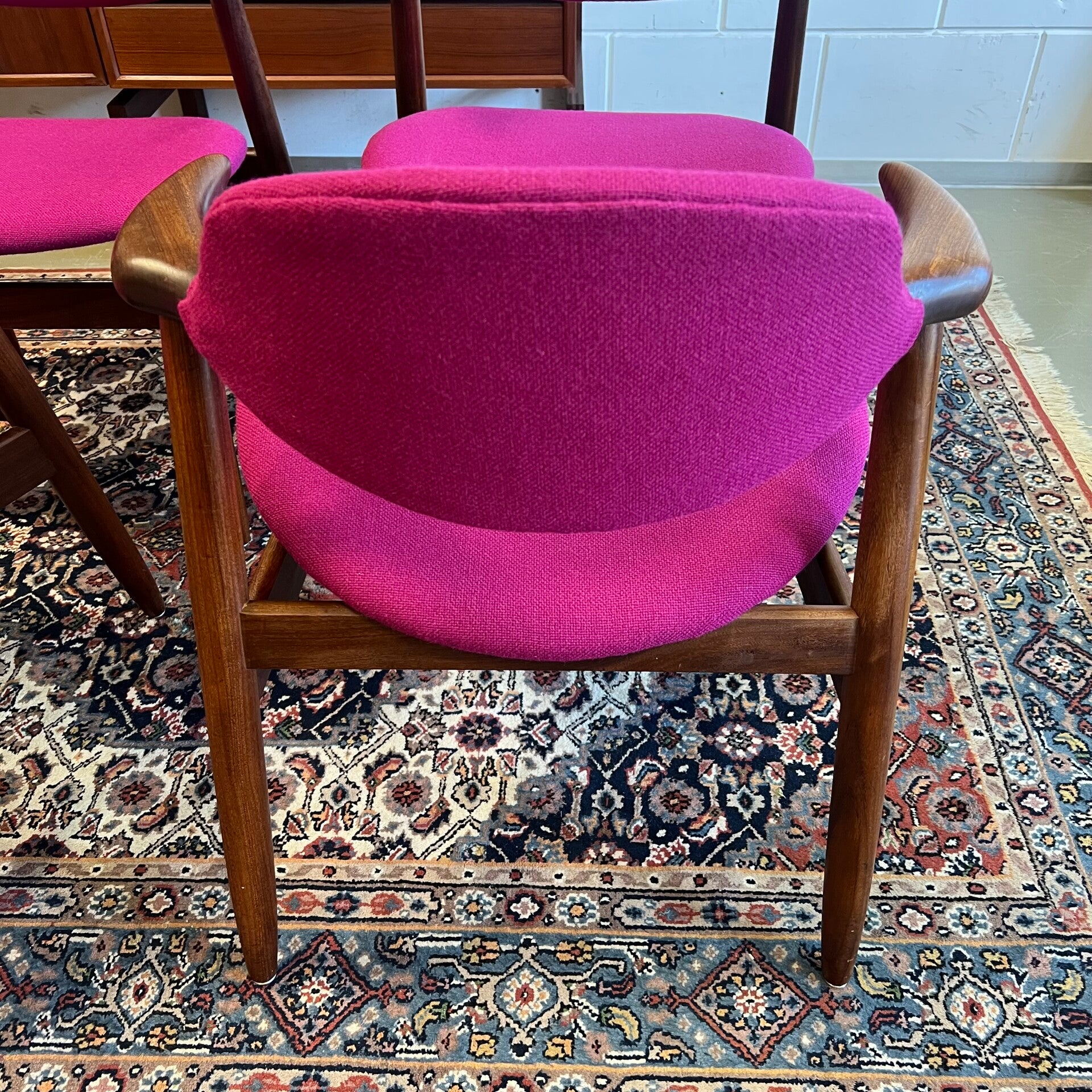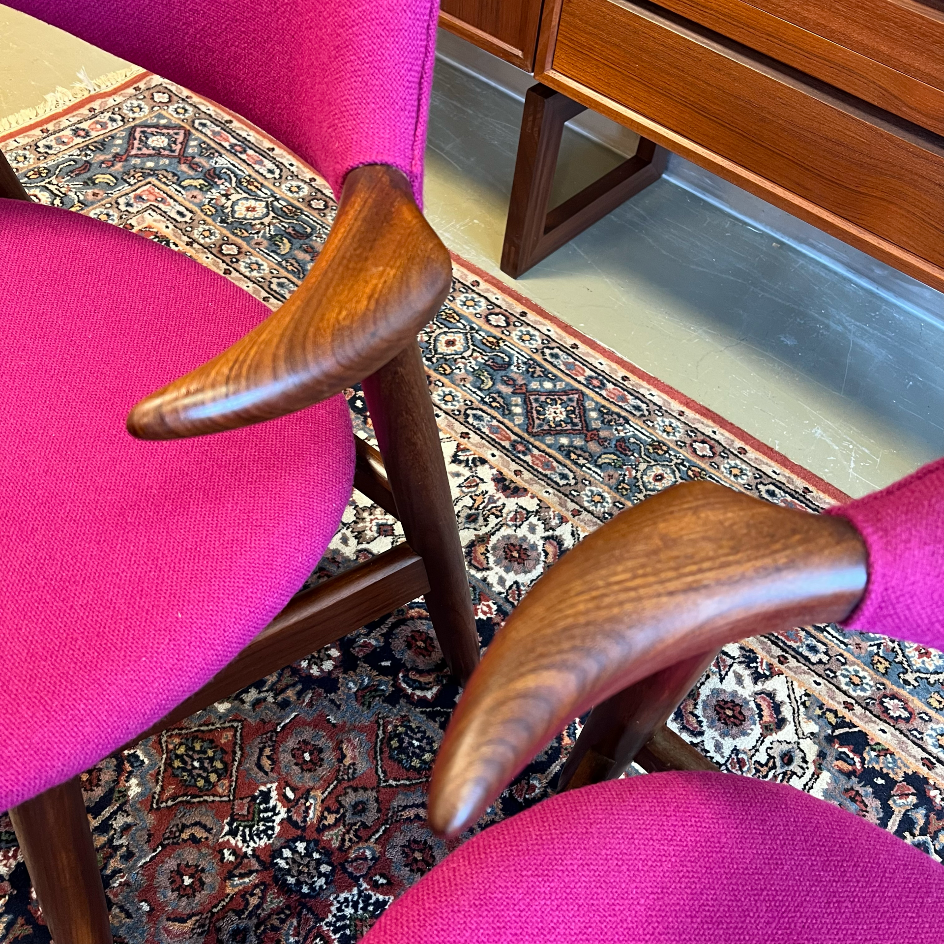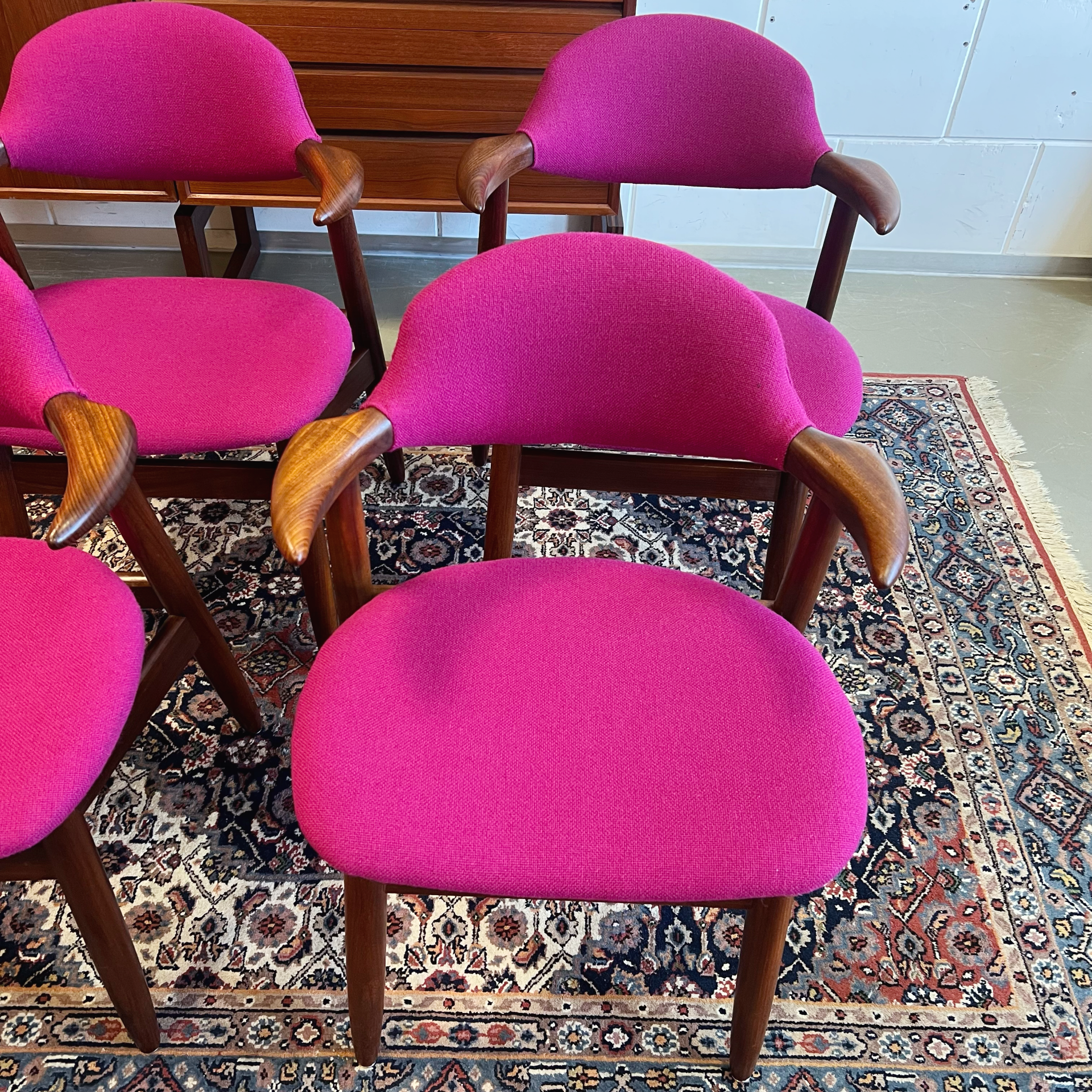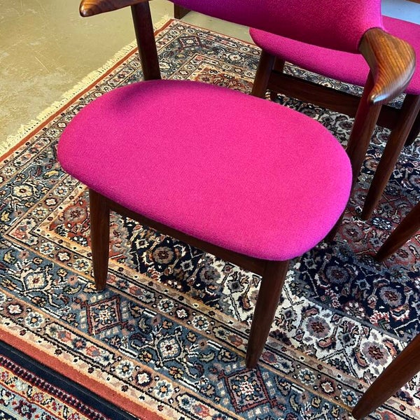 De stoelen zijn volledig gerestaureerd en voorzien van een hoge kwaliteit Kvadrant stof in de kleur Hallingdal 65 563. Prachtig in combinatie met het teakhouten frame!