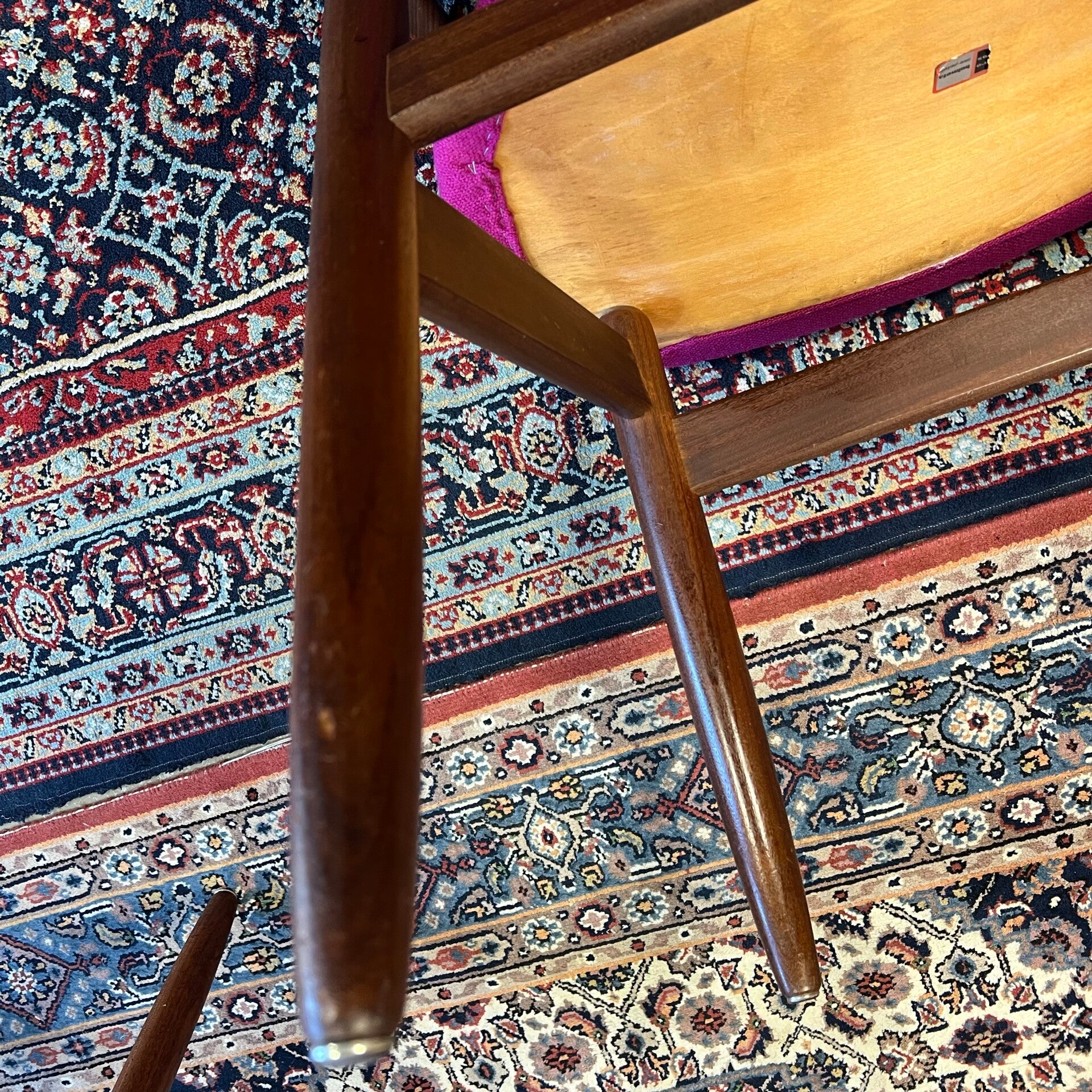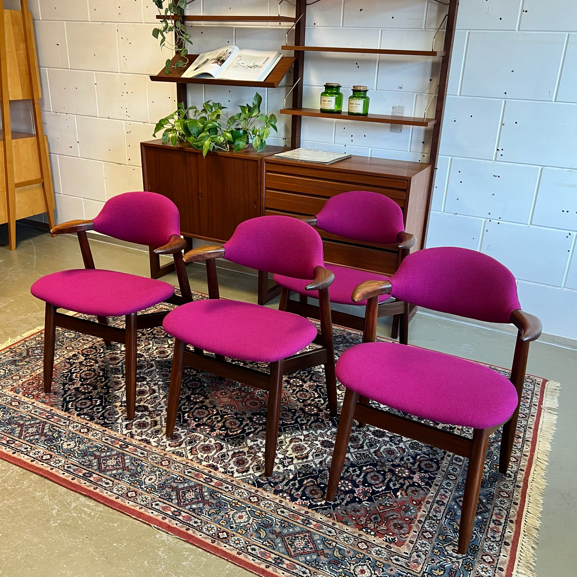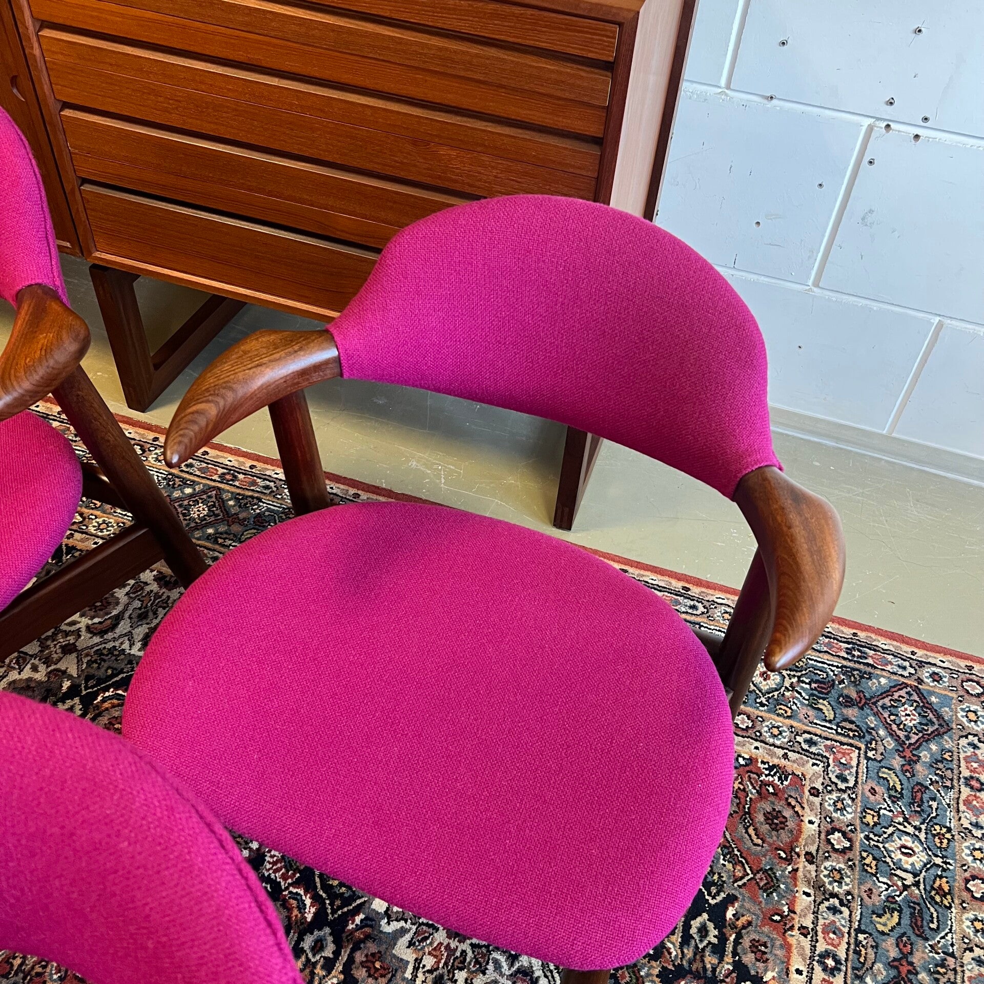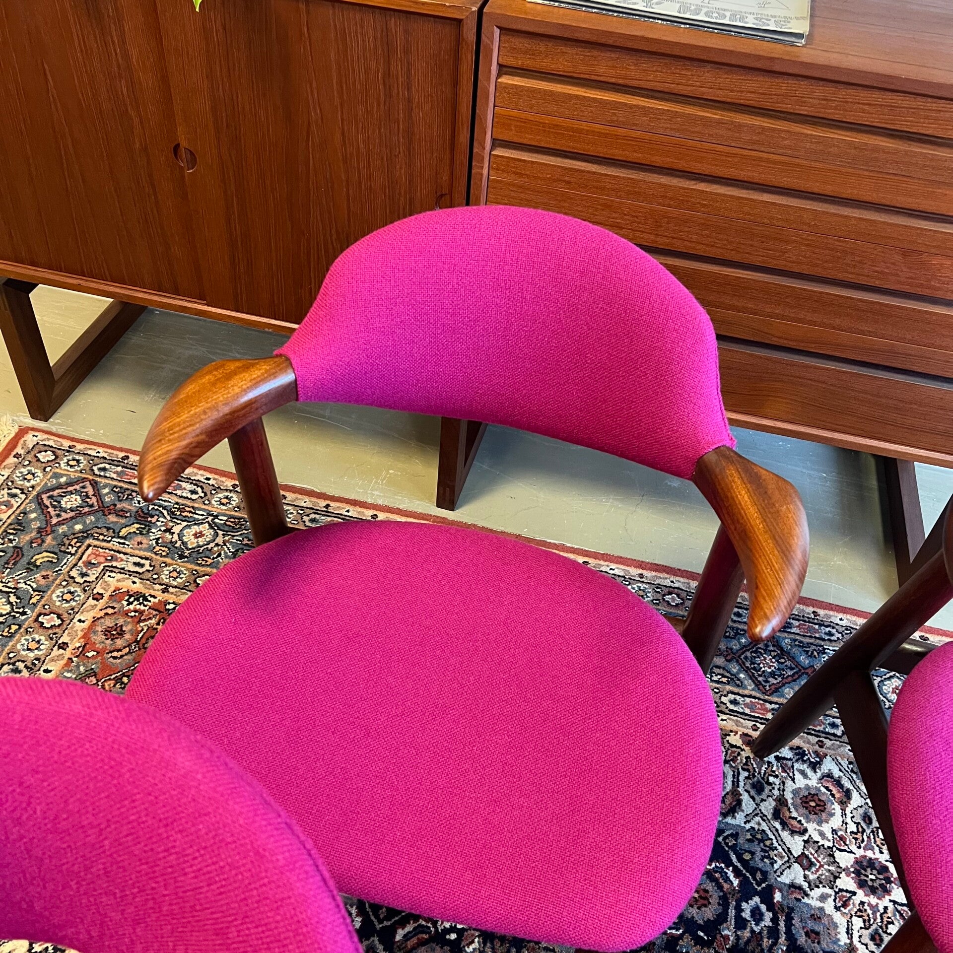De stoelen zijn volledig gerestaureerd en voorzien van een hoge kwaliteit Kvadrant stof in de kleur Hallingdal 65 563. Prachtig in combinatie met het teakhouten frame!