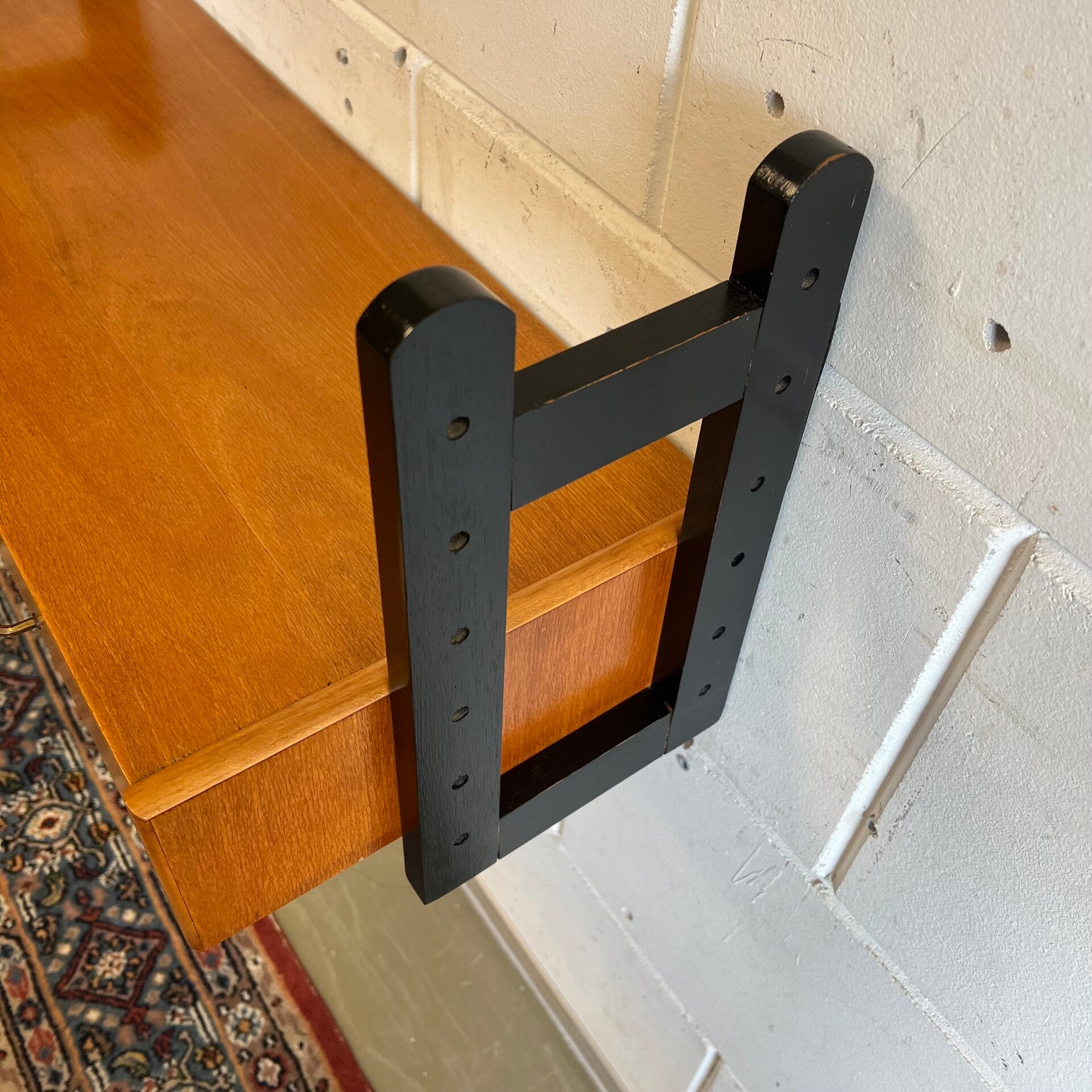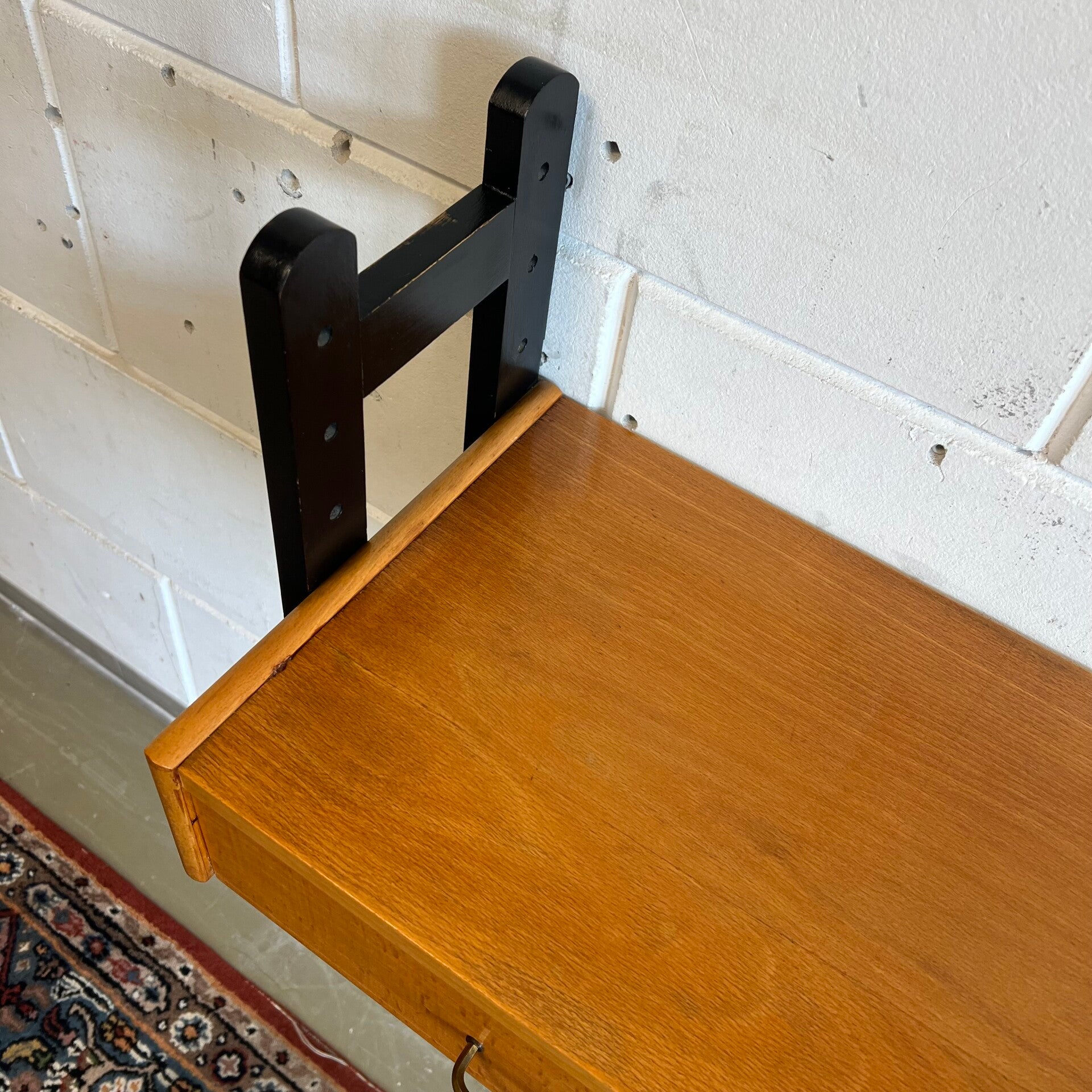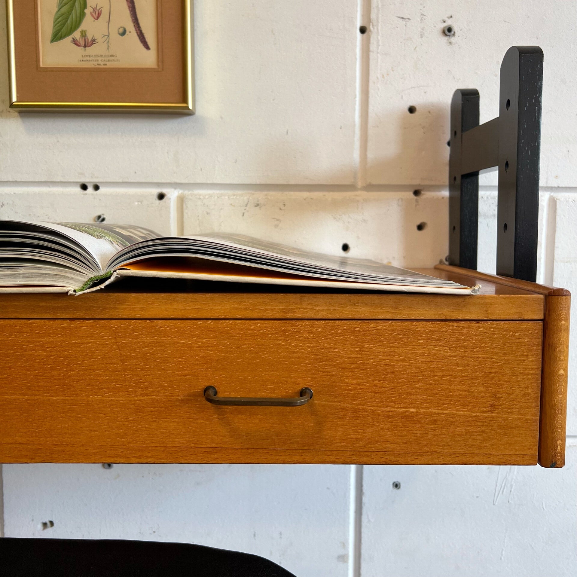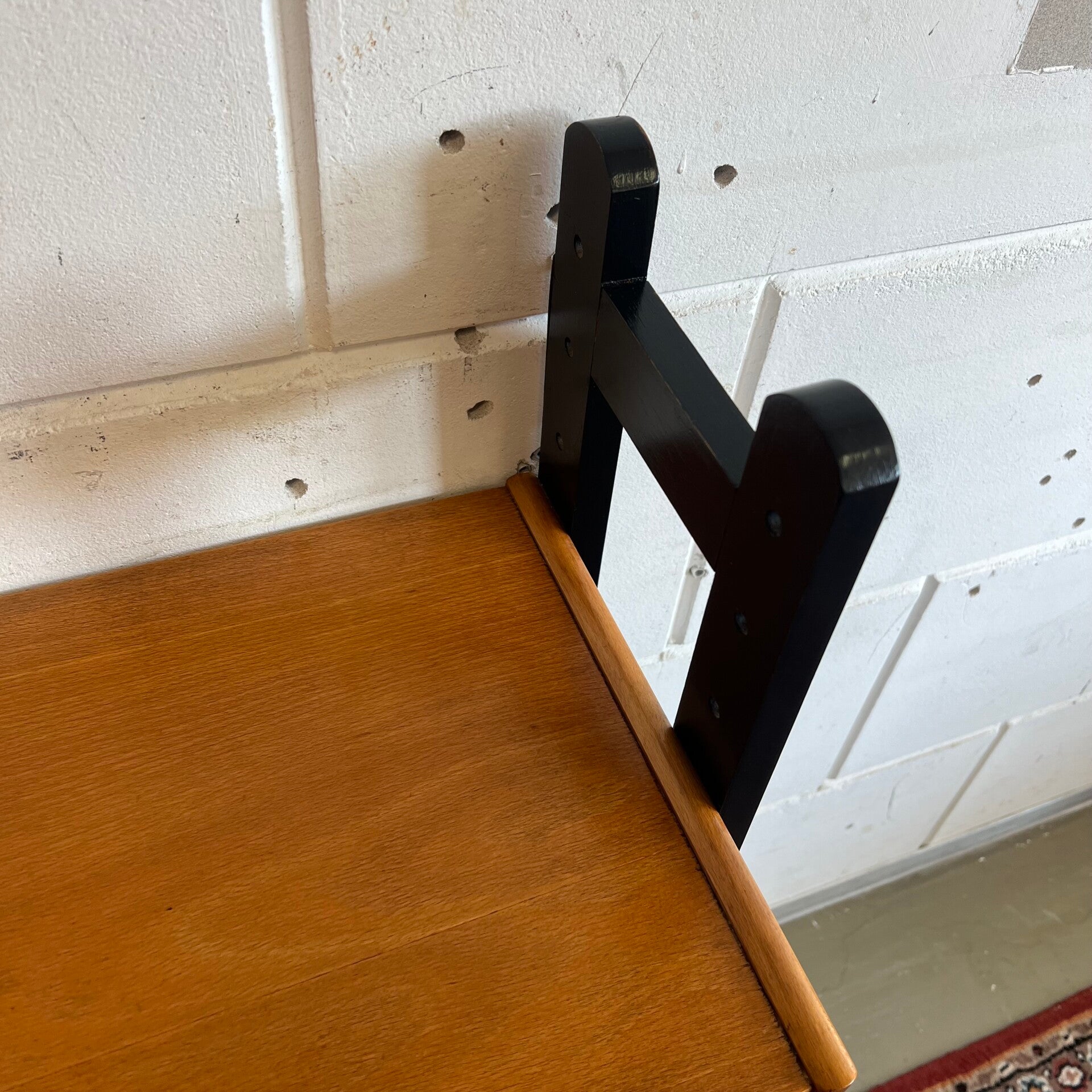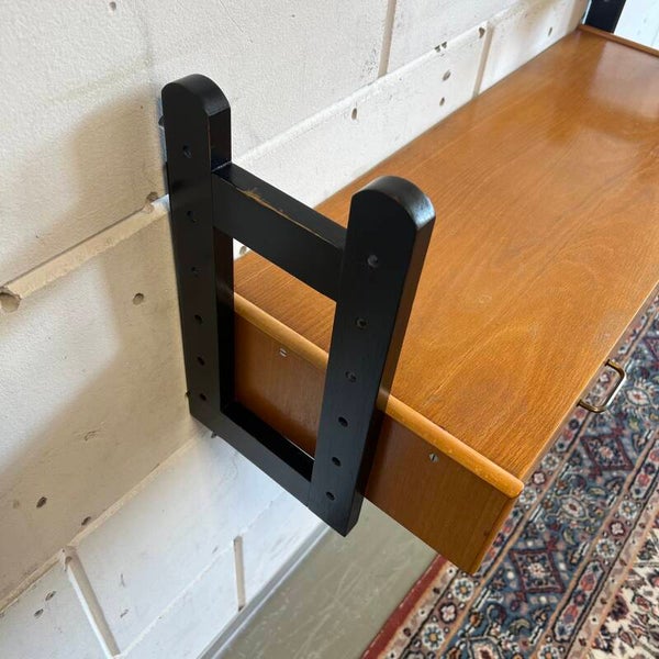 Het bureautje hangt aan weerszijden aan 2 houten dragers (zwart gelakt).