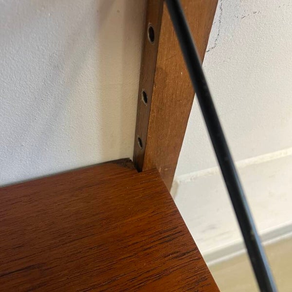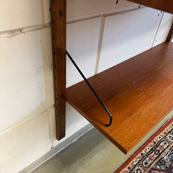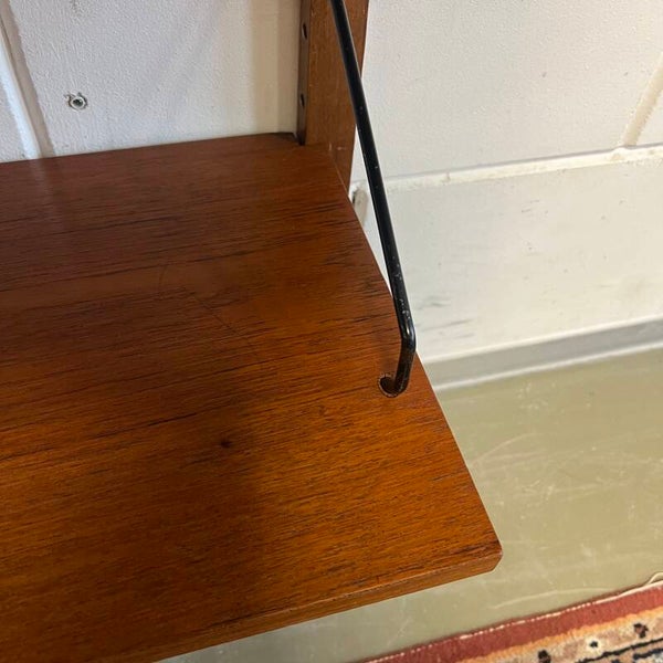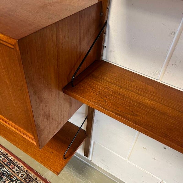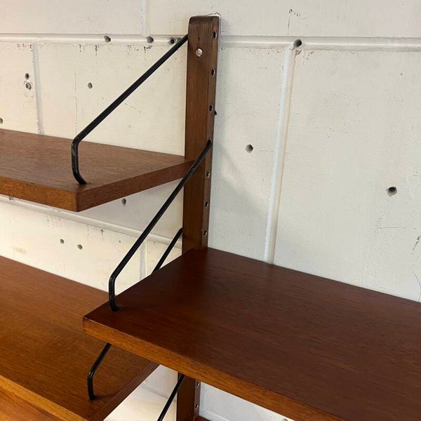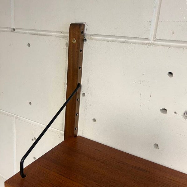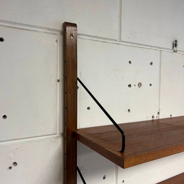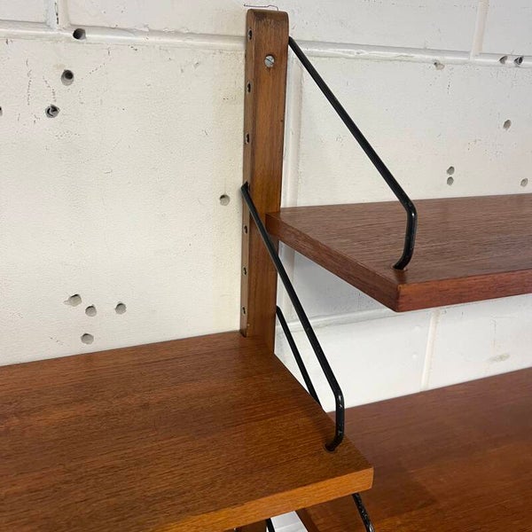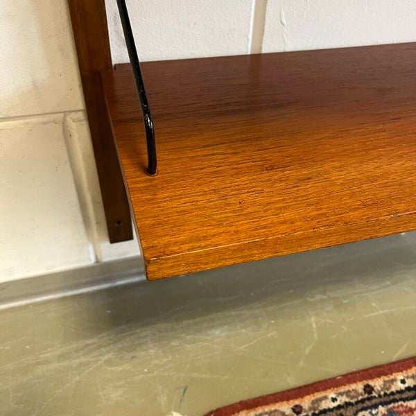 Mooi vintage wandmeubel, wall unit uitgevoerd in teak (fineer) met zwart metalen beugels en houten wandlatten.