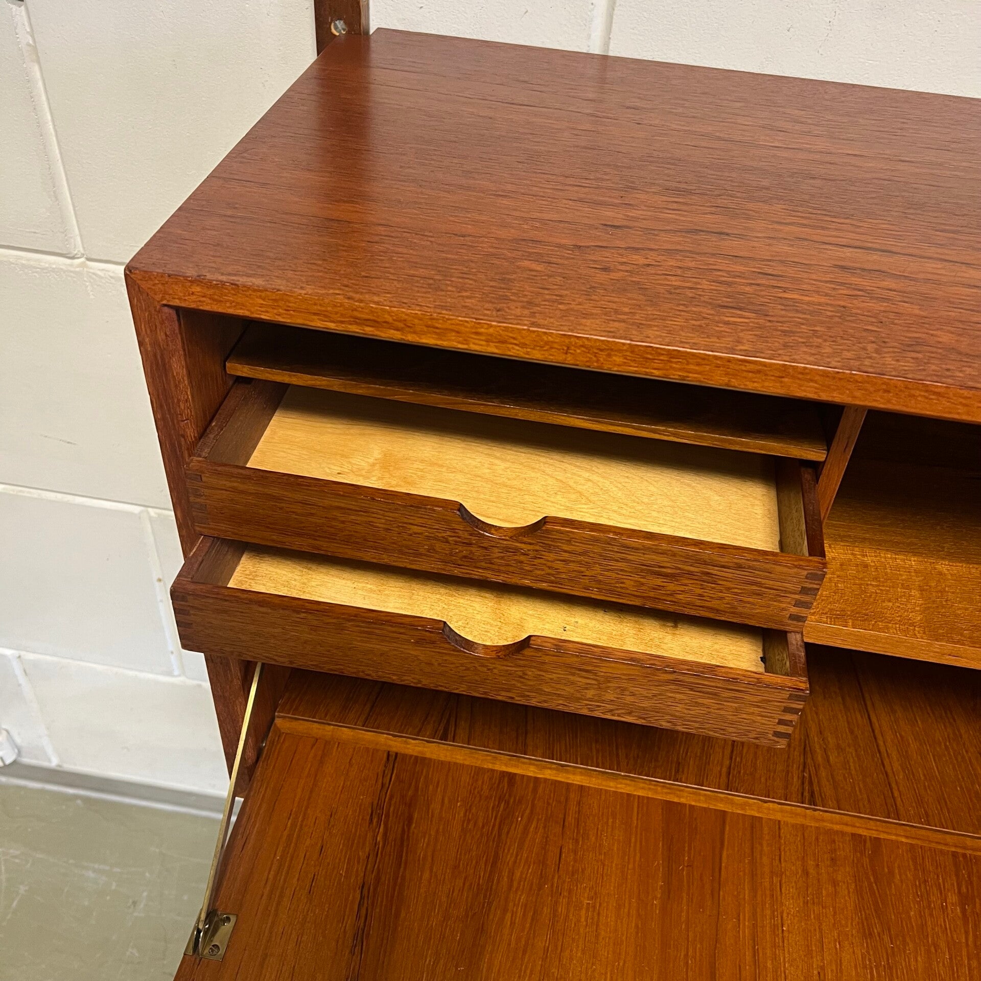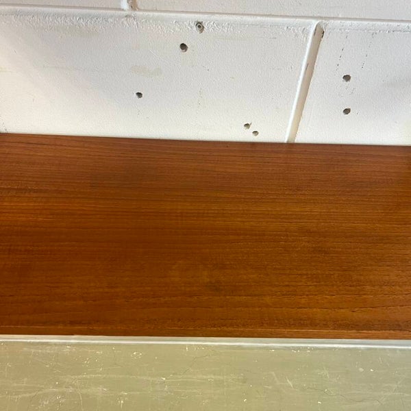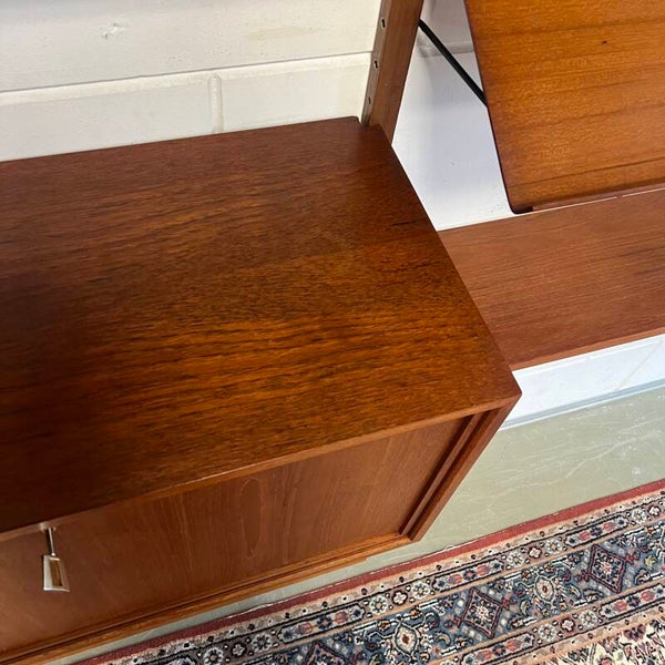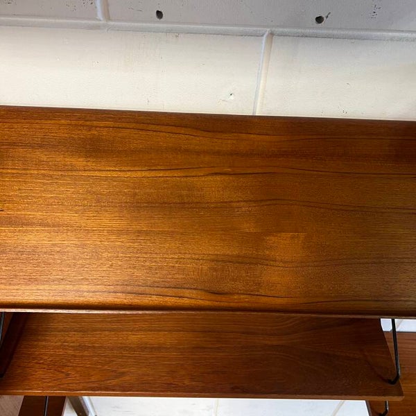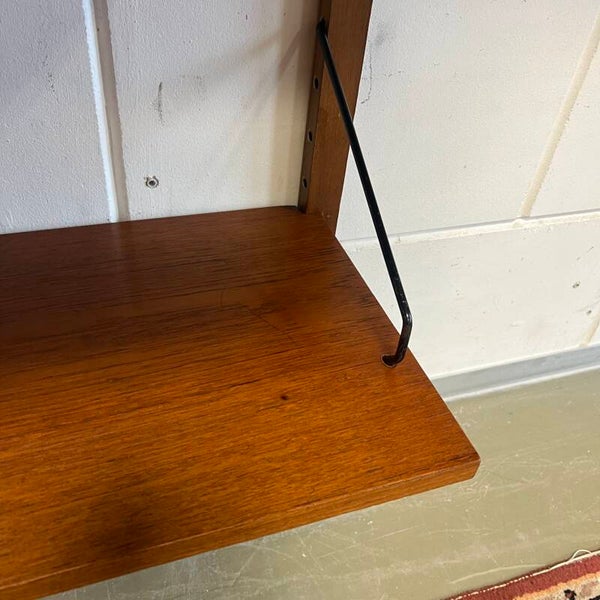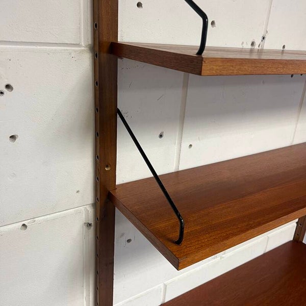Mooi vintage wandmeubel, wall unit uitgevoerd in teak (fineer) met zwart metalen beugels en houten wandlatten.